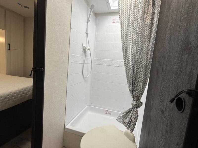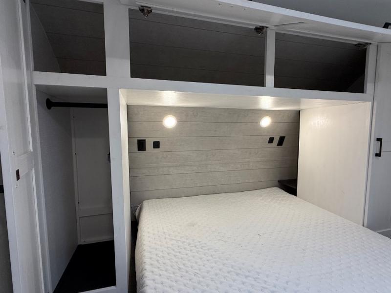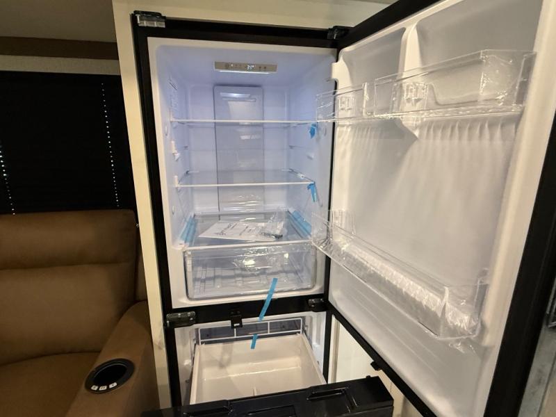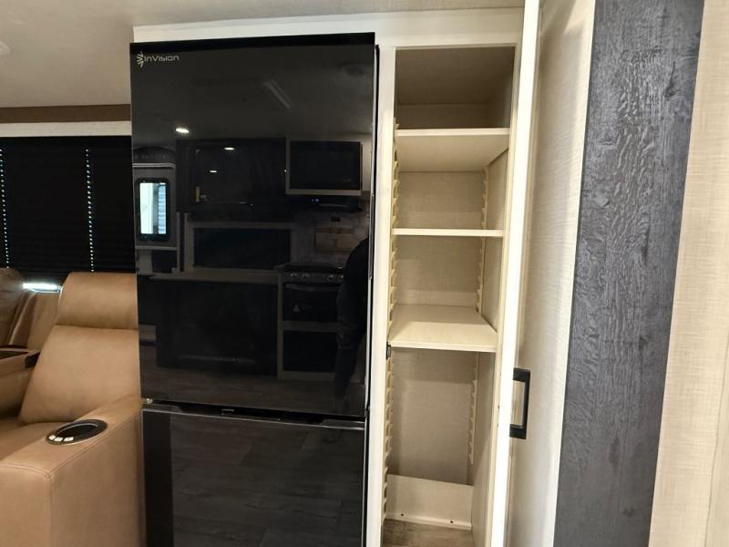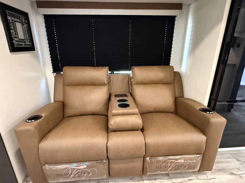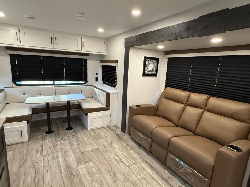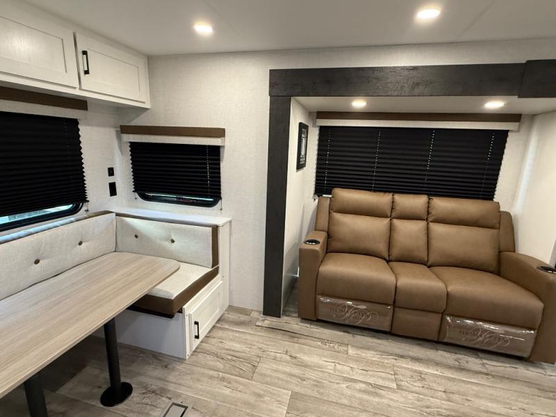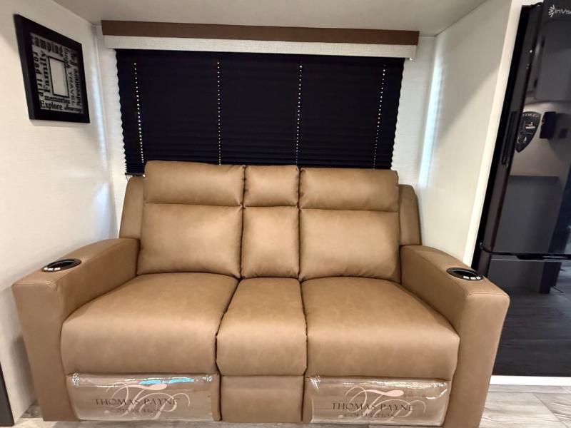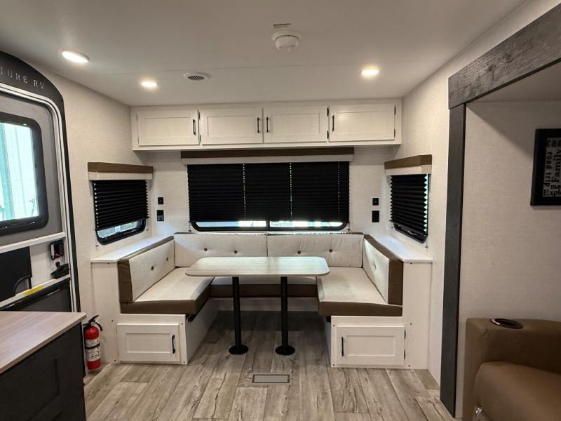 This fantastic trailer is packed with features that will make your travels comfortable, convenient, and unforgettable. In its luxurious interior you will find the U-shaped dinette perfect for meals or socializing, while the 70” sofa provides ample space for relaxation. The fireplace adds a cozy touch, creating a warm and inviting atmosphere. For the entertainment and leisure, the 40” TV is perfect for family movie nights or enjoying your favorite shows on the go. The entertainment system is designed to keep you entertained and relaxed. Moving to the kitchen area, the three-burner cooktop and pantry provide everything you need to prepare delicious meals on the go and the 12V refrigerator keeps your food and drinks fresh, ensuring you have everything you need for a comfortable trip. Convenience is found in the amazing walk-through bath offering easy access while the front bedroom is a serene retreat featuring a spacious queen bed, overhead cabinets, and wardrobes. Additional features like the two entry/exit doors provide added flexibility and ease of use, while the exterior awning furnish shade and protection from the elements.