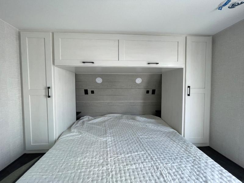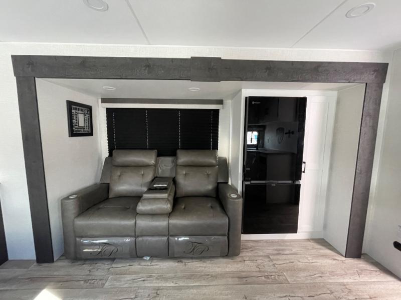 This fantastic trailer is packed with features that will make your travels comfortable, convenient, and unforgettable. In its luxurious interior you will find the U-shaped dinette perfect for meals or socializing, while the 70” sofa provides ample space for relaxation. The fireplace adds a cozy touch, creating a warm and inviting atmosphere. For the entertainment and leisure, the 40” TV is perfect for family movie nights or enjoying your favorite shows on the go. The entertainment system is designed to keep you entertained and relaxed. Moving to the kitchen area, the three-burner cooktop and pantry provide everything you need to prepare delicious meals on the go and the 12V refrigerator keeps your food and drinks fresh, ensuring you have everything you need for a comfortable trip. Convenience is found in the amazing walk-through bath offering easy access while the front bedroom is a serene retreat featuring a spacious queen bed, overhead cabinets, and wardrobes. Additional features like the two entry/exit doors provide added flexibility and ease of use, while the exterior awning furnish shade and protection from the elements.