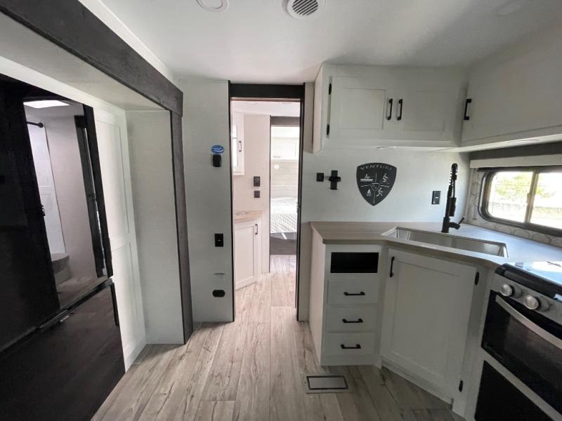 With any Sienna travel trailer by Venture RV, you will enjoy a lightweight unit, convenient amenities, and a durable construction that includes a BAL NXG-bolted frame. There is also a heated and enclosed one-piece underbelly, residential fiberglass insulation, and a reflective PVC roof membrane within the Weather-Shield Package to help extend your camping season. Outside, the BAL 5.0 power stabilizer jacks and power tongue jack will have you set up in no-time, and the Venture RV bottle opener/dog tie down will make it easy to bring your furry friends along. Head inside to enjoy the modern farmhouse design, along with Beauflor throughout with no carpet, custom backsplash, large underbed storage, and a bath skylight to name a few comforts!