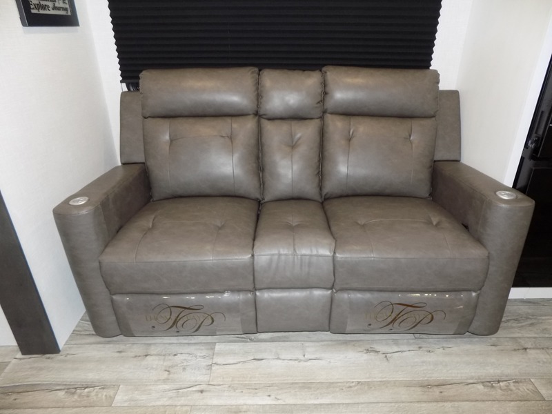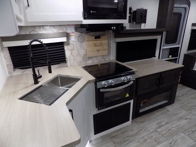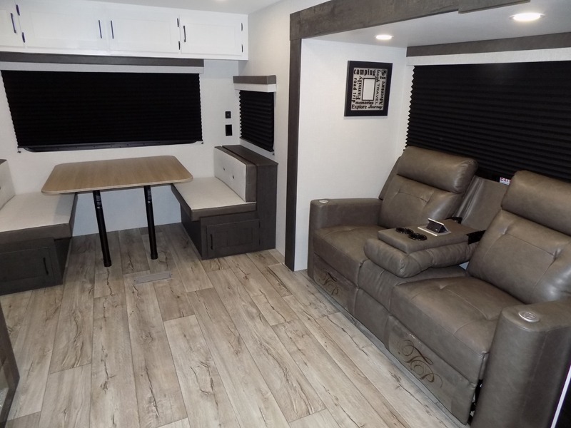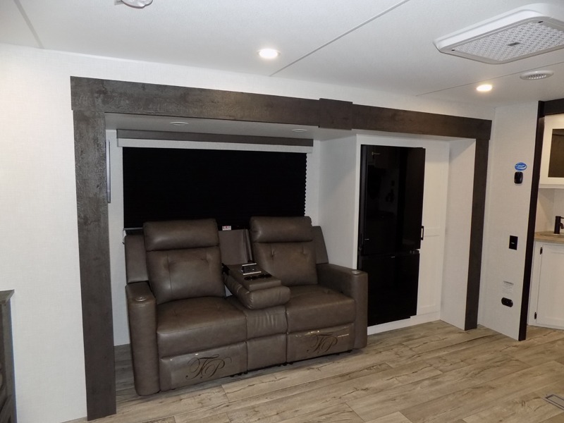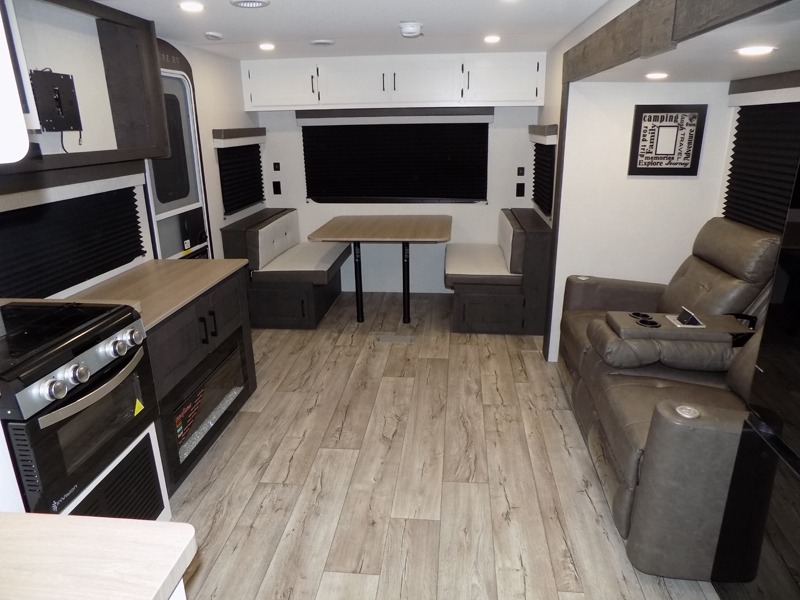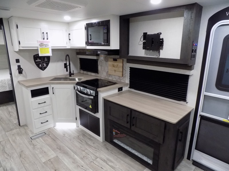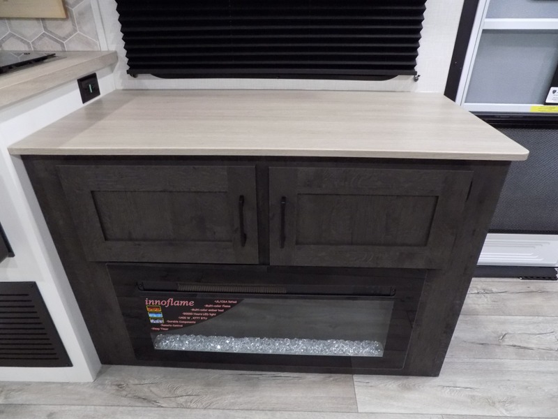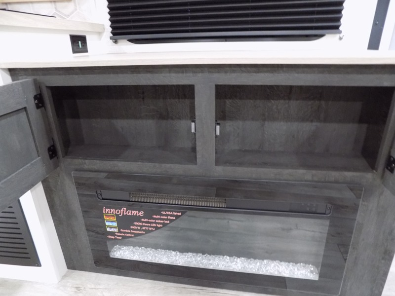 This fantastic trailer is packed with features that will make your travels comfortable, convenient, and unforgettable. In its luxurious interior you will find the U-shaped dinette perfect for meals or socializing, while the 70” sofa provides ample space for relaxation. The fireplace adds a cozy touch, creating a warm and inviting atmosphere. For the entertainment and leisure, the 40” TV is perfect for family movie nights or enjoying your favorite shows on the go. The entertainment system is designed to keep you entertained and relaxed. Moving to the kitchen area, the three-burner cooktop and pantry provide everything you need to prepare delicious meals on the go and the 12V refrigerator keeps your food and drinks fresh, ensuring you have everything you need for a comfortable trip. Convenience is found in the amazing walk-through bath offering easy access while the front bedroom is a serene retreat featuring a spacious queen bed, overhead cabinets, and wardrobes. Additional features like the two entry/exit doors provide added flexibility and ease of use, while the exterior awning furnish shade and protection from the elements.