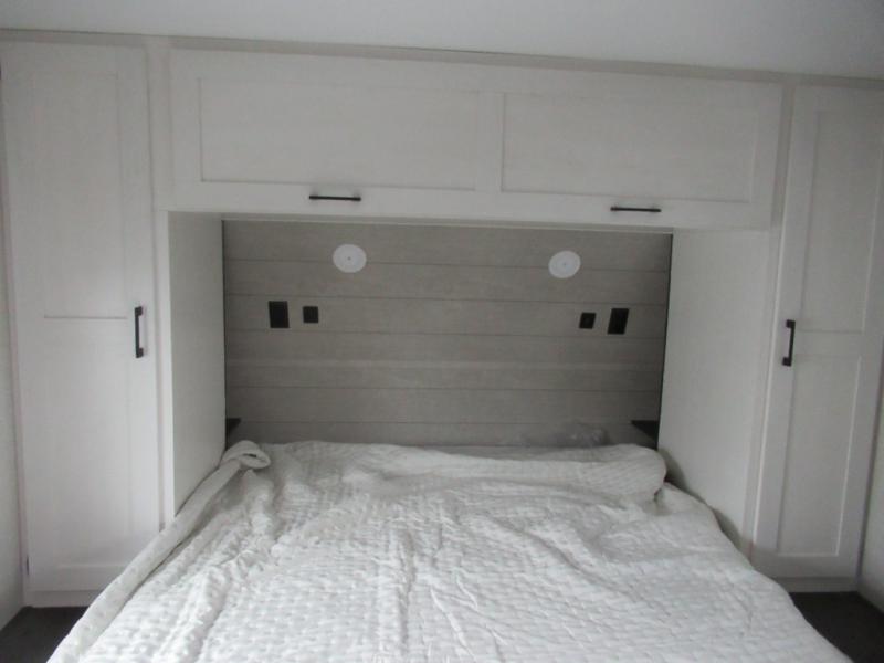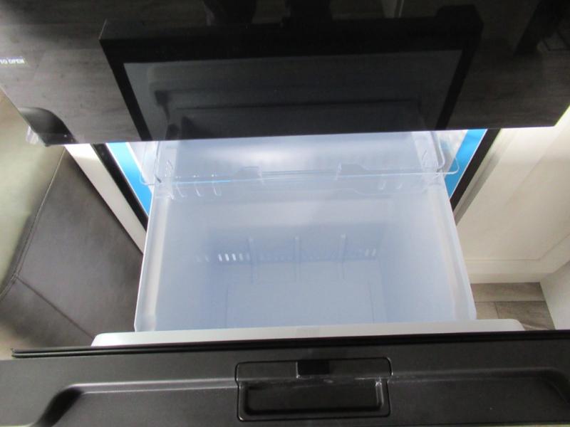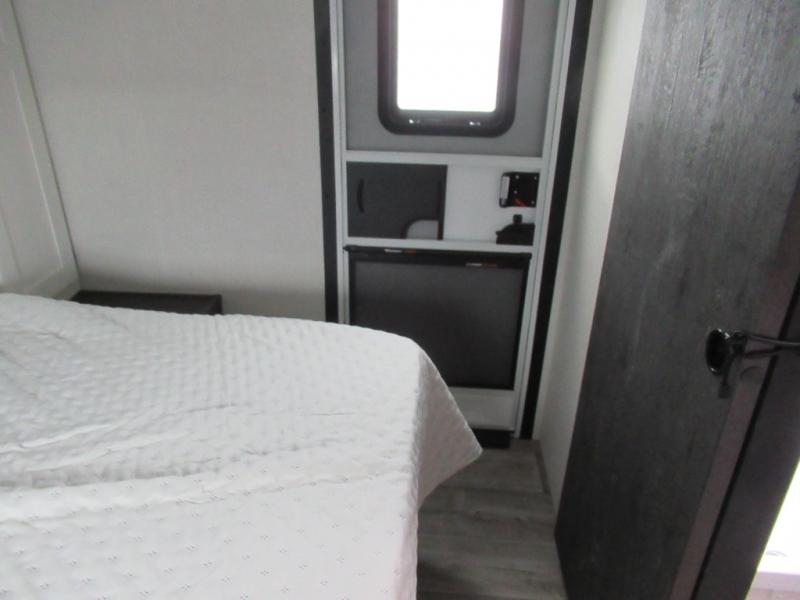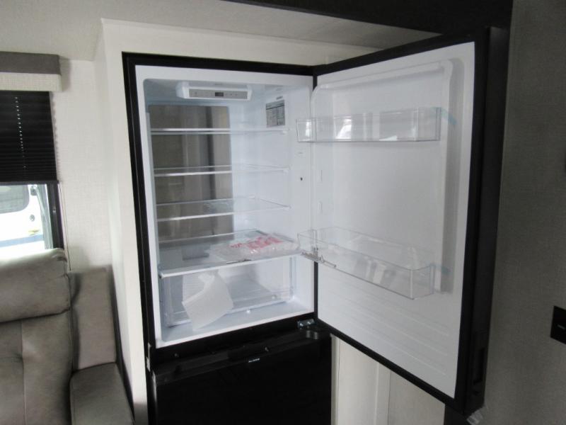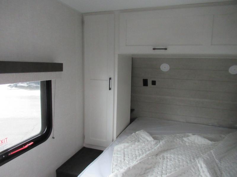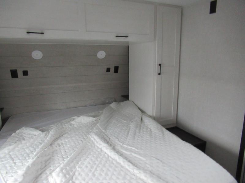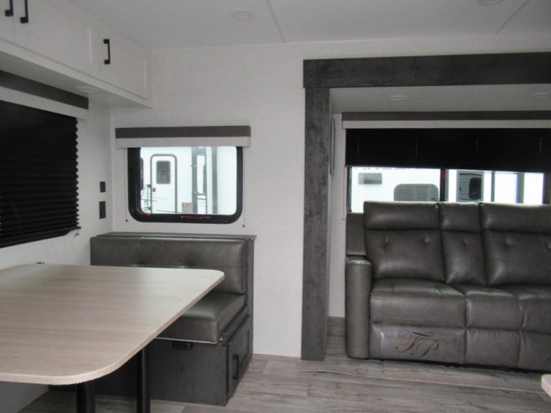 This fantastic trailer is packed with features that will make your travels comfortable, convenient, and unforgettable. In its luxurious interior you will find the U-shaped dinette perfect for meals or socializing, while the 70” sofa provides ample space for relaxation. The fireplace adds a cozy touch, creating a warm and inviting atmosphere. For the entertainment and leisure, the 40” TV is perfect for family movie nights or enjoying your favorite shows on the go. The entertainment system is designed to keep you entertained and relaxed. Moving to the kitchen area, the three-burner cooktop and pantry provide everything you need to prepare delicious meals on the go and the 12V refrigerator keeps your food and drinks fresh, ensuring you have everything you need for a comfortable trip. Convenience is found in the amazing walk-through bath offering easy access while the front bedroom is a serene retreat featuring a spacious queen bed, overhead cabinets, and wardrobes. Additional features like the two entry/exit doors provide added flexibility and ease of use, while the exterior awning furnish shade and protection from the elements.