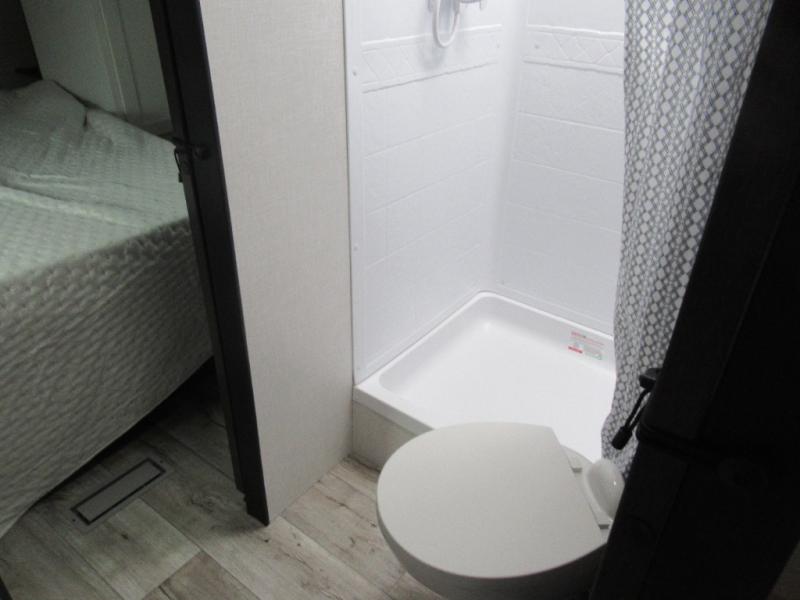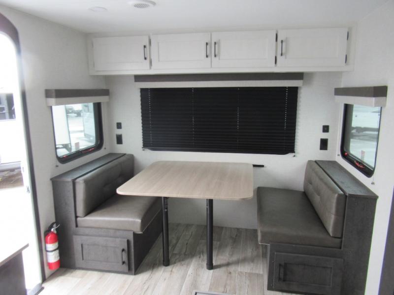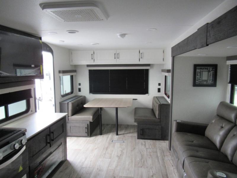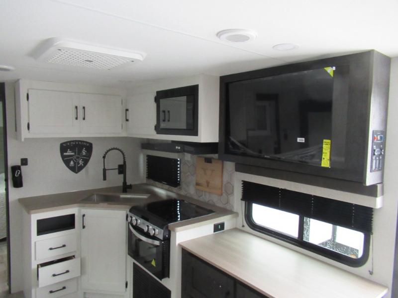 With any Sienna travel trailer by Venture RV, you will enjoy a lightweight unit, convenient amenities, and a durable construction that includes a BAL NXG-bolted frame. There is also a heated and enclosed one-piece underbelly, residential fiberglass insulation, and a reflective PVC roof membrane within the Weather-Shield Package to help extend your camping season. Outside, the BAL 5.0 power stabilizer jacks and power tongue jack will have you set up in no-time, and the Venture RV bottle opener/dog tie down will make it easy to bring your furry friends along. Head inside to enjoy the modern farmhouse design, along with Beauflor throughout with no carpet, custom backsplash, large underbed storage, and a bath skylight to name a few comforts!