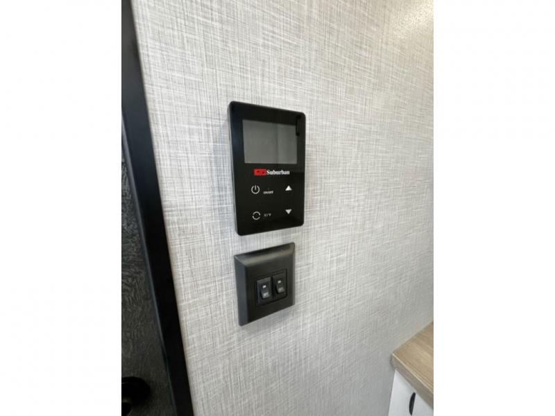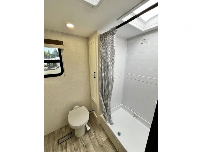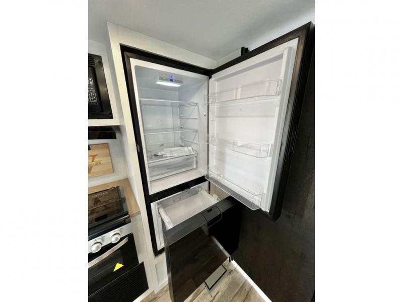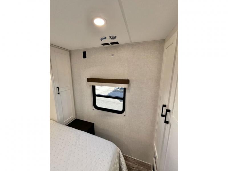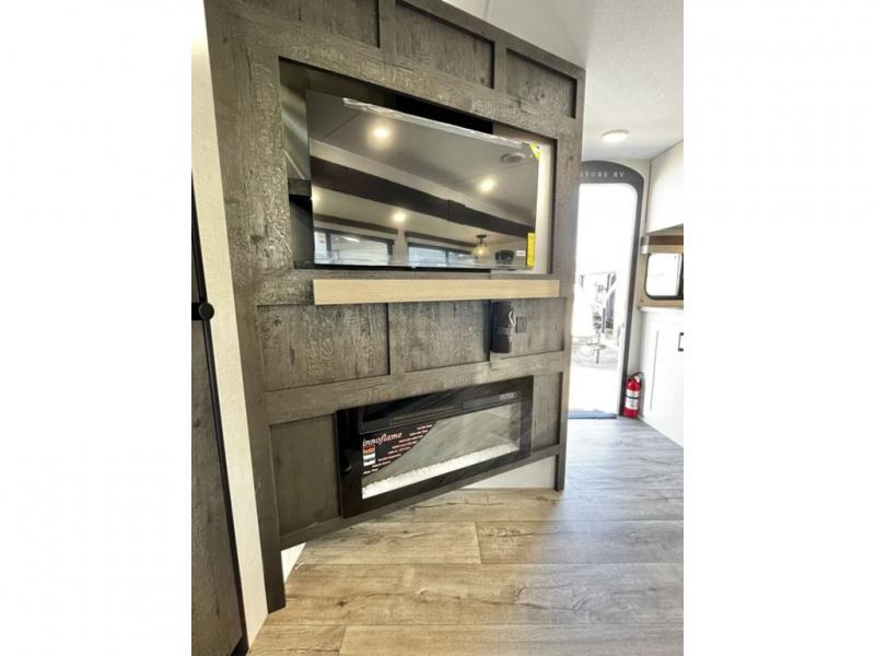 You will be enchanted by this travel trailer features! Starting with the rear bathroom which offers a convenient linen closet, keeping your essentials within reach. Moving forward to the kitchen area, the sit n’ slide booth dinette is a fun and functional spot for meals or socializing, also the kitchen is well-equipped with a 10 cu refrigerator, three-burner cooktop, and pantry, making you feel right at home. For the entertainment and leisure, the sofa provides a comfortable spot to relax, and the fireplace adds a cozy touch to the interior plus, the 40” TV is perfect for family movie nights or enjoying your favorite shows on the go. The front bedroom offers a spacious queen bed, overhead cabinet, and wardrobe. The exterior awning provides shade and protection from the elements, while the pass-through storage will provide ample space for your outdoor gear and equipment.
