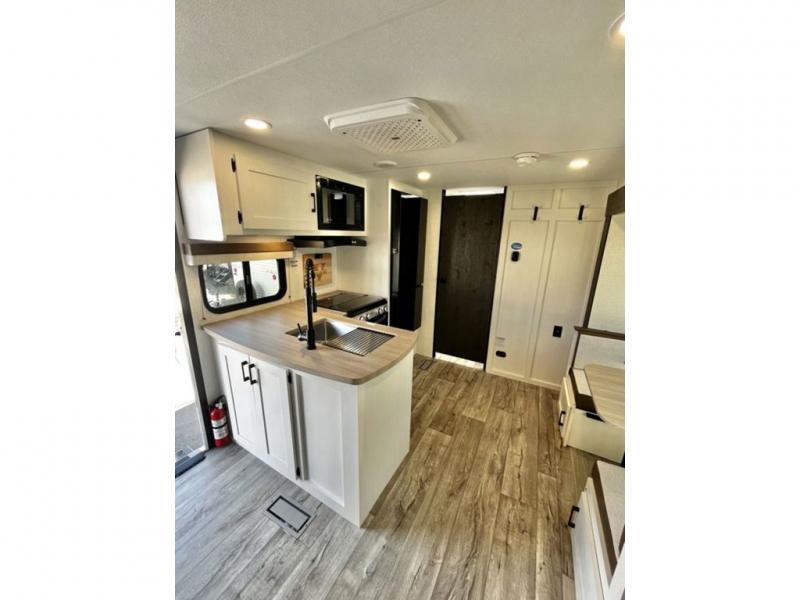 With any Sienna travel trailer by Venture RV, you will enjoy a lightweight unit, convenient amenities, and a durable construction that includes a BAL NXG-bolted frame. There is also a heated and enclosed one-piece underbelly, residential fiberglass insulation, and a reflective PVC roof membrane within the Weather-Shield Package to help extend your camping season. Outside, the BAL 5.0 power stabilizer jacks and power tongue jack will have you set up in no-time, and the Venture RV bottle opener/dog tie down will make it easy to bring your furry friends along. Head inside to enjoy the modern farmhouse design, along with Beauflor throughout with no carpet, custom backsplash, large underbed storage, and a bath skylight to name a few comforts!