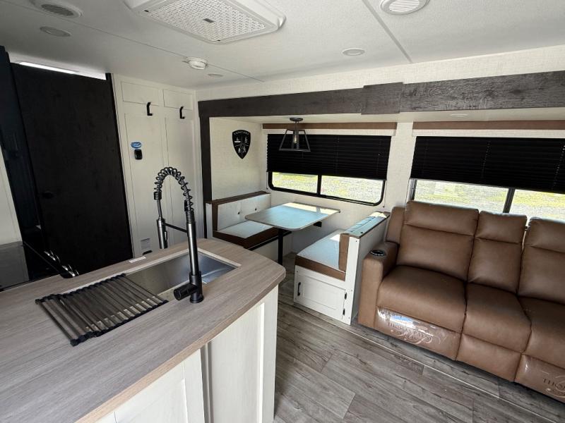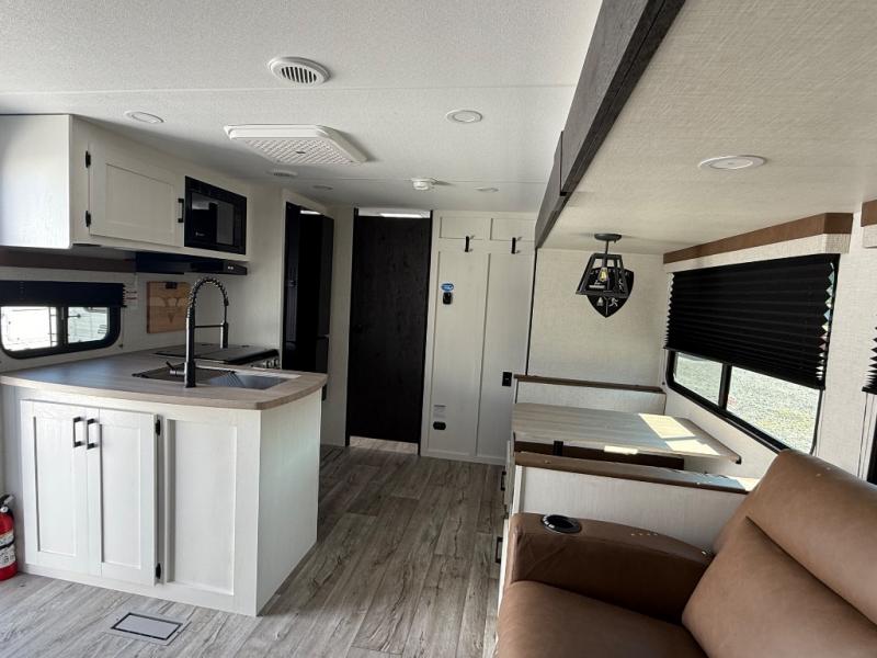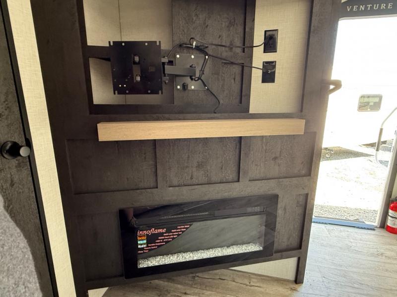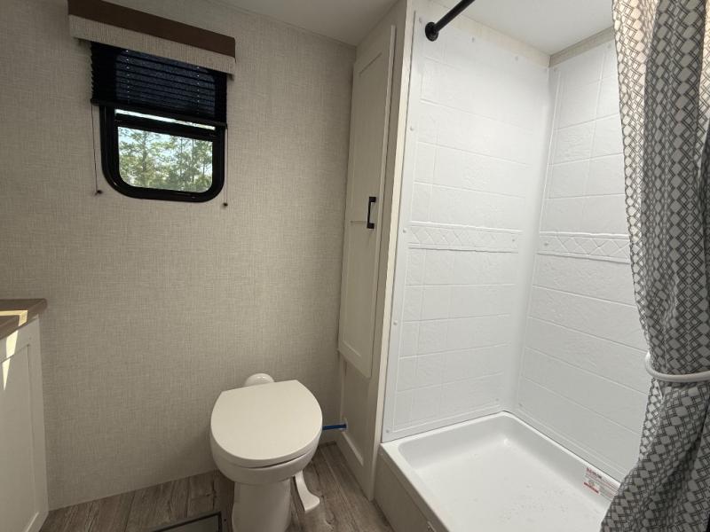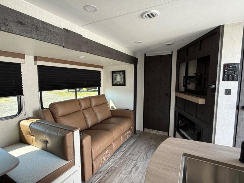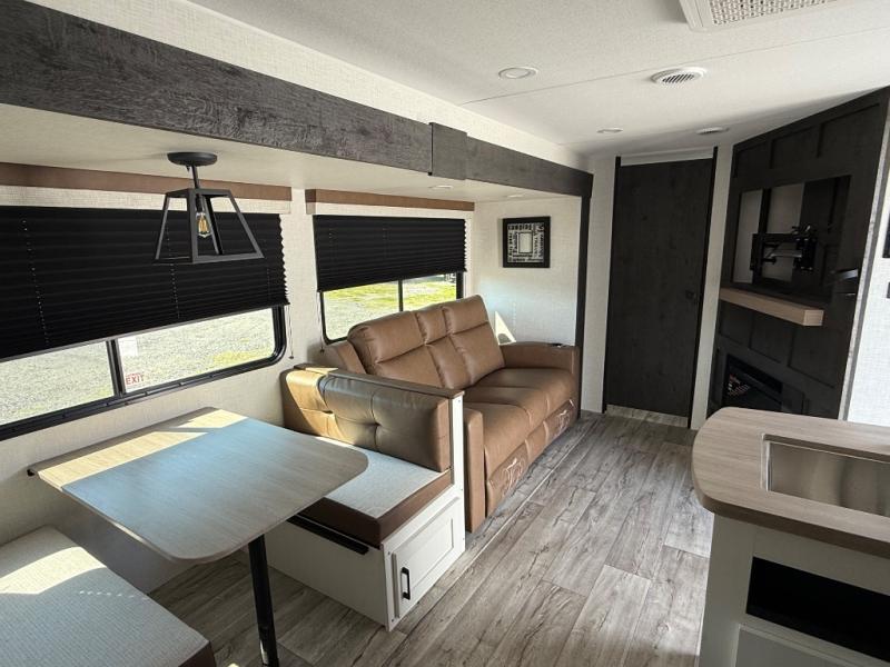 You will be enchanted by this travel trailer features! Starting with the rear bathroom which offers a convenient linen closet, keeping your essentials within reach. Moving forward to the kitchen area, the sit n’ slide booth-dinette is a fun and functional spot for meals or socializing, also the kitchen is well-equipped with a 10-cu refrigerator, three-burner cooktop, and pantry, making you feel right at home. For the entertainment and leisure, the sofa provides a comfortable spot to relax, and the fireplace adds a cozy touch to the interior plus, the 40” TV is perfect for family movie nights or enjoying your favorite shows on the go. The front bedroom offers a spacious queen bed, overhead cabinet, and wardrobe. The exterior awning provides shade and protection from the elements, while the pass-through storage will provide ample space for your outdoor gear and equipment.
