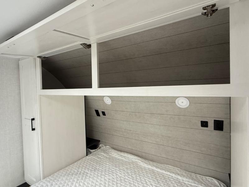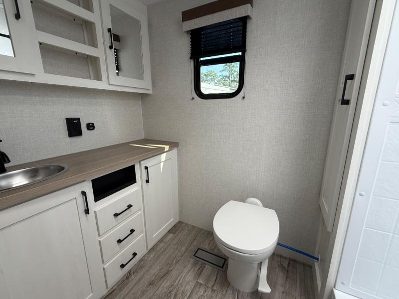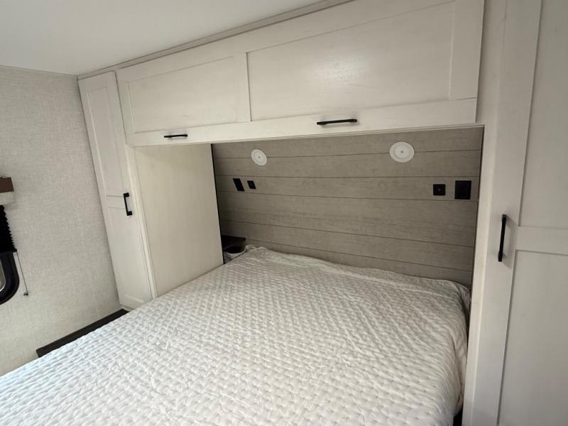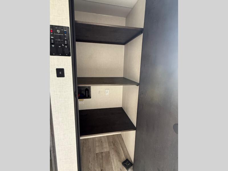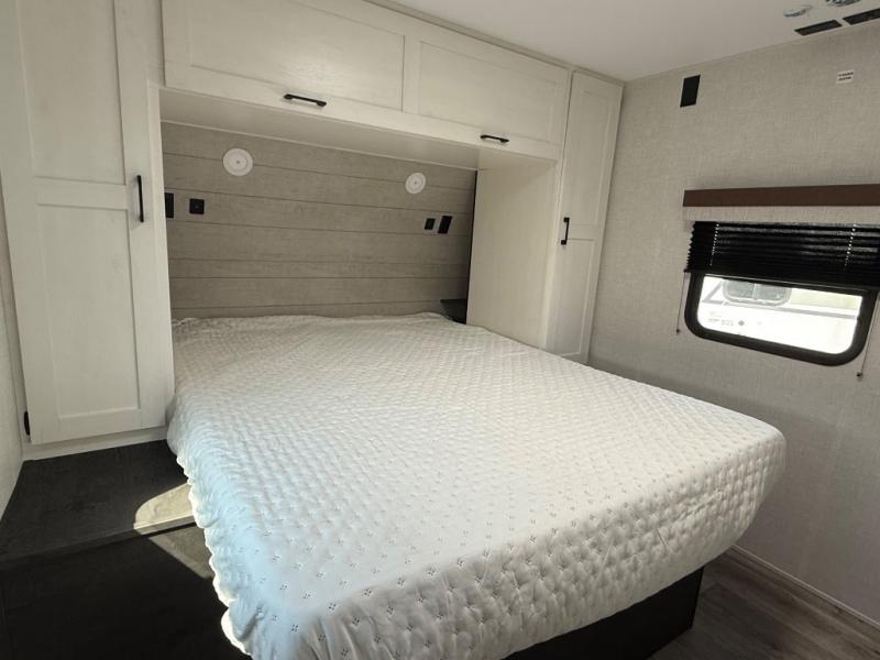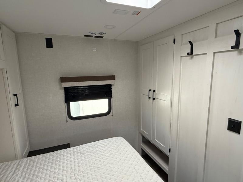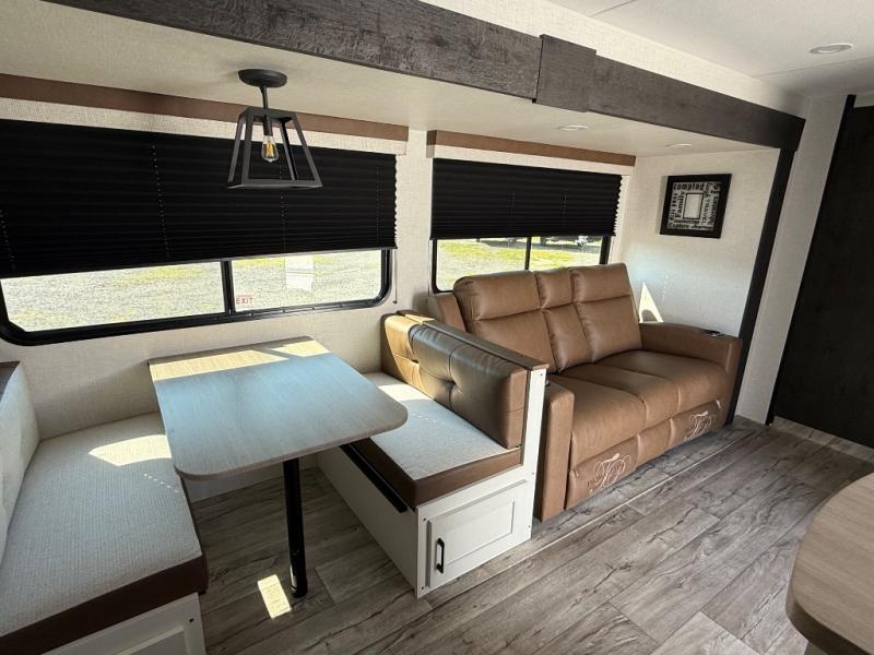 You will be enchanted by this travel trailer features! Starting with the rear bathroom which offers a convenient linen closet, keeping your essentials within reach. Moving forward to the kitchen area, the sit n’ slide booth-dinette is a fun and functional spot for meals or socializing, also the kitchen is well-equipped with a 10-cu refrigerator, three-burner cooktop, and pantry, making you feel right at home. For the entertainment and leisure, the sofa provides a comfortable spot to relax, and the fireplace adds a cozy touch to the interior plus, the 40” TV is perfect for family movie nights or enjoying your favorite shows on the go. The front bedroom offers a spacious queen bed, overhead cabinet, and wardrobe. The exterior awning provides shade and protection from the elements, while the pass-through storage will provide ample space for your outdoor gear and equipment.