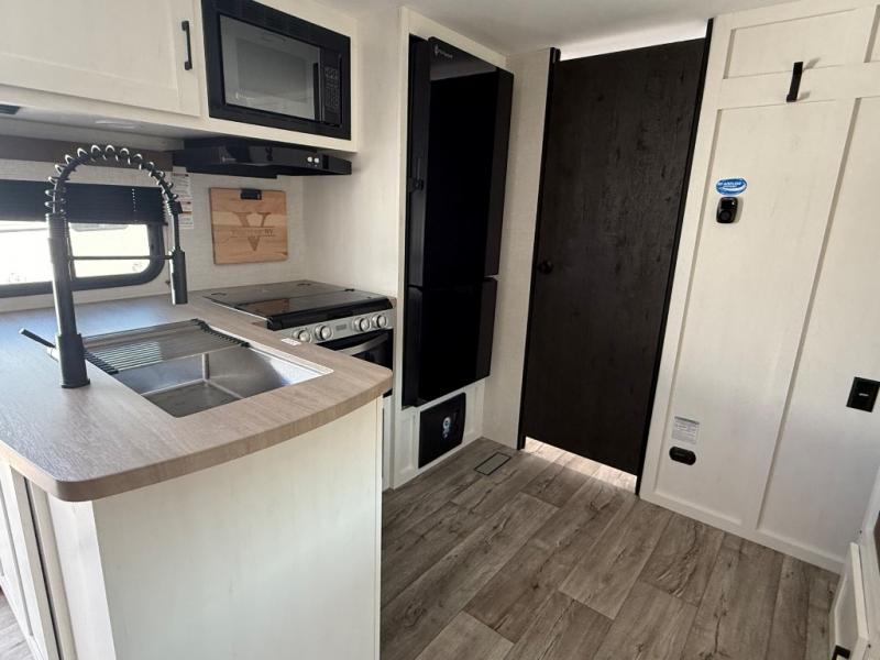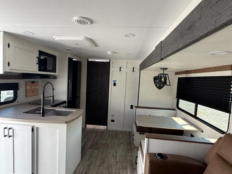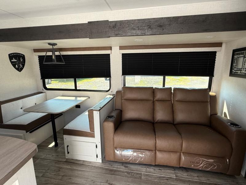 With any Sienna travel trailer by Venture RV, you will enjoy a lightweight unit, convenient amenities, and a durable construction that includes a BAL NXG-bolted frame. There is also a heated and enclosed one-piece underbelly, residential fiberglass insulation, and a reflective PVC roof membrane within the Weather-Shield Package to help extend your camping season. Outside, the BAL 5.0 power stabilizer jacks and power tongue jack will have you set up in no-time, and the Venture RV bottle opener/dog tie down will make it easy to bring your furry friends along. Head inside to enjoy the modern farmhouse design, along with Beauflor throughout with no carpet, custom backsplash, large underbed storage, and a bath skylight to name a few comforts!