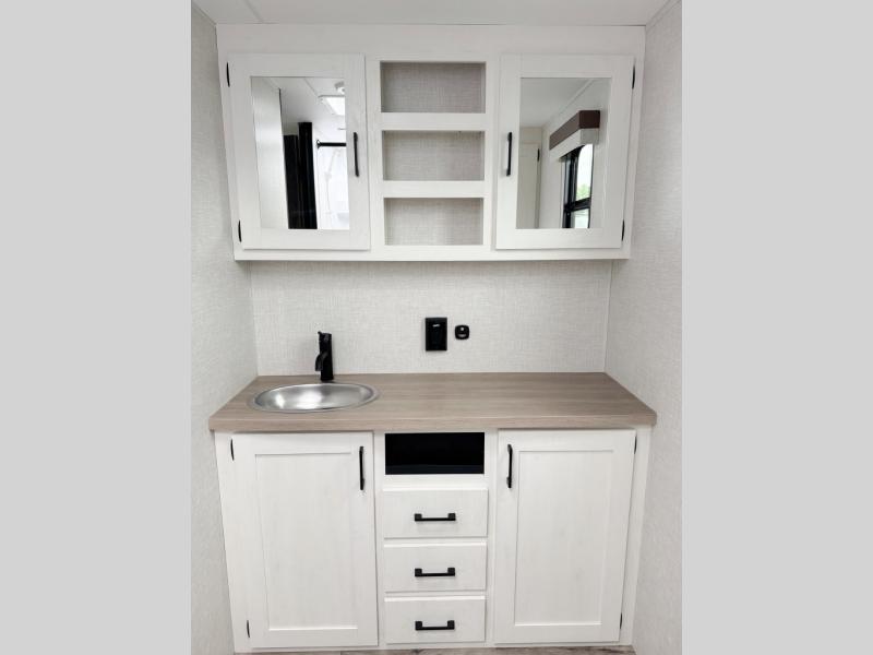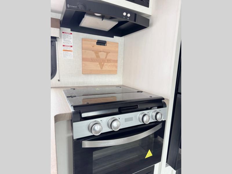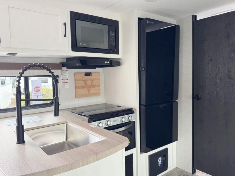 With any Sienna travel trailer by Venture RV, you will enjoy a lightweight unit, convenient amenities, and a durable construction that includes a BAL NXG-bolted frame. There is also a heated and enclosed one-piece underbelly, residential fiberglass insulation, and a reflective PVC roof membrane within the Weather-Shield Package to help extend your camping season. Outside, the BAL 5.0 power stabilizer jacks and power tongue jack will have you set up in no-time, and the Venture RV bottle opener/dog tie down will make it easy to bring your furry friends along. Head inside to enjoy the modern farmhouse design, along with Beauflor throughout with no carpet, custom backsplash, large underbed storage, and a bath skylight to name a few comforts!