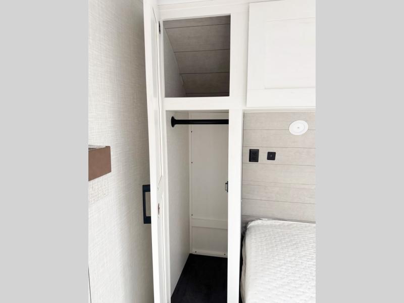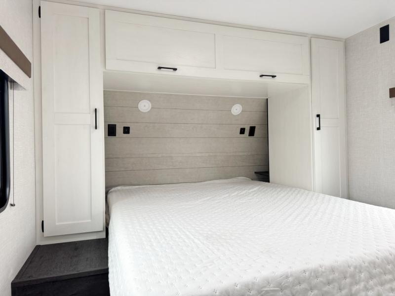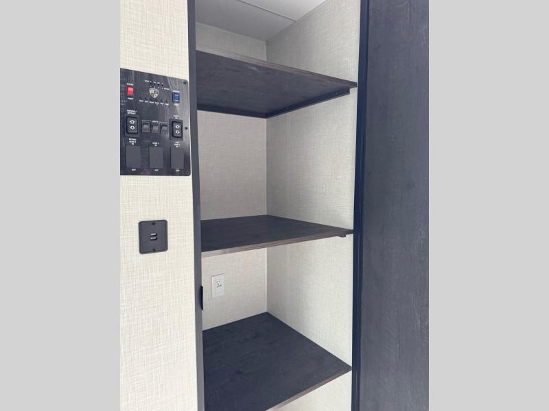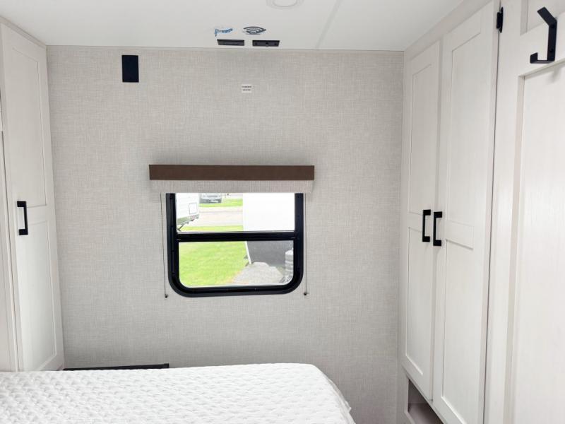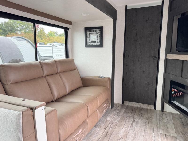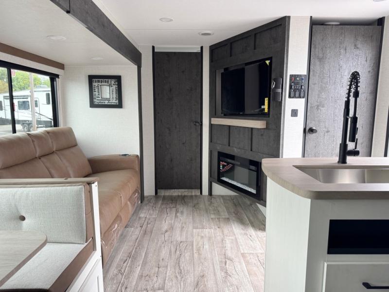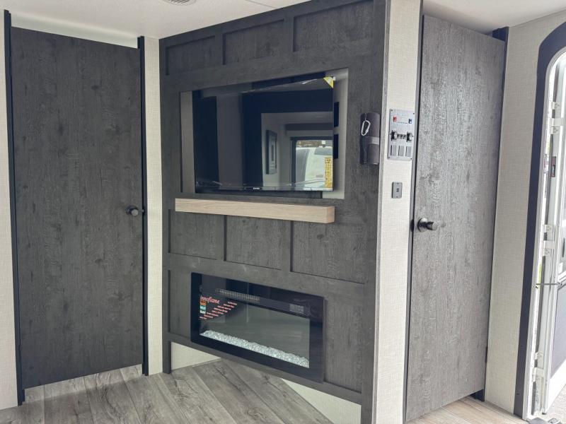 You will be enchanted by this travel trailer features! Starting with the rear bathroom which offers a convenient linen closet, keeping your essentials within reach. Moving forward to the kitchen area, the sit n’ slide booth dinette is a fun and functional spot for meals or socializing, also the kitchen is well-equipped with a 10 cu refrigerator, three-burner cooktop, and pantry, making you feel right at home. For the entertainment and leisure, the sofa provides a comfortable spot to relax, and the fireplace adds a cozy touch to the interior plus, the 40” TV is perfect for family movie nights or enjoying your favorite shows on the go. The front bedroom offers a spacious queen bed, overhead cabinet, and wardrobe. The exterior awning provides shade and protection from the elements, while the pass-through storage will provide ample space for your outdoor gear and equipment.