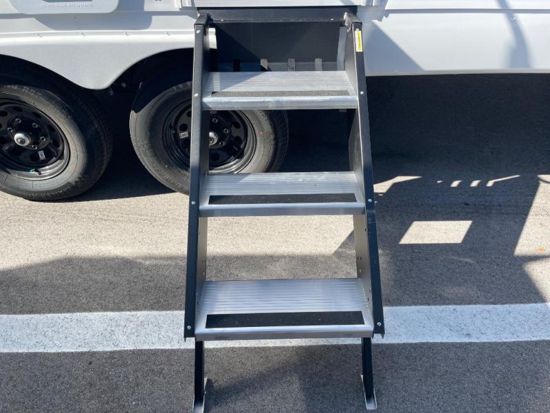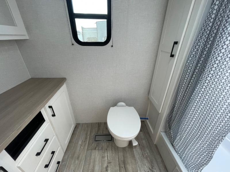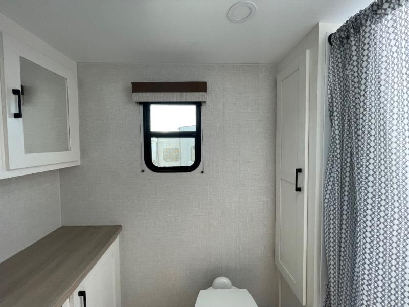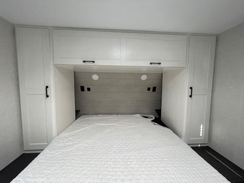 You will be enchanted by this travel trailer features! Starting with the rear bathroom which offers a convenient linen closet, keeping your essentials within reach. Moving forward to the kitchen area, the sit n’ slide booth dinette is a fun and functional spot for meals or socializing, also the kitchen is well-equipped with a 10 cu refrigerator, three-burner cooktop, and pantry, making you feel right at home. For the entertainment and leisure, the sofa provides a comfortable spot to relax, and the fireplace adds a cozy touch to the interior plus, the 40” TV is perfect for family movie nights or enjoying your favorite shows on the go. The front bedroom offers a spacious queen bed, overhead cabinet, and wardrobe. The exterior awning provides shade and protection from the elements, while the pass-through storage will provide ample space for your outdoor gear and equipment.