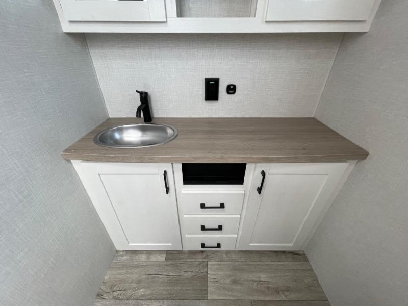 With any Sienna travel trailer by Venture RV, you will enjoy a lightweight unit, convenient amenities, and a durable construction that includes a BAL NXG-bolted frame. There is also a heated and enclosed one-piece underbelly, residential fiberglass insulation, and a reflective PVC roof membrane within the Weather-Shield Package to help extend your camping season. Outside, the BAL 5.0 power stabilizer jacks and power tongue jack will have you set up in no-time, and the Venture RV bottle opener/dog tie down will make it easy to bring your furry friends along. Head inside to enjoy the modern farmhouse design, along with Beauflor throughout with no carpet, custom backsplash, large underbed storage, and a bath skylight to name a few comforts!