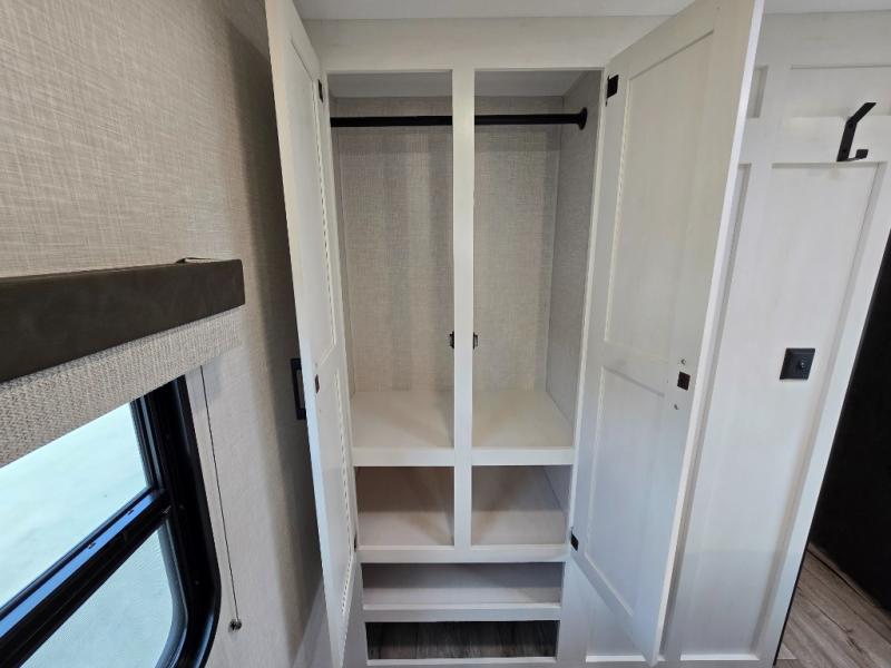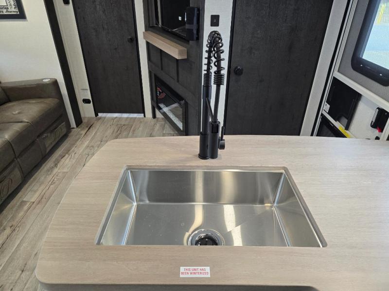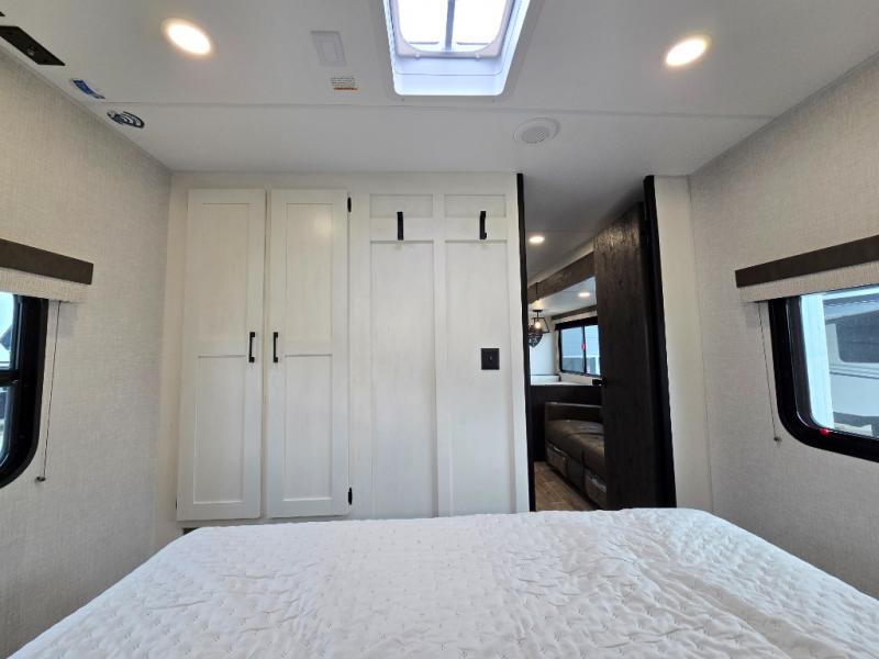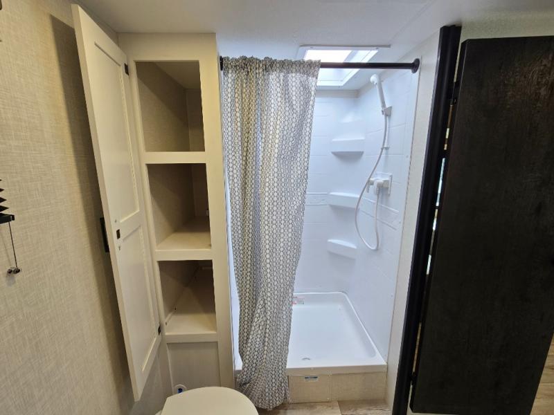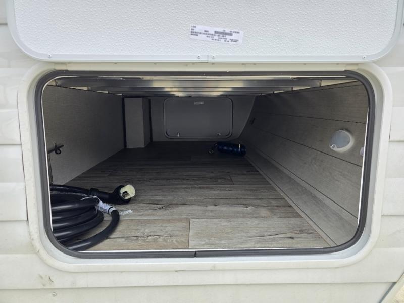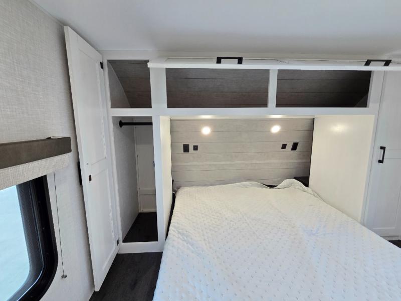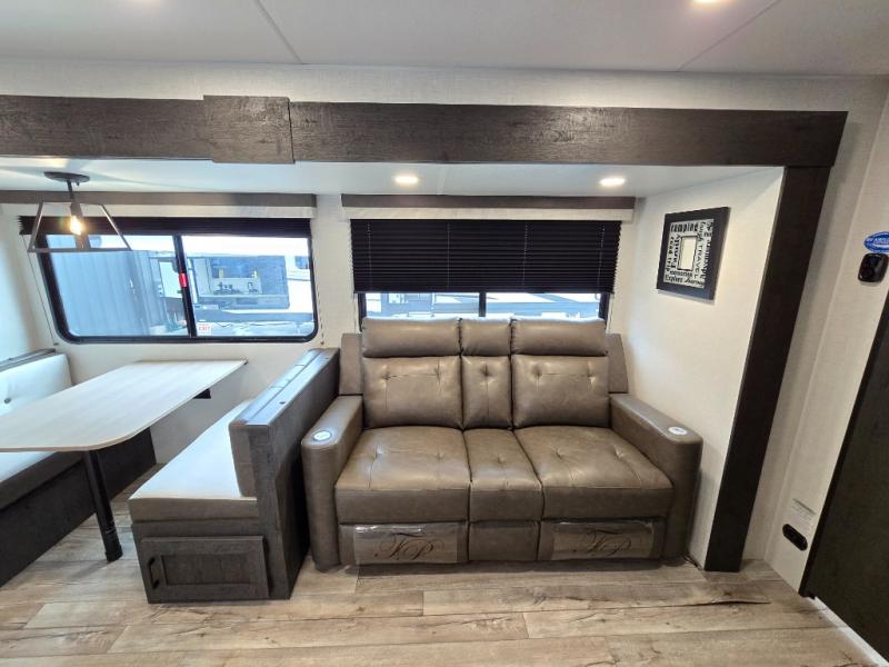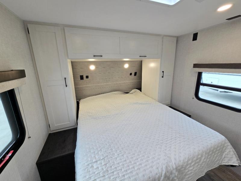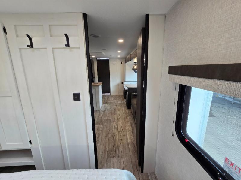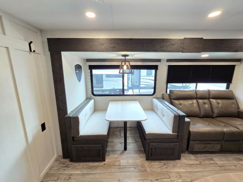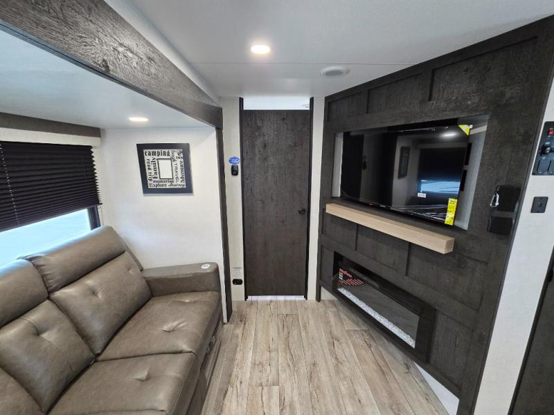You will be enchanted by this travel trailer features! Starting with the rear bathroom which offers a convenient linen closet, keeping your essentials within reach. Moving forward to the kitchen area, the sit n’ slide booth dinette is a fun and functional spot for meals or socializing, also the kitchen is well-equipped with a 10 cu refrigerator, three-burner cooktop, and pantry, making you feel right at home. For the entertainment and leisure, the sofa provides a comfortable spot to relax, and the fireplace adds a cozy touch to the interior plus, the 40” TV is perfect for family movie nights or enjoying your favorite shows on the go. The front bedroom offers a spacious queen bed, overhead cabinet, and wardrobe. The exterior awning provides shade and protection from the elements, while the pass-through storage will provide ample space for your outdoor gear and equipment.
