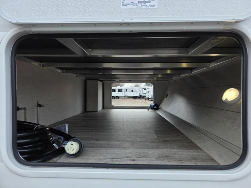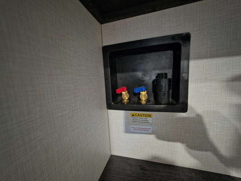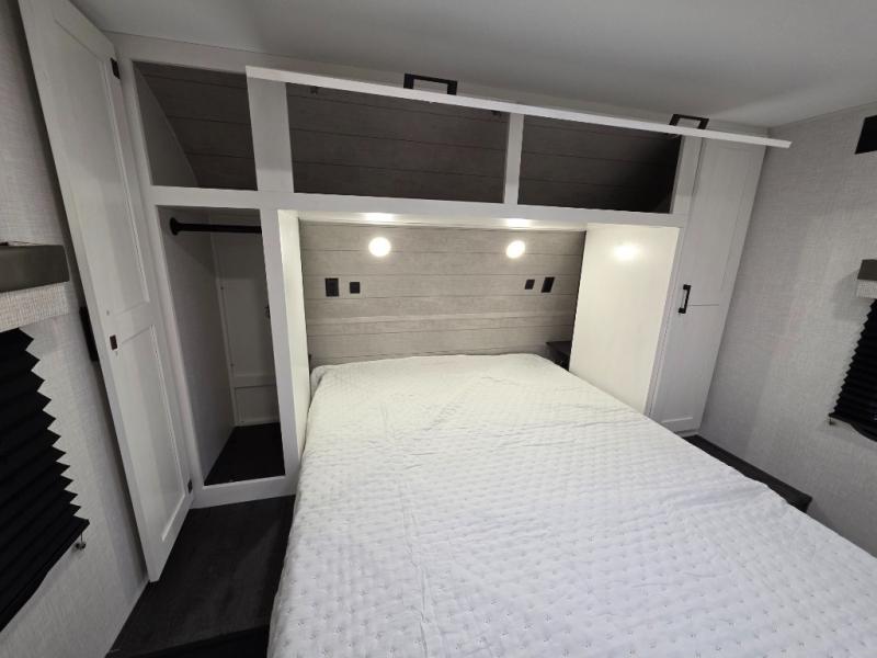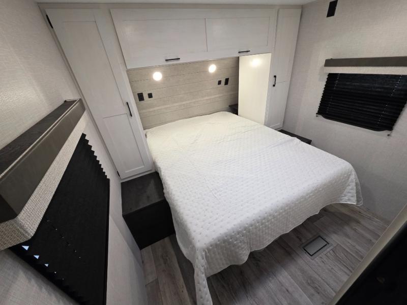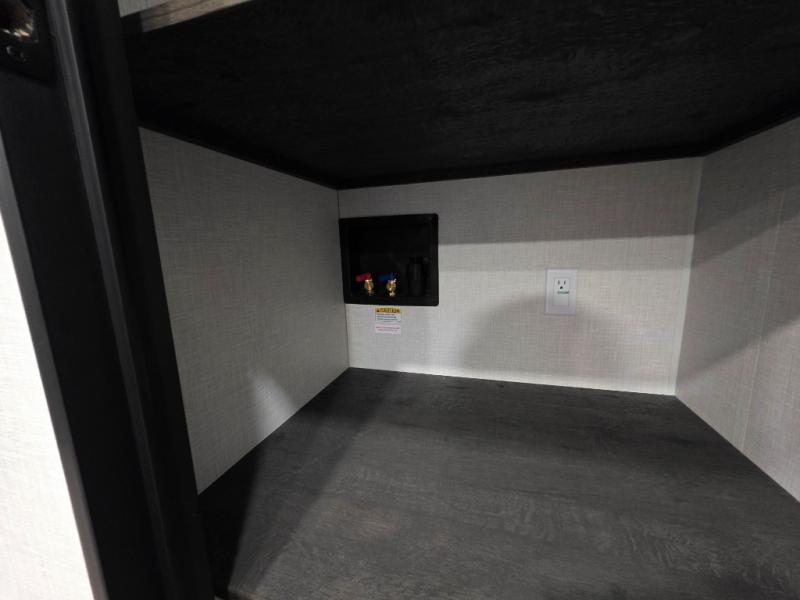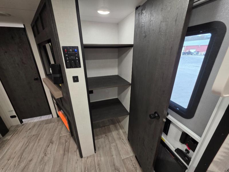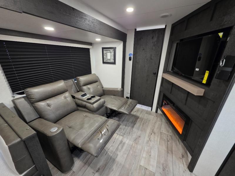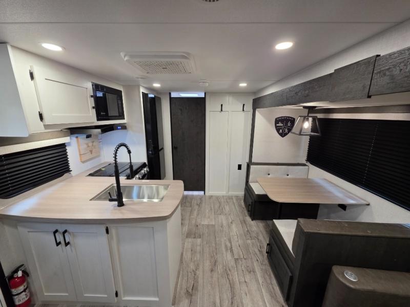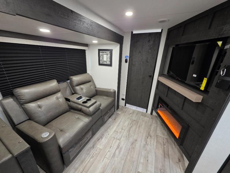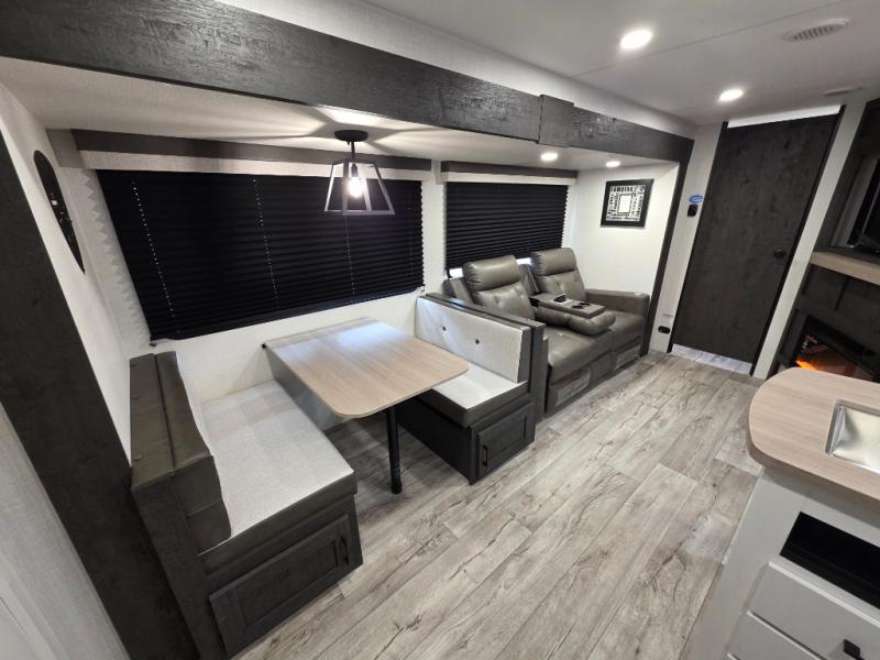 You will be enchanted by this travel trailer features! Starting with the rear bathroom which offers a convenient linen closet, keeping your essentials within reach. Moving forward to the kitchen area, the sit n’ slide booth dinette is a fun and functional spot for meals or socializing, also the kitchen is well-equipped with a 10 cu refrigerator, three-burner cooktop, and pantry, making you feel right at home. For the entertainment and leisure, the sofa provides a comfortable spot to relax, and the fireplace adds a cozy touch to the interior plus, the 40” TV is perfect for family movie nights or enjoying your favorite shows on the go. The front bedroom offers a spacious queen bed, overhead cabinet, and wardrobe. The exterior awning provides shade and protection from the elements, while the pass-through storage will provide ample space for your outdoor gear and equipment.