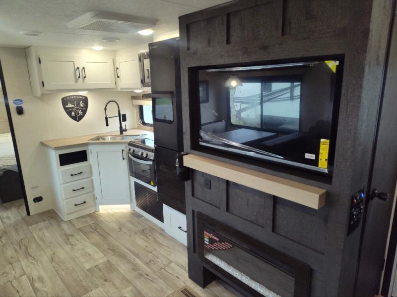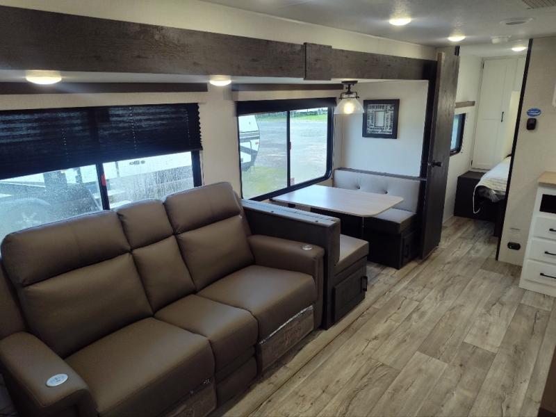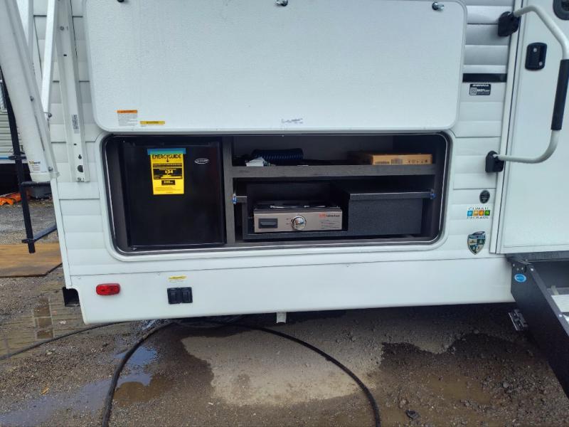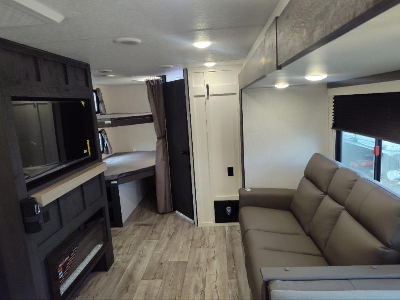 You'll love every minute spent in this bunkhouse travel trailer. The front private bedroom includes a Sleep Tight queen bed, dual wardrobes, and TV prep if you want the option to watch movies in bed. Your crew can relax on the sofa or Sit N' Slide table within the large slide out and watch a movie with the Smart TV. Since there is a outdoor griddle and refrigerator plus a 20' power awning, you may just find yourselves outside most days! When it's time to call it a night, there are double-size bunks in the rear corner for your guests, and the full bath is right next to the bunks for easy nighttime use. This unit also includes an entryway pantry with washer and dryer prep, making it easier to go full-time if you choose!