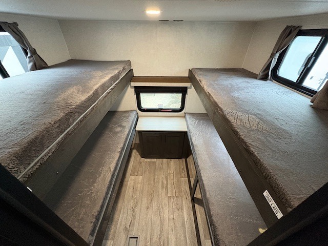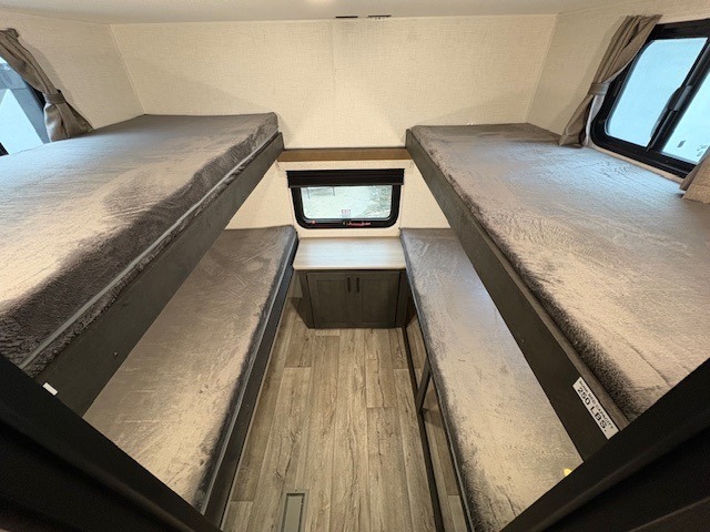 You'll love every minute spent in this spacious travel trailer with a rear private bunkhouse. There are two sets of bunk beds here, and the bottom bunks convert into a king-size bed, giving you options how you want to set up this space. The front private bedroom includes a Sleep Tight queen bed, dual wardrobes, and sliding doors that will help save on space. Your crew can relax on the 70" sofa or Sit N' Slide table within the large slide out and watch a movie with the Smart TV. Since there is an outdoor griddle and refrigerator plus a 20' power awning, you may just find yourselves outside most days!