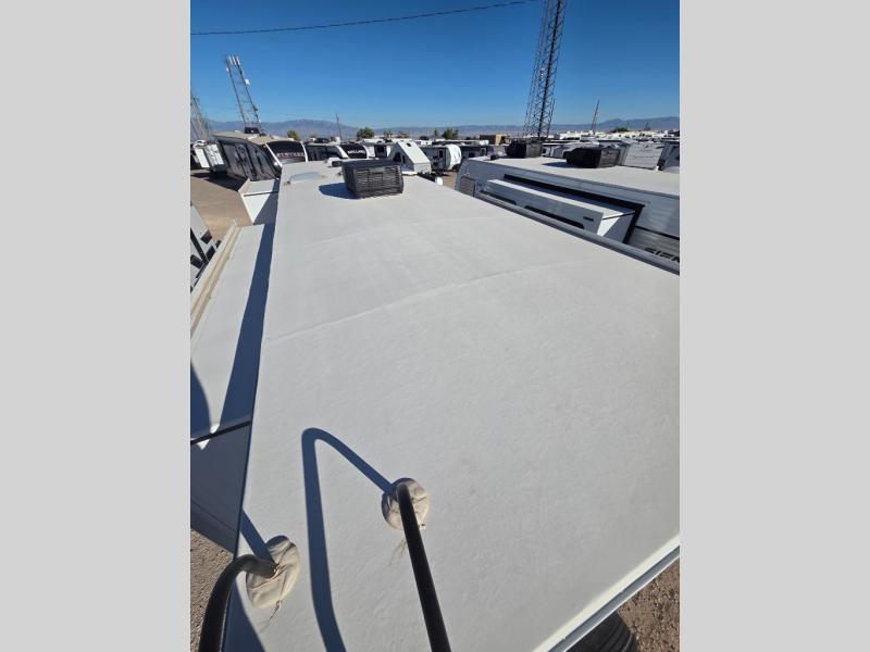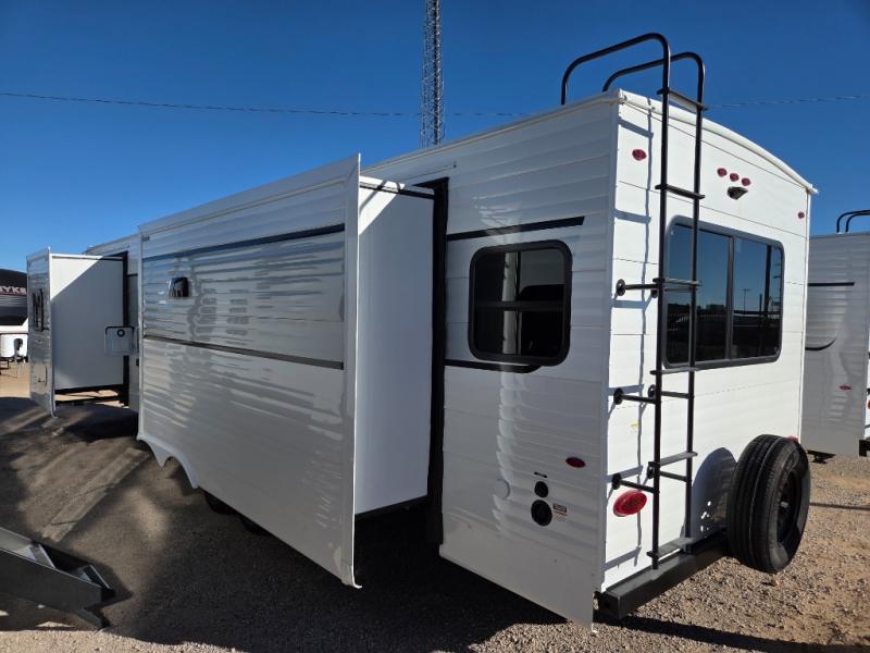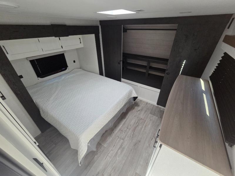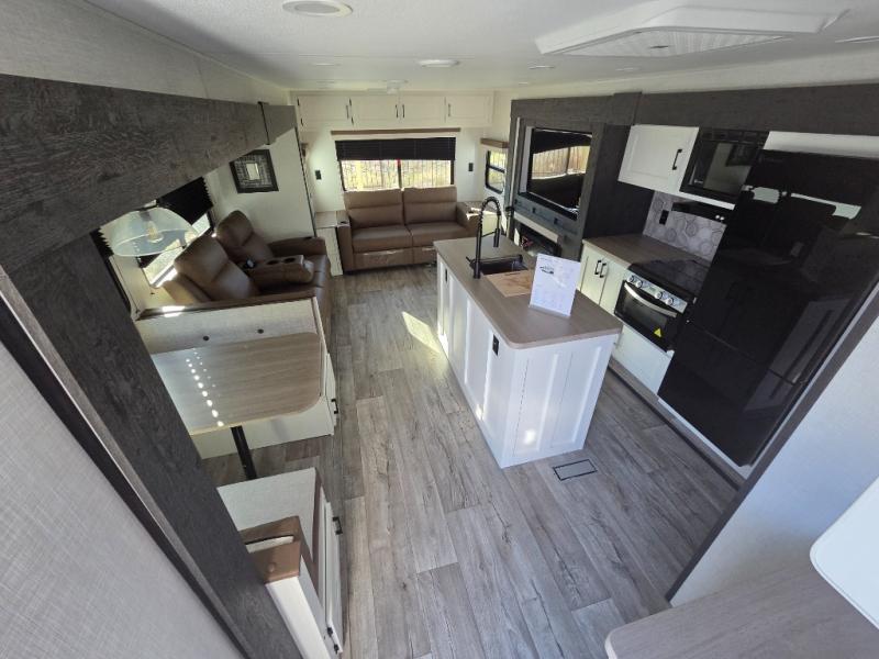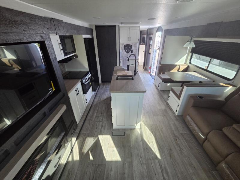 This travel trailer will feel just like home thanks to its spacious interior, large front private bedroom, and kitchen island. There are plenty of places to seating space, including a rear 70" sofa plus theater seating and a Sit N' Slide table within one of the slides. The opposing slide here includes the entertainment center and some of the kitchen appliances. You will also appreciate two pantries, one with washer and dryer prep if you want to add those appliances. A full bath lets you stay clean throughout your trip without having to use the campground's facilities, and the front bedroom is sure to make you feel at home. There is a Sleep Tight queen bed slide, a large front closet, plus a dresser and a second closet for ample storage space!