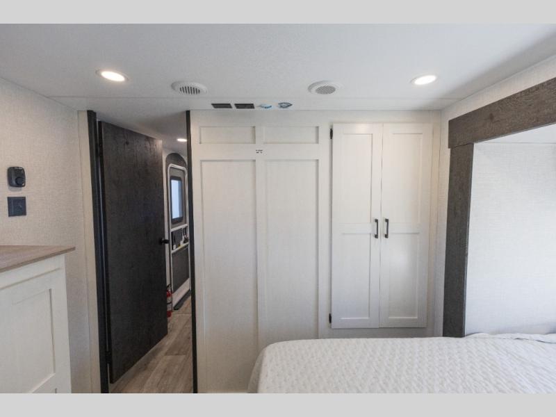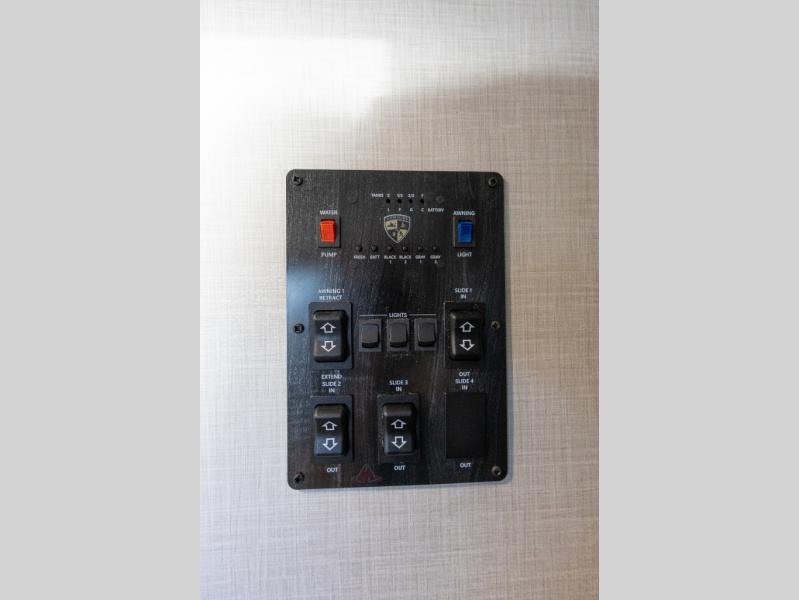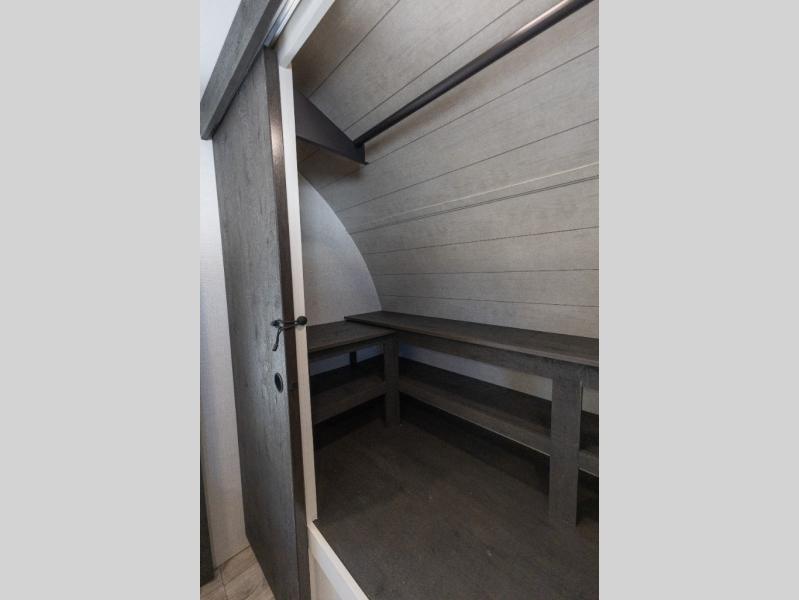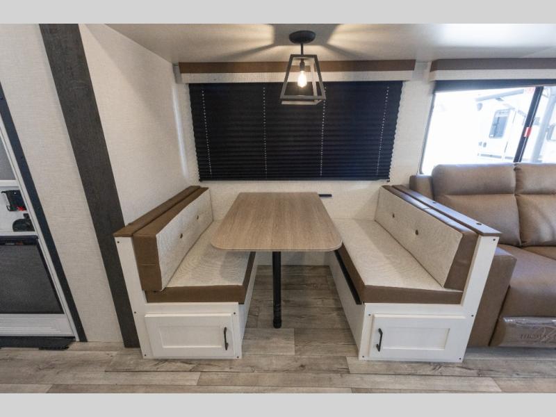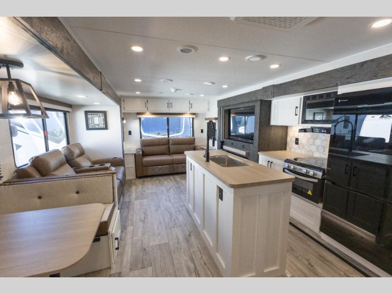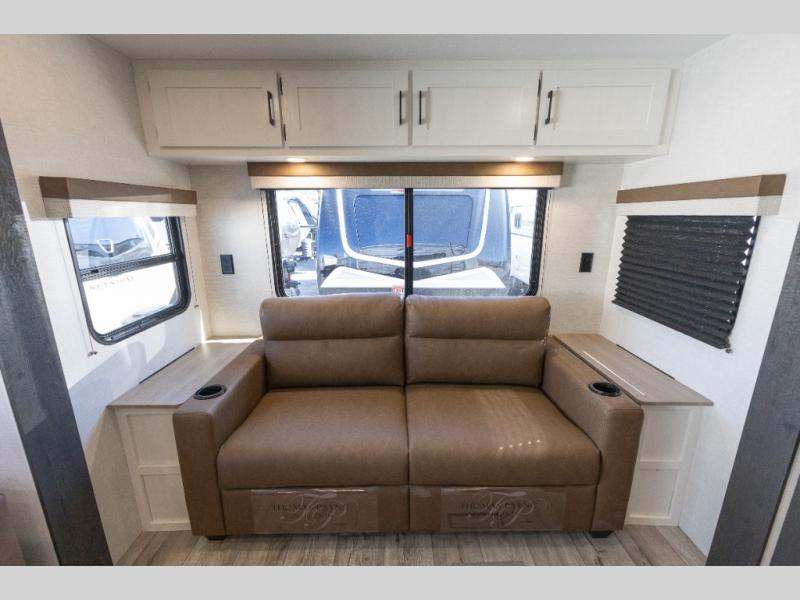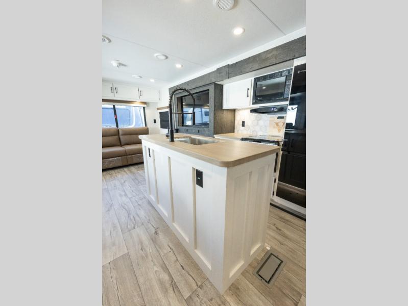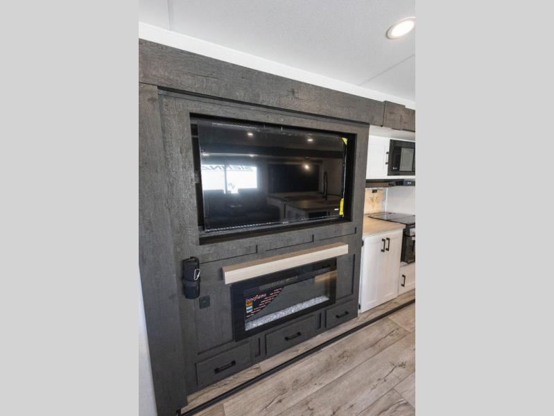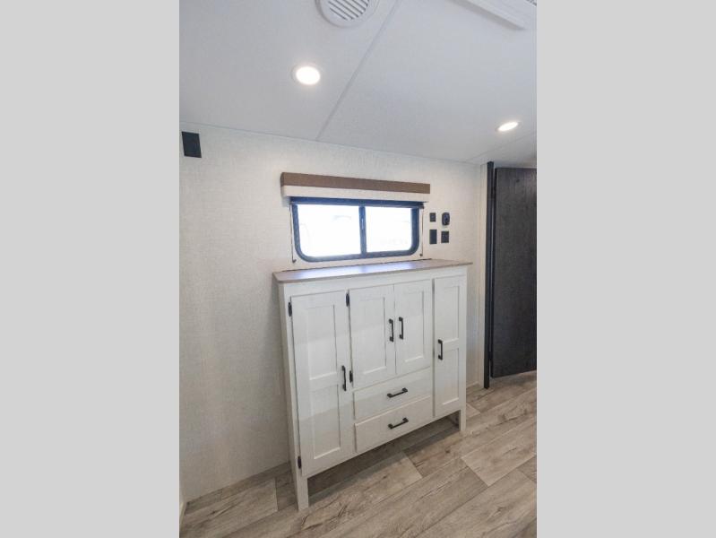 This travel trailer will feel just like home thanks to its spacious interior, large front private bedroom, and kitchen island. There are plenty of places to seating space, including a rear 70" sofa plus theater seating and a Sit N' Slide table within one of the slides. The opposing slide here includes the entertainment center and some of the kitchen appliances. You will also appreciate two pantries, one with washer and dryer prep if you want to add those appliances. A full bath lets you stay clean throughout your trip without having to use the campground's facilities, and the front bedroom is sure to make you feel at home. There is a Sleep Tight queen bed slide, a large front closet, plus a dresser and a second closet for ample storage space!