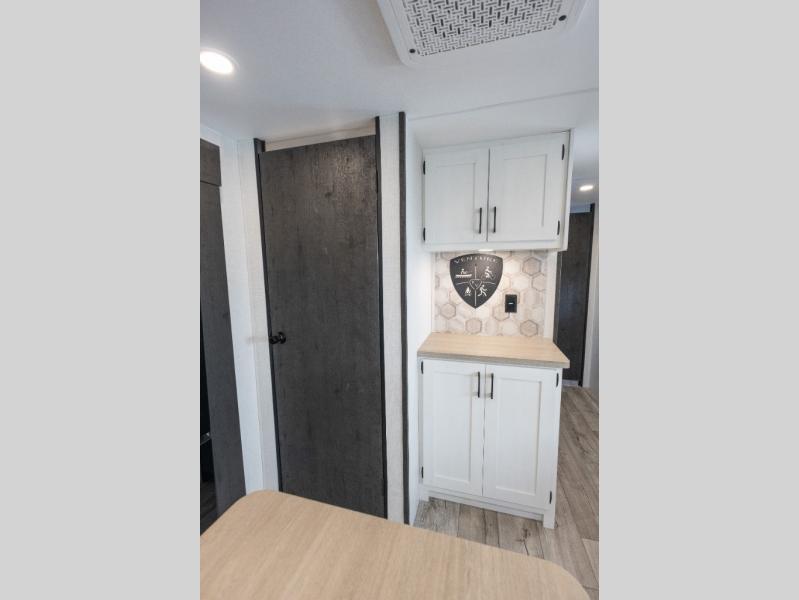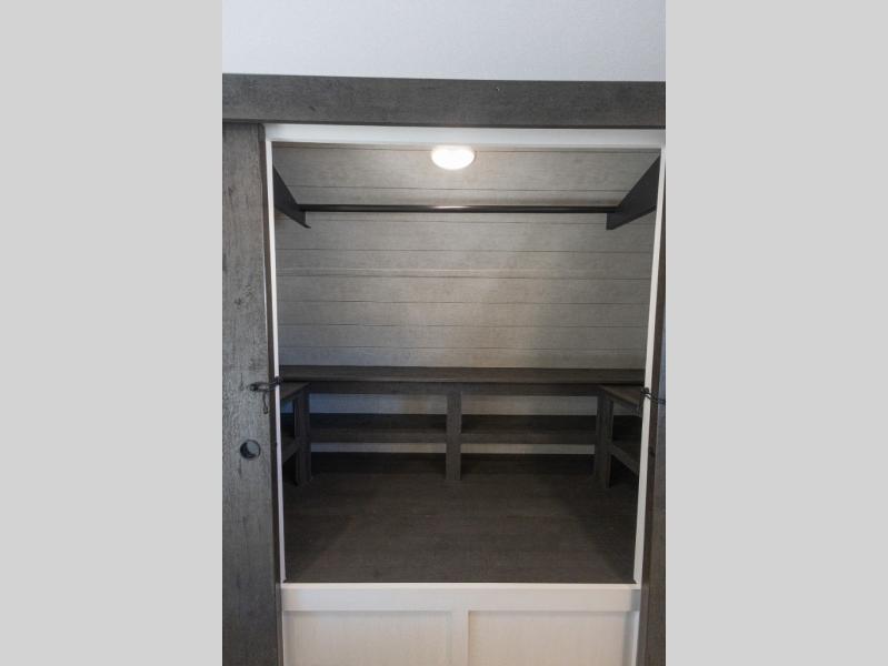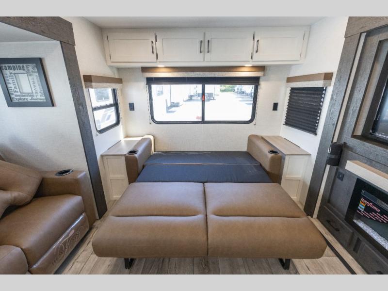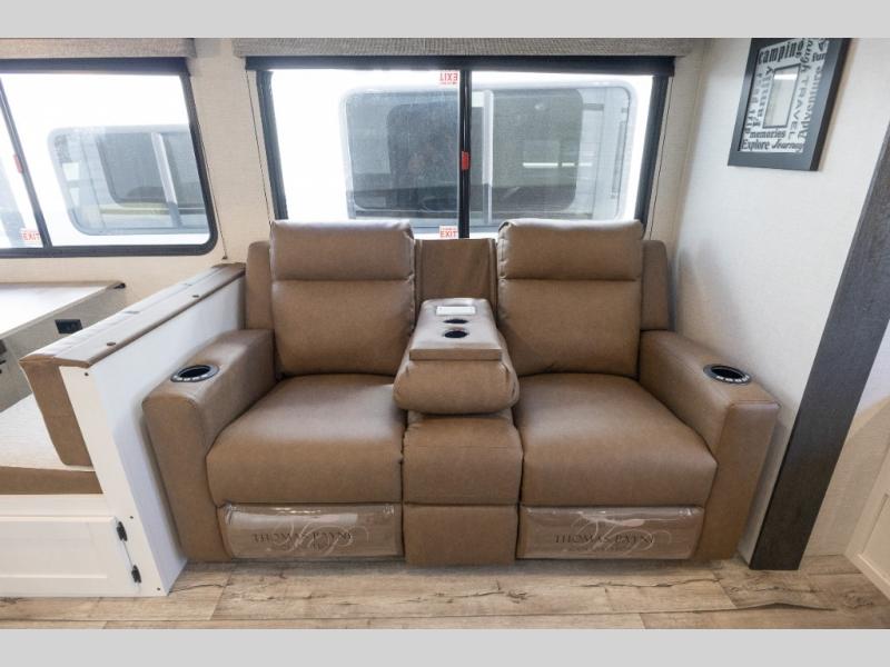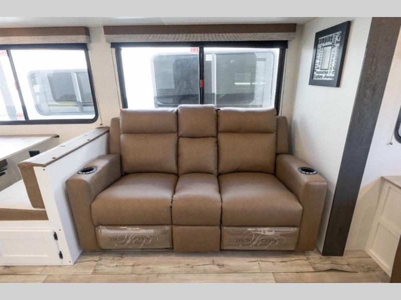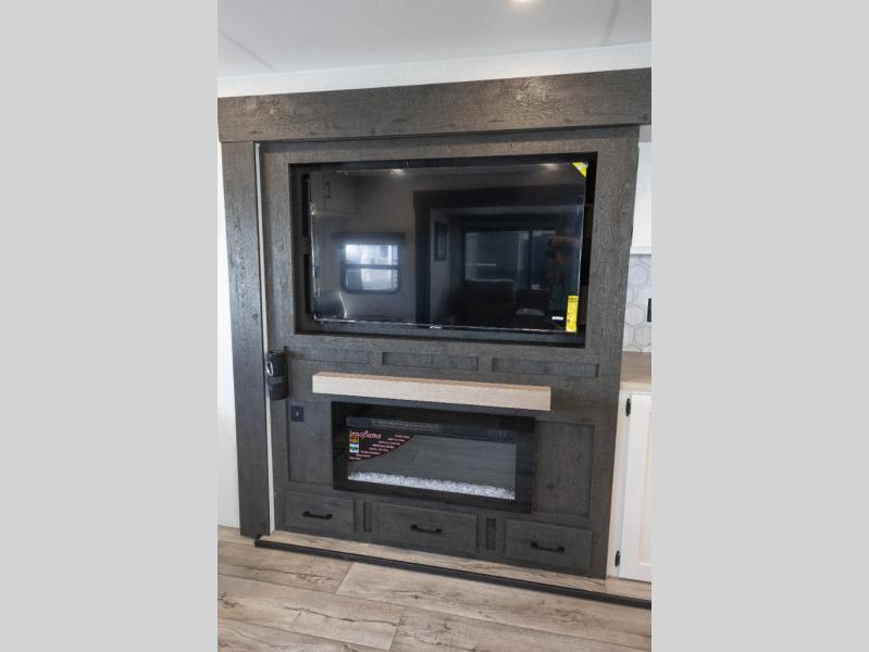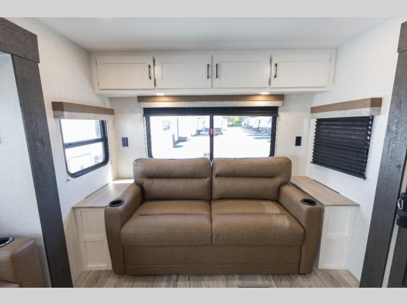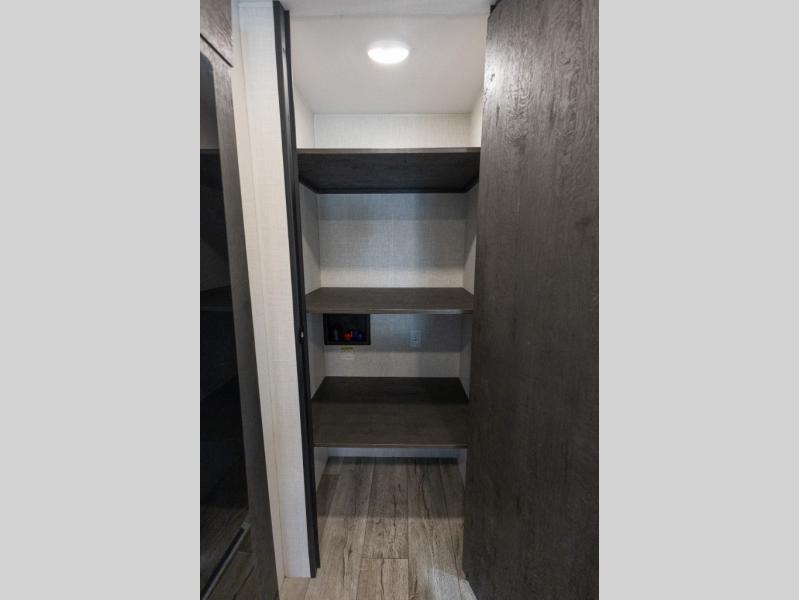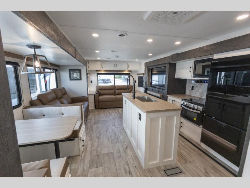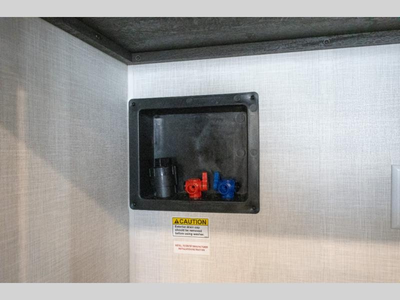 This travel trailer will feel just like home thanks to its spacious interior, large front private bedroom, and kitchen island. There are plenty of places to seating space, including a rear 70" sofa plus theater seating and a Sit N' Slide table within one of the slides. The opposing slide here includes the entertainment center and some of the kitchen appliances. You will also appreciate two pantries, one with washer and dryer prep if you want to add those appliances. A full bath lets you stay clean throughout your trip without having to use the campground's facilities, and the front bedroom is sure to make you feel at home. There is a Sleep Tight queen bed slide, a large front closet, plus a dresser and a second closet for ample storage space!