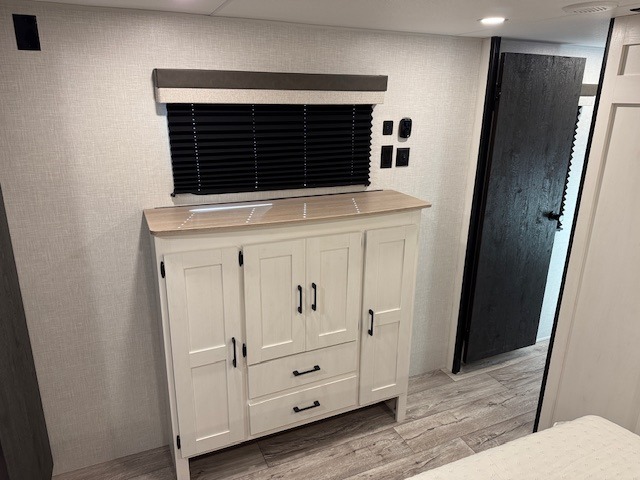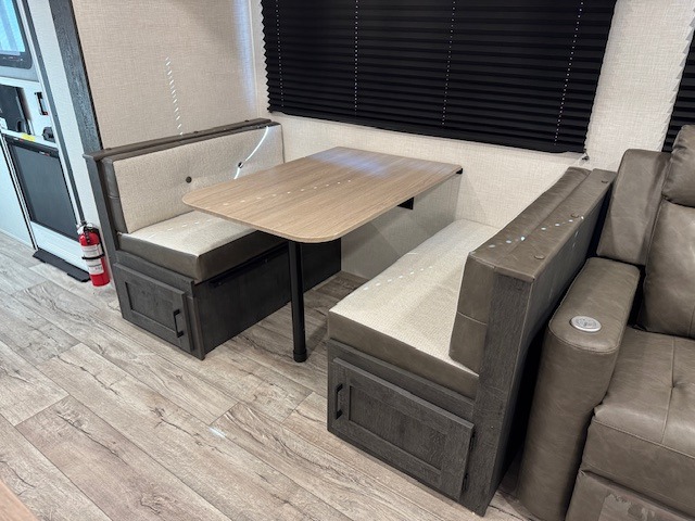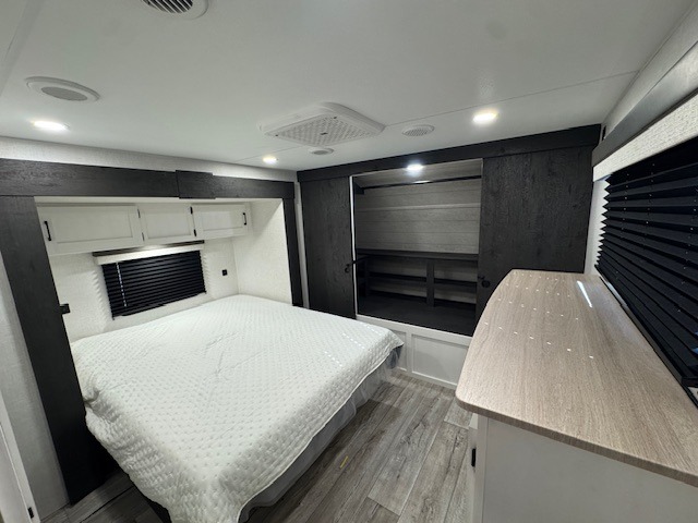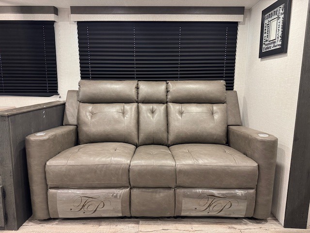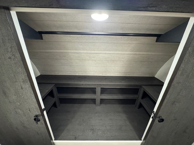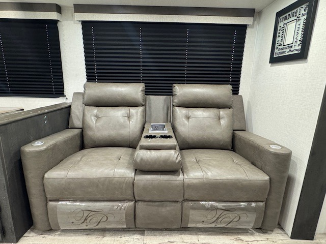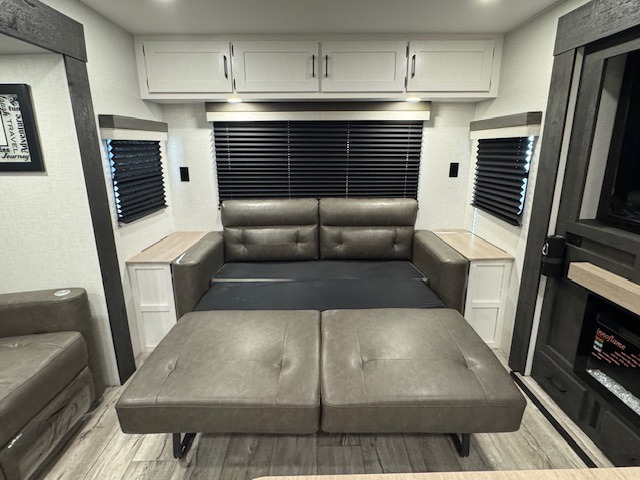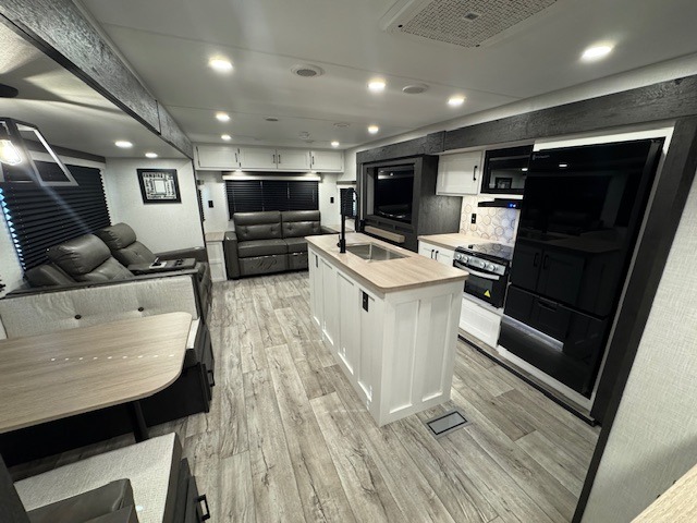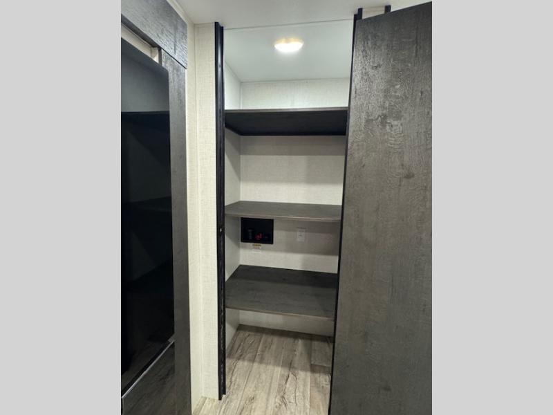 This travel trailer will feel just like home thanks to its spacious interior, large front private bedroom, and kitchen island. There are plenty of places to seating space, including a rear 70" sofa plus theater seating and a Sit N' Slide table within one of the slides. The opposing slide here includes the entertainment center and some of the kitchen appliances. You will also appreciate two pantries, one with washer and dryer prep if you want to add those appliances. A full bath lets you stay clean throughout your trip without having to use the campground's facilities, and the front bedroom is sure to make you feel at home. There is a Sleep Tight queen bed slide, a large front closet, plus a dresser and a second closet for ample storage space!