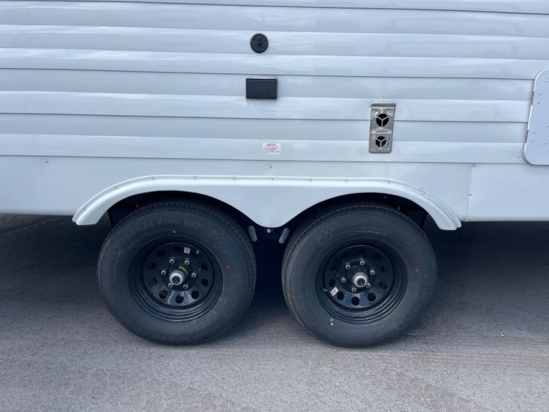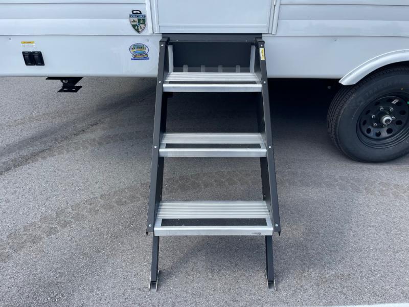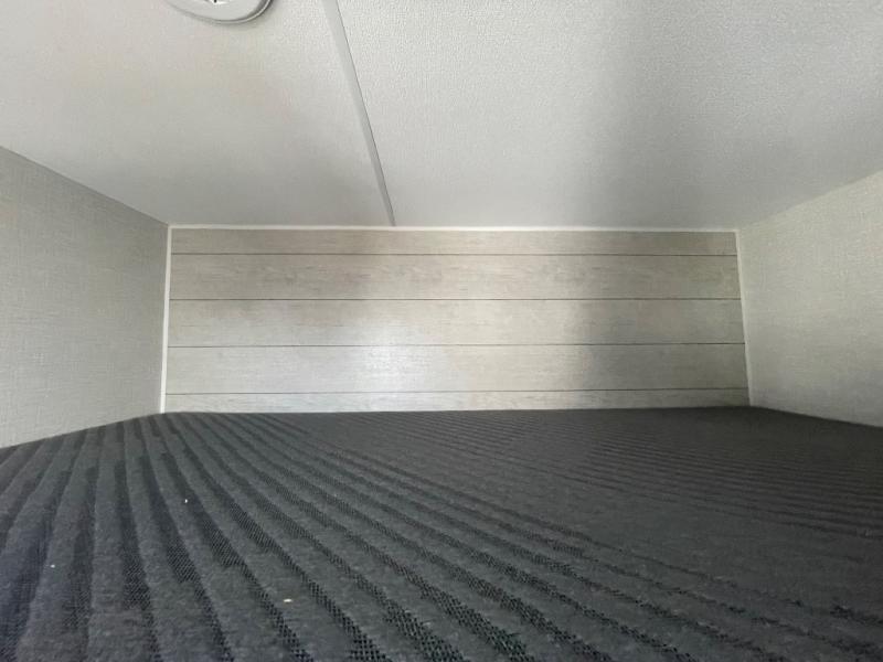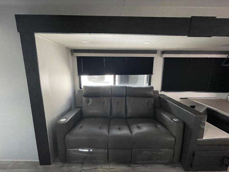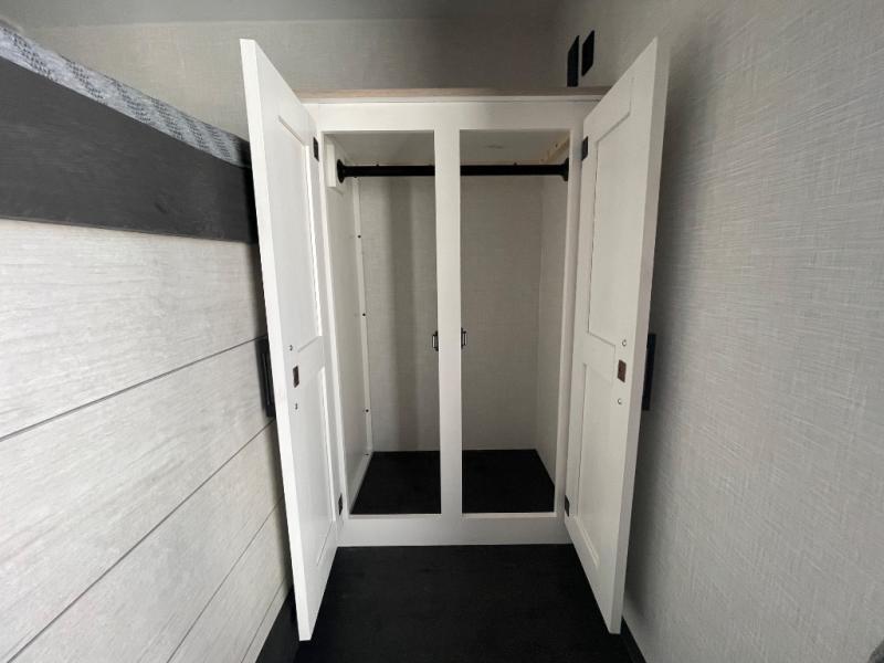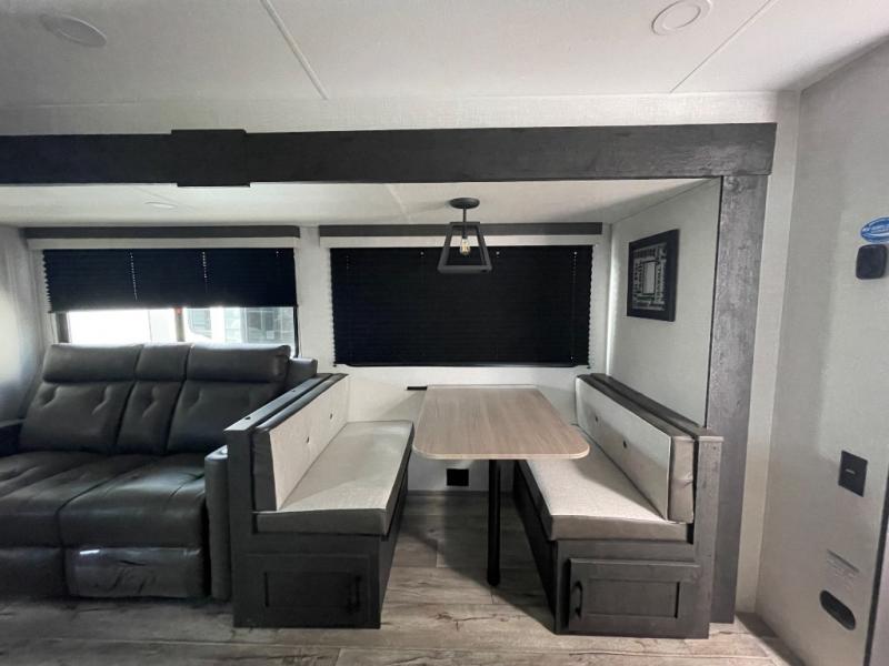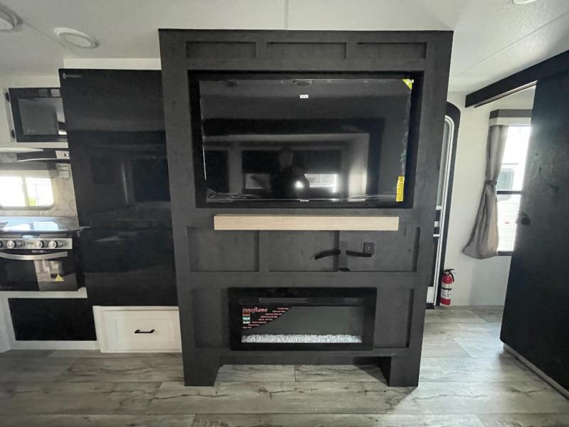 This travel trailer’s bunk beds are perfect for kids, providing ample sleeping space for the whole family. The wardrobes offer plenty of storage for your clothing and essentials.The sofa is a comfortable spot to relax, and the fireplace adds a cozy touch to the interior. The entertainment center is equipped with a 50” TV, perfect for family movie nights or enjoying your favorite shows on the go. The walk-in pantry provides ample storage for your food and snacks, while the 10 cu refrigerator keeps your food and drinks fresh. The sit n’ slide table is a fun and functional spot for meals and adds additional sleeping space. For convenience and comfort the walk-through bath provides easy access and convenience, while the overhead cabinets offer additional storage for your essentials. The front bedroom features a spacious queen bed and overhead cabinet. Head outside and unwind under the shade of the two exterior awnings and store everything you need in the pass-through storage offering ample space for your outdoor gear and equipment.