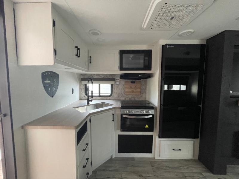 With any Sienna travel trailer by Venture RV, you will enjoy a lightweight unit, convenient amenities, and a durable construction that includes a BAL NXG-bolted frame. There is also a heated and enclosed one-piece underbelly, residential fiberglass insulation, and a reflective PVC roof membrane within the Weather-Shield Package to help extend your camping season. Outside, the BAL 5.0 power stabilizer jacks and power tongue jack will have you set up in no-time, and the Venture RV bottle opener/dog tie down will make it easy to bring your furry friends along. Head inside to enjoy the modern farmhouse design, along with Beauflor throughout with no carpet, custom backsplash, large underbed storage, and a bath skylight to name a few comforts!