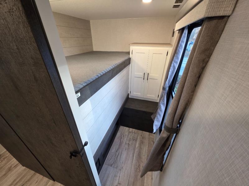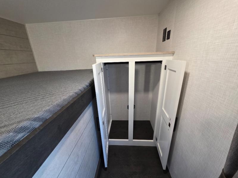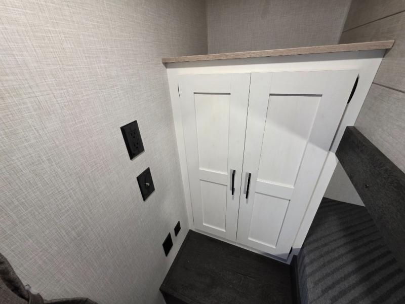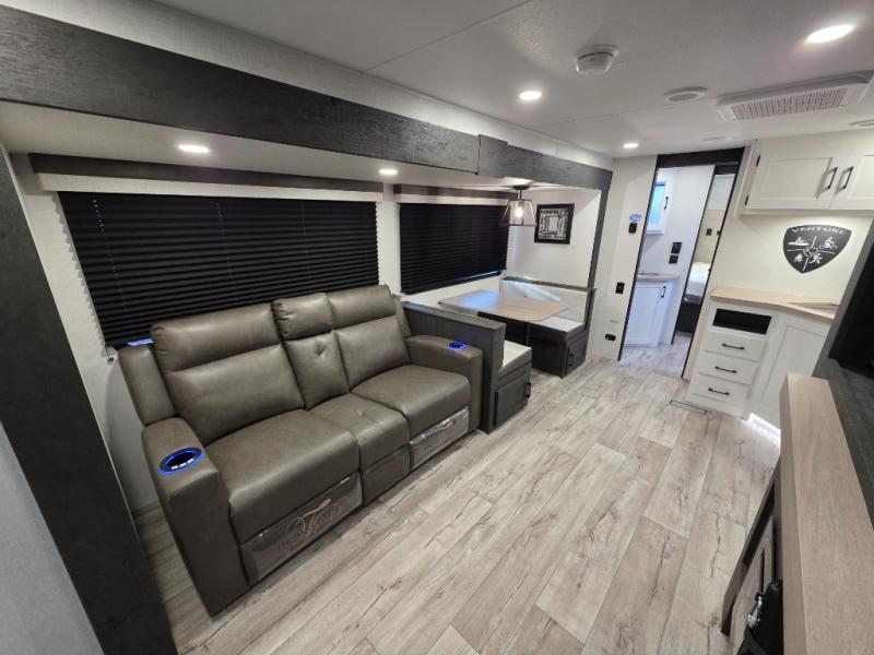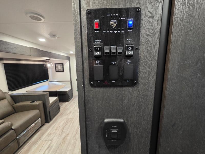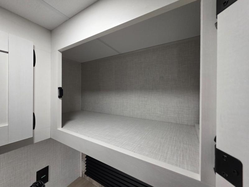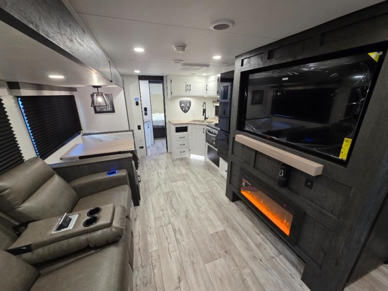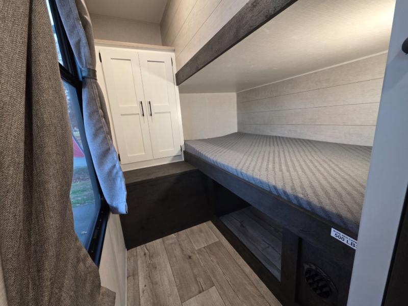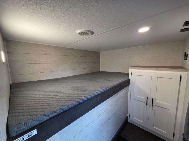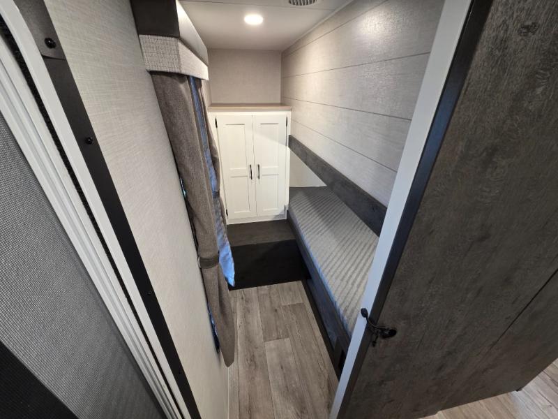 This travel trailer’s bunk beds are perfect for kids, providing ample sleeping space for the whole family. The wardrobes offer plenty of storage for your clothing and essentials.The sofa is a comfortable spot to relax, and the fireplace adds a cozy touch to the interior. The entertainment center is equipped with a 50” TV, perfect for family movie nights or enjoying your favorite shows on the go. The walk-in pantry provides ample storage for your food and snacks, while the 10 cu refrigerator keeps your food and drinks fresh. The sit n’ slide table is a fun and functional spot for meals and adds additional sleeping space. For convenience and comfort the walk-through bath provides easy access and convenience, while the overhead cabinets offer additional storage for your essentials. The front bedroom features a spacious queen bed and overhead cabinet. Head outside and unwind under the shade of the two exterior awnings and store everything you need in the pass-through storage offering ample space for your outdoor gear and equipment.