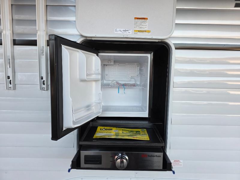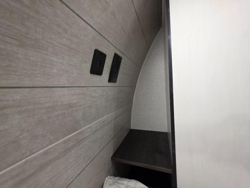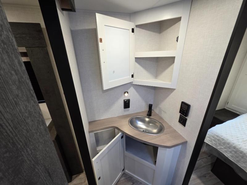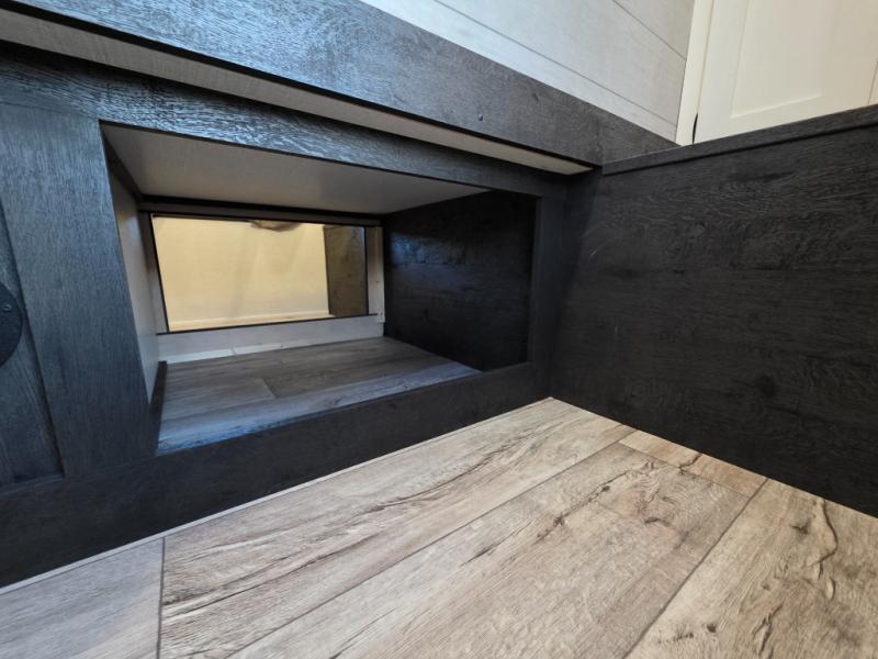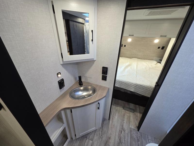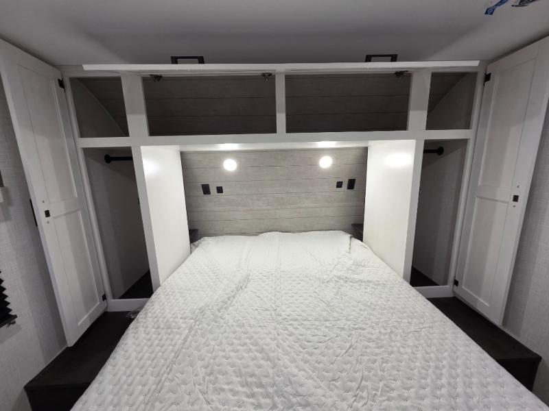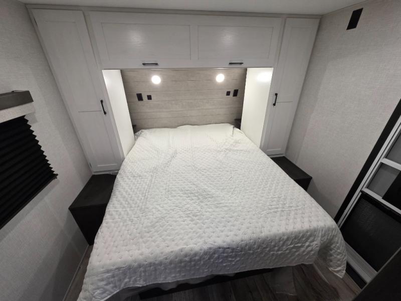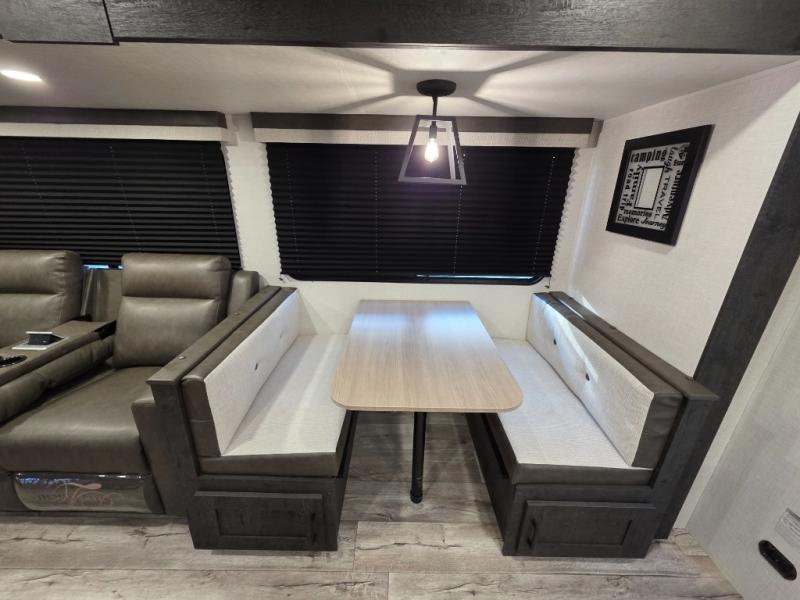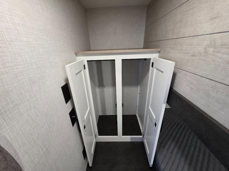 This travel trailer’s bunk beds are perfect for kids, providing ample sleeping space for the whole family. The wardrobes offer plenty of storage for your clothing and essentials.The sofa is a comfortable spot to relax, and the fireplace adds a cozy touch to the interior. The entertainment center is equipped with a 50” TV, perfect for family movie nights or enjoying your favorite shows on the go. The walk-in pantry provides ample storage for your food and snacks, while the 10 cu refrigerator keeps your food and drinks fresh. The sit n’ slide table is a fun and functional spot for meals and adds additional sleeping space. For convenience and comfort the walk-through bath provides easy access and convenience, while the overhead cabinets offer additional storage for your essentials. The front bedroom features a spacious queen bed and overhead cabinet. Head outside and unwind under the shade of the two exterior awnings and store everything you need in the pass-through storage offering ample space for your outdoor gear and equipment.