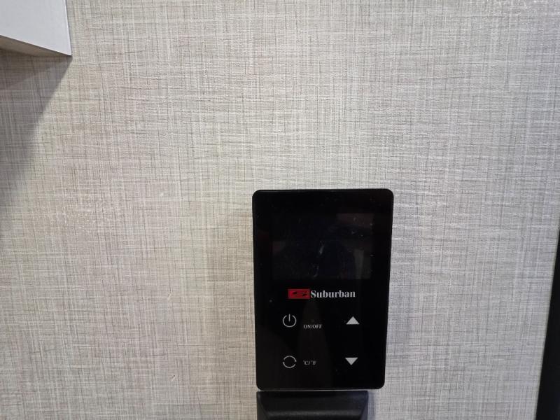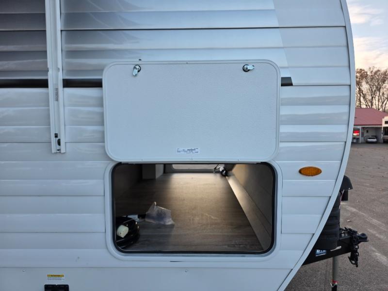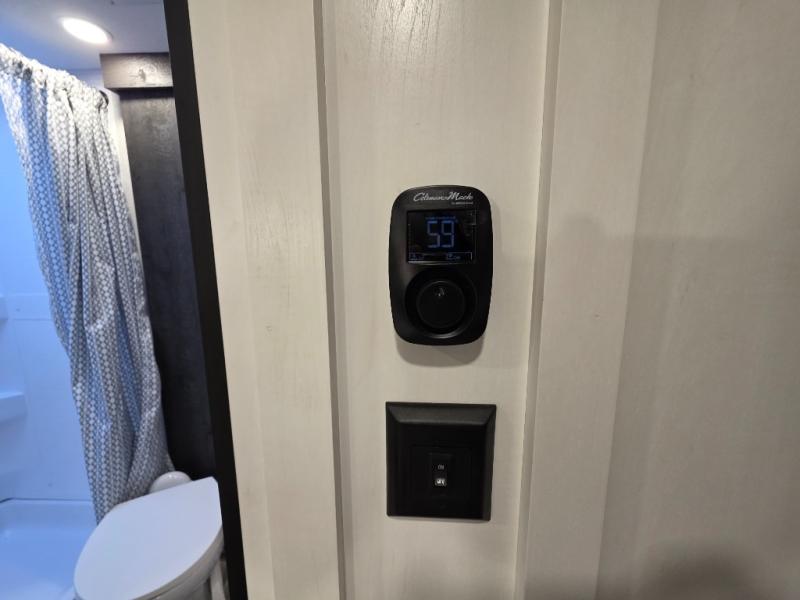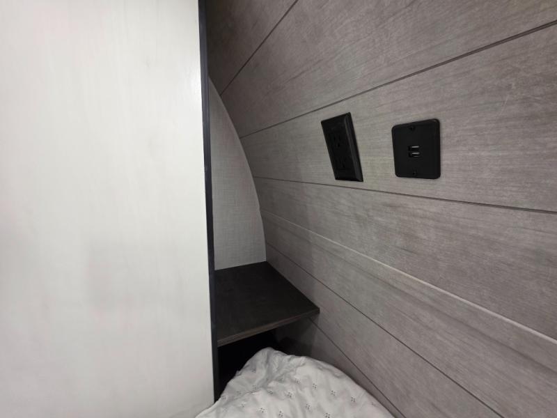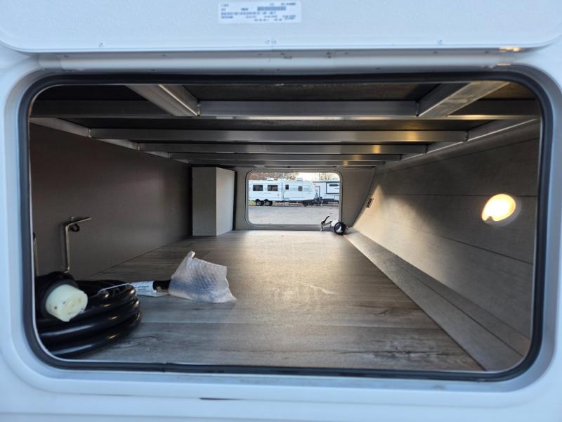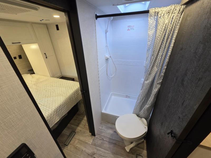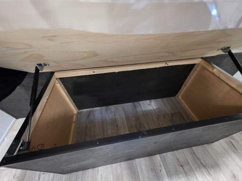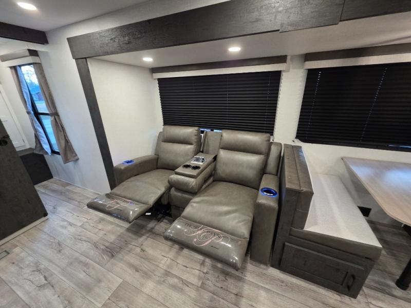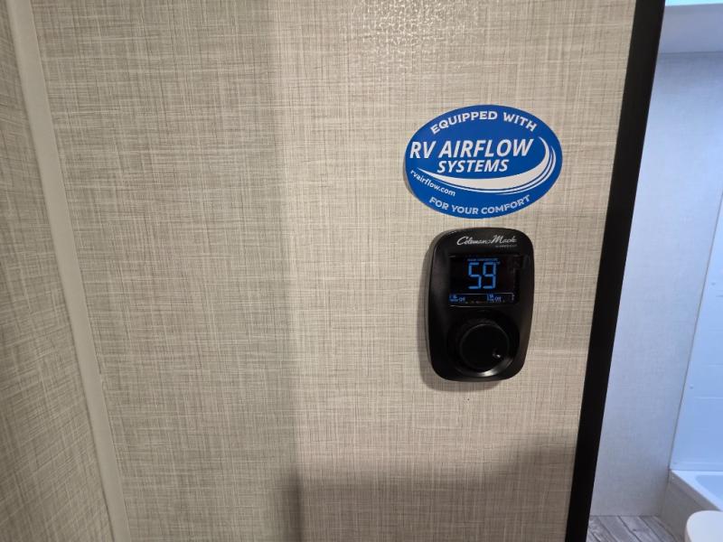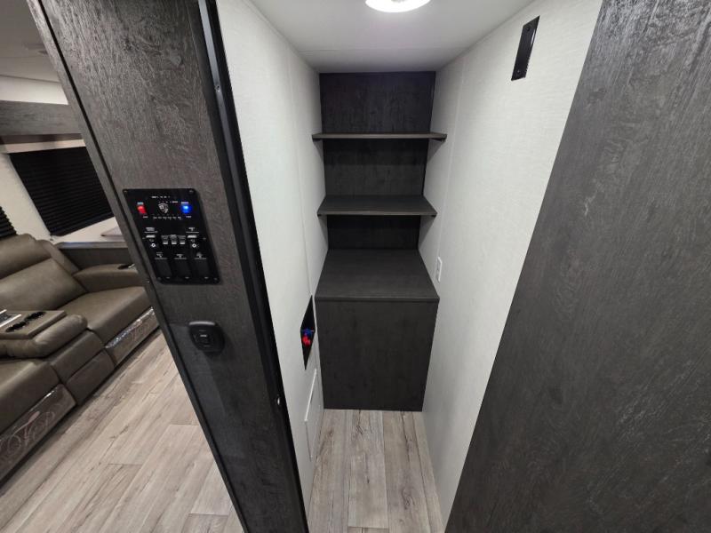 This travel trailer’s bunk beds are perfect for kids, providing ample sleeping space for the whole family. The wardrobes offer plenty of storage for your clothing and essentials.The sofa is a comfortable spot to relax, and the fireplace adds a cozy touch to the interior. The entertainment center is equipped with a 50” TV, perfect for family movie nights or enjoying your favorite shows on the go. The walk-in pantry provides ample storage for your food and snacks, while the 10 cu refrigerator keeps your food and drinks fresh. The sit n’ slide table is a fun and functional spot for meals and adds additional sleeping space. For convenience and comfort the walk-through bath provides easy access and convenience, while the overhead cabinets offer additional storage for your essentials. The front bedroom features a spacious queen bed and overhead cabinet. Head outside and unwind under the shade of the two exterior awnings and store everything you need in the pass-through storage offering ample space for your outdoor gear and equipment.