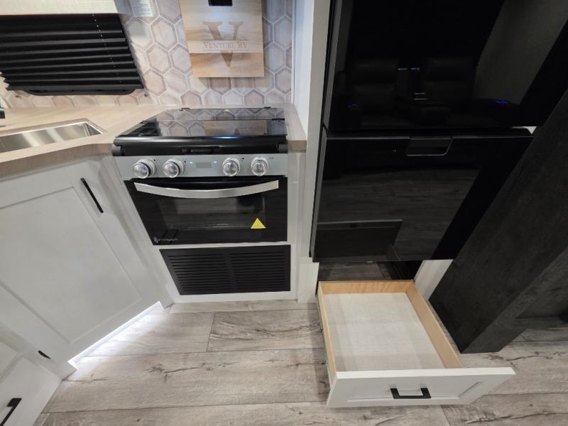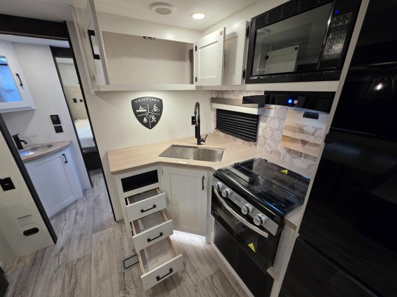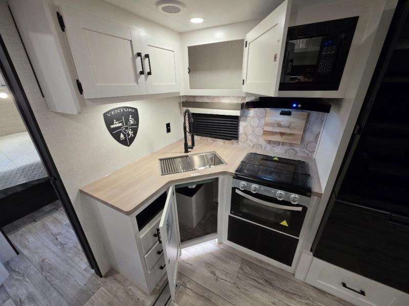 With any Sienna travel trailer by Venture RV, you will enjoy a lightweight unit, convenient amenities, and a durable construction that includes a BAL NXG-bolted frame. There is also a heated and enclosed one-piece underbelly, residential fiberglass insulation, and a reflective PVC roof membrane within the Weather-Shield Package to help extend your camping season. Outside, the BAL 5.0 power stabilizer jacks and power tongue jack will have you set up in no-time, and the Venture RV bottle opener/dog tie down will make it easy to bring your furry friends along. Head inside to enjoy the modern farmhouse design, along with Beauflor throughout with no carpet, custom backsplash, large underbed storage, and a bath skylight to name a few comforts!