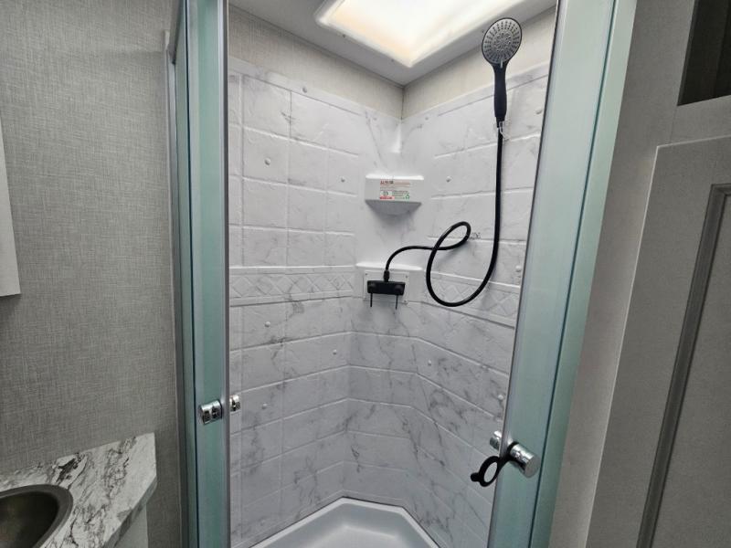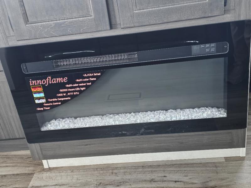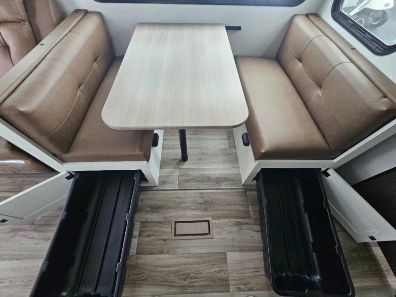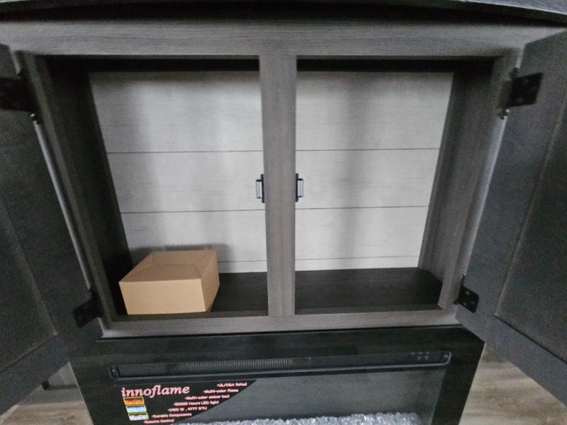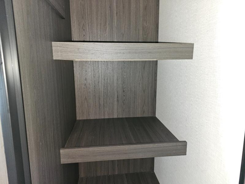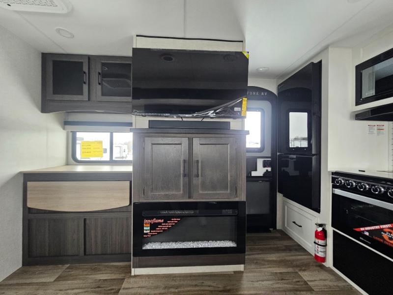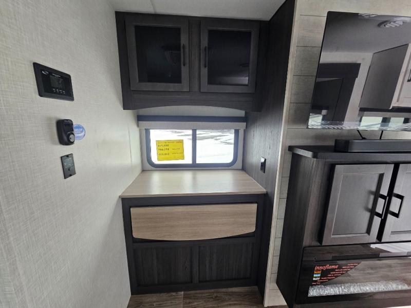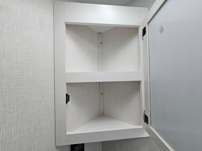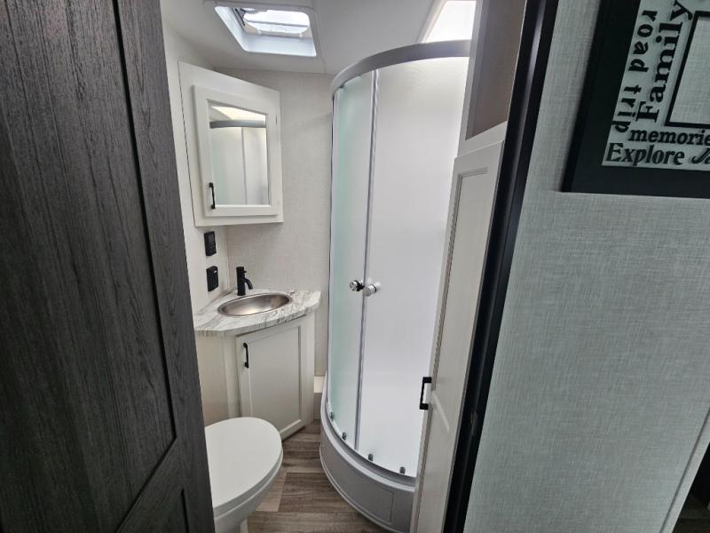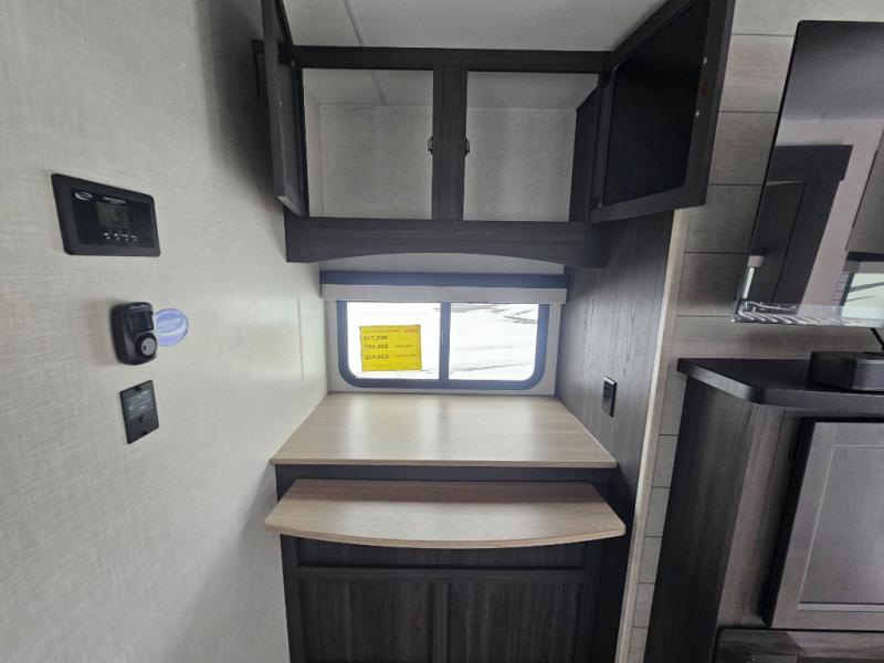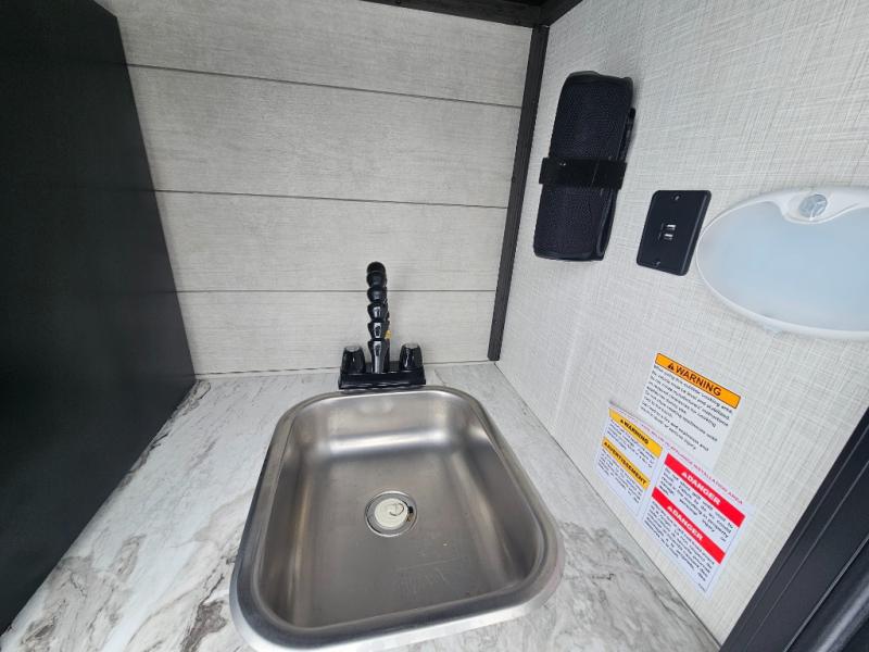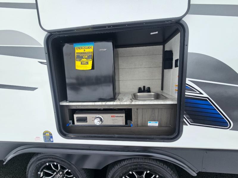 The chef will love the open rear kitchen area of this travel trailer! The 10 cu. ft. 12V refrigerator is big enough to hold your perishables and the flip countertop area is the perfect place for a coffee bar. You can even cook outside with the campfire café that has a refrigerator, a sink, and a griddle to grill some burgers while breathing in fresh air. Just be sure to grab your coat hanging on the coat hooks in the walk-in pantry before heading out the door. A 70" sofa and Sit N' Slide table adds more interior space, as well as comfortable places to eat, relax, and even sleep once converted. Everyone can freshen up in the full bathroom with the 34" radius shower and even have their towel close by thanks to the linen closet next to it!