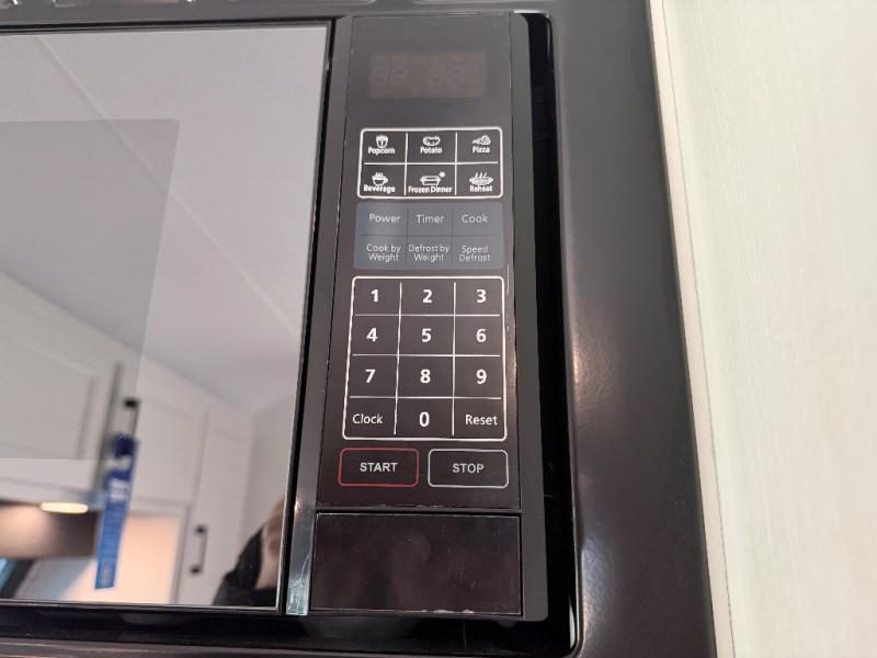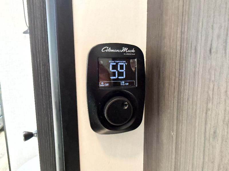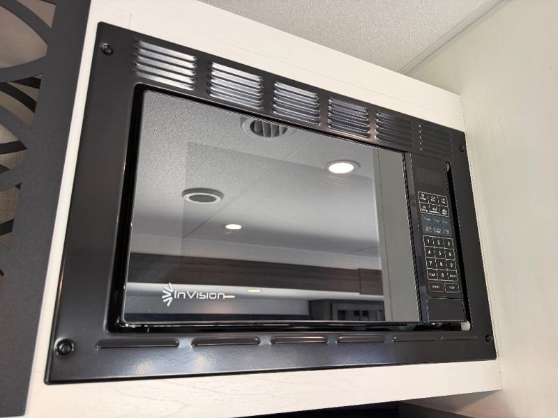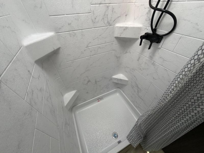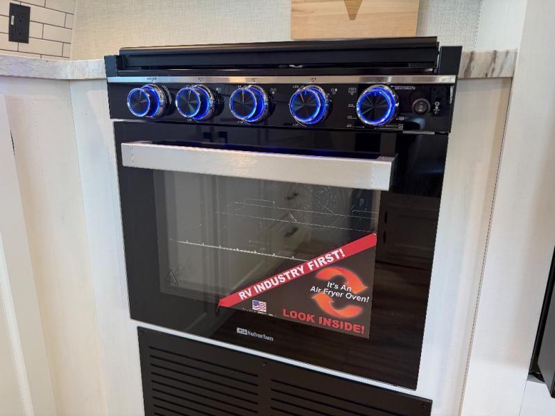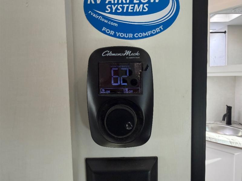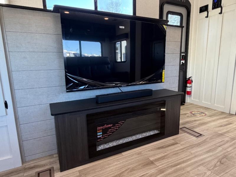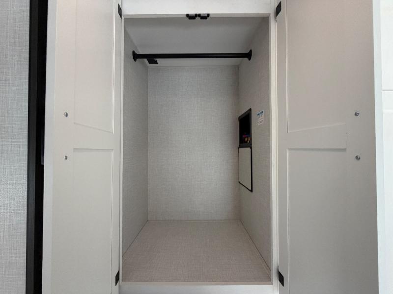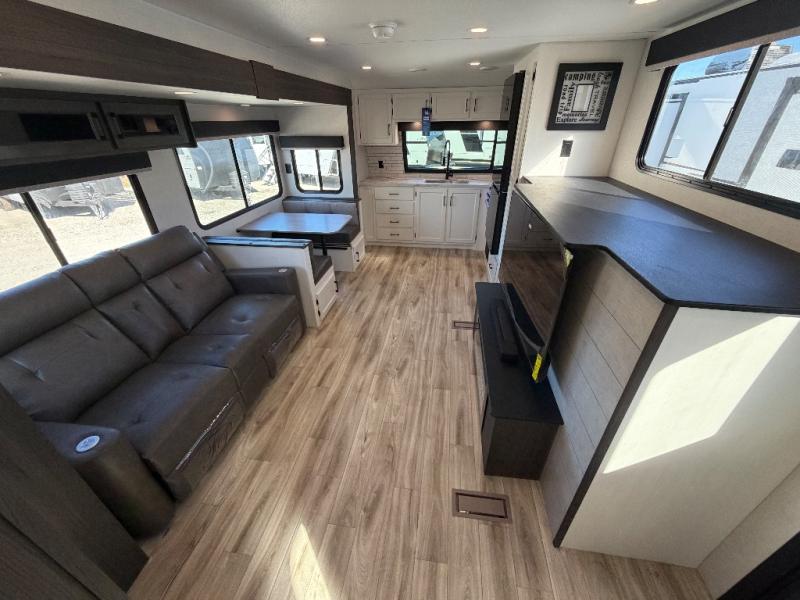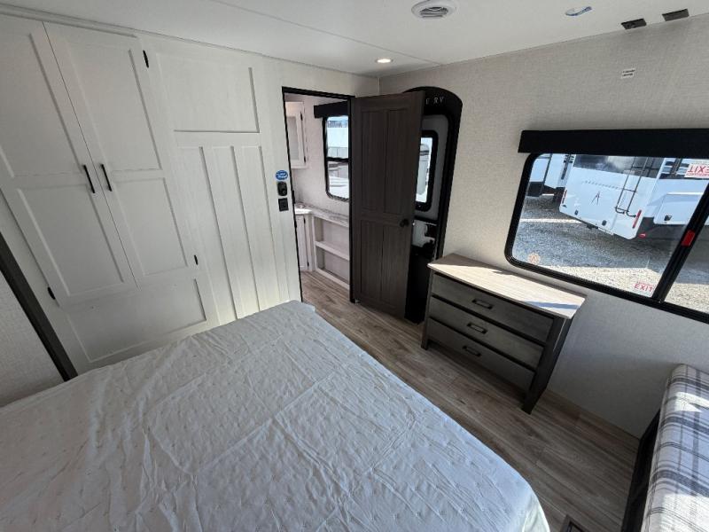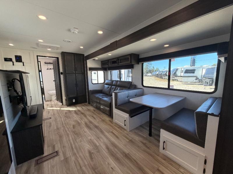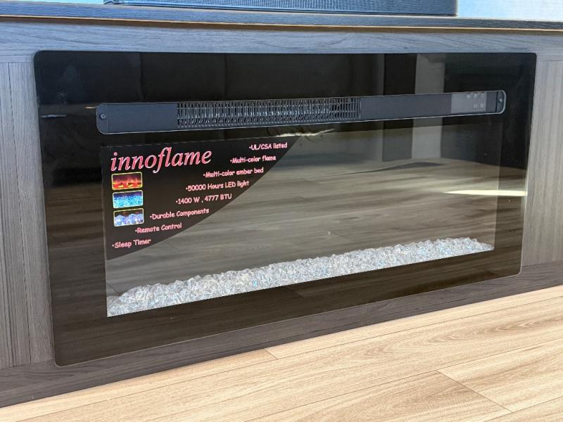 A front kitchen in this travel trailer provides more interior space! Once you have prepared your best meals with the Furrion oven and three burner cooktop, you can head to the Sit N' Slide table with flipside reversible cushions to dine. The 70" sofa also offers a comfortable place to take an afternoon nap or sit while enjoying the entertainment center with a frameless electric fireplace and 40" TV. A walk-thru bath makes it easy for all to enter and has a 30" x 36" shower to freshen up in each morning. The rear private bedroom has a Sleep Tight queen bed slide for a good night's rest, a dresser, two wardrobes, and a bench seat where you sit to put your hiking boots on. You'll also find one of the dual entry doors here for added convenience!