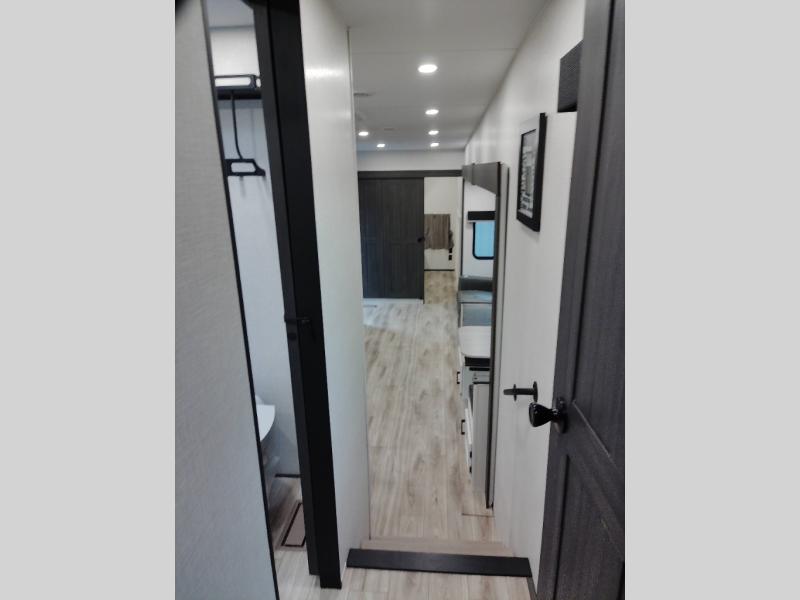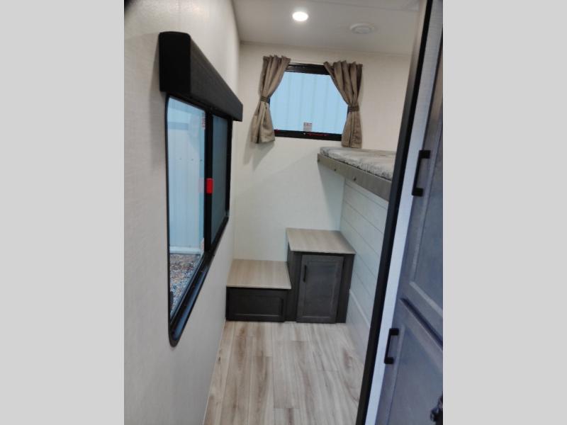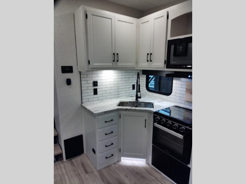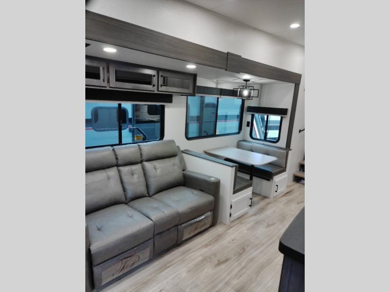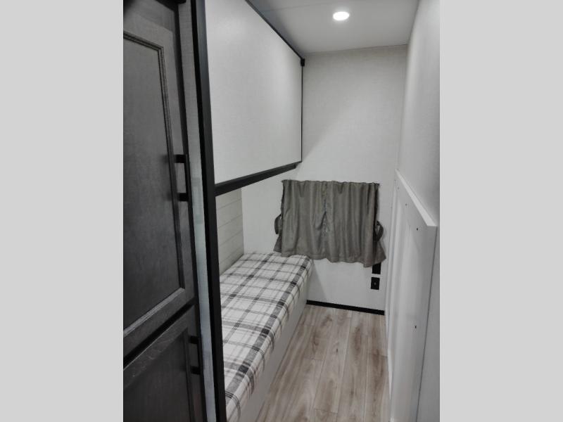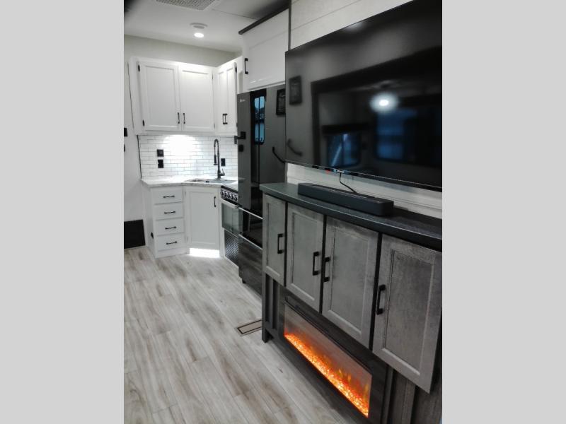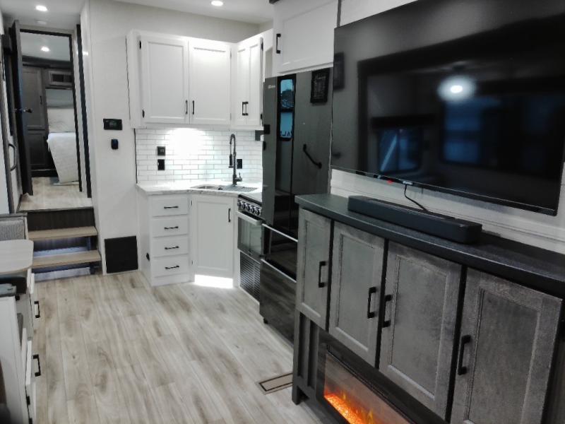 At the front of the fifth wheel, the main bedroom features a 60" x 80" Sleep Tight queen bed with a slide-out wardrobe and additional storage on each side, providing plenty of space for clothes and essentials. Down the hall, the full bathroom includes a 30" x 36" shower with a glass door, a porcelain foot-flush toilet, and a stainless-steel oval sink for a comfortable, home-like experience. The central living area offers theater seating across from a fireplace and 50" TV, plus a Sit n’ Slide table with reversible cushions for dining or games. The kitchen is equipped with a stainless-steel sink, three-burner range with glass cover, microwave, 21" oven with air fryer, and an 18-cu. ft. refrigerator. Near the entrance, a walk-in pantry with coat hooks adds versatility, while the rear bunkhouse provides extra-sleeping space with a 40" x 75" upper bunk and a 70" pull-out day bed perfect for hosting guests after a day of adventure.