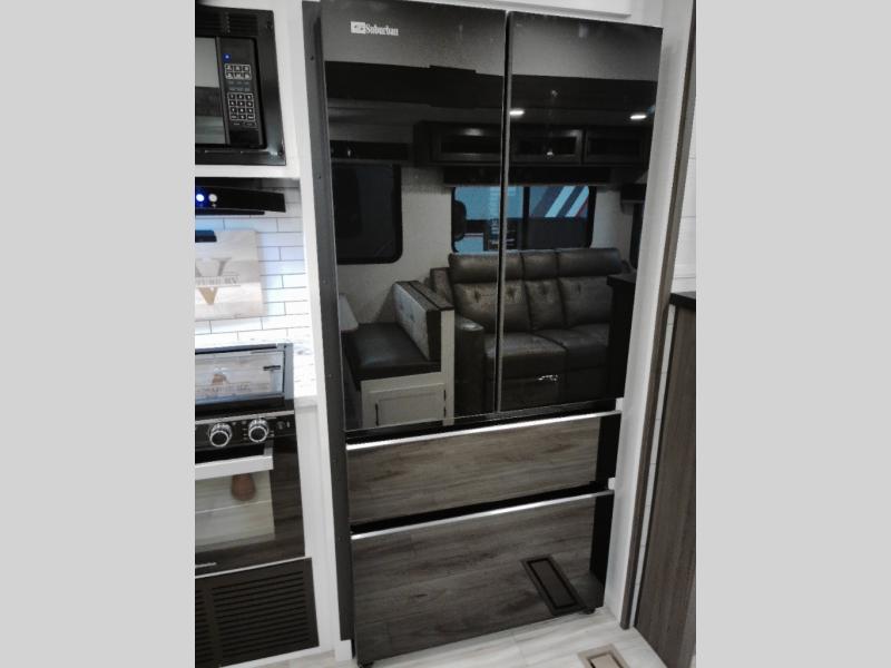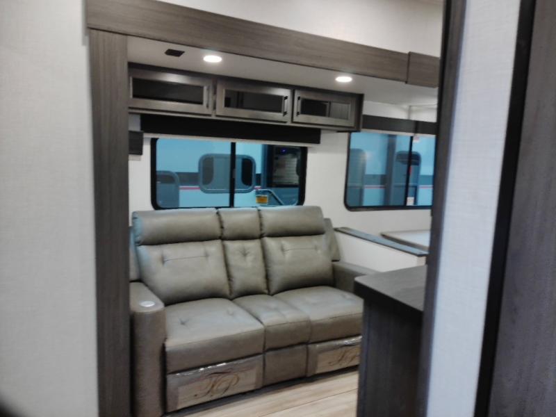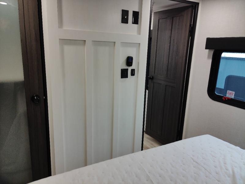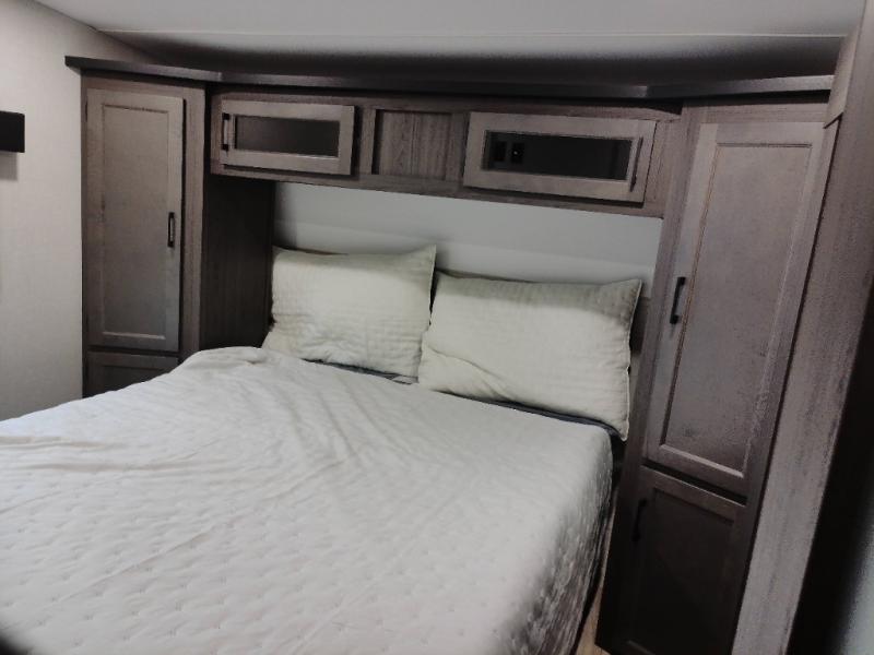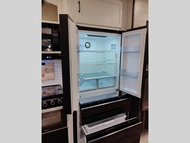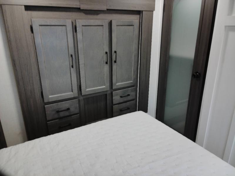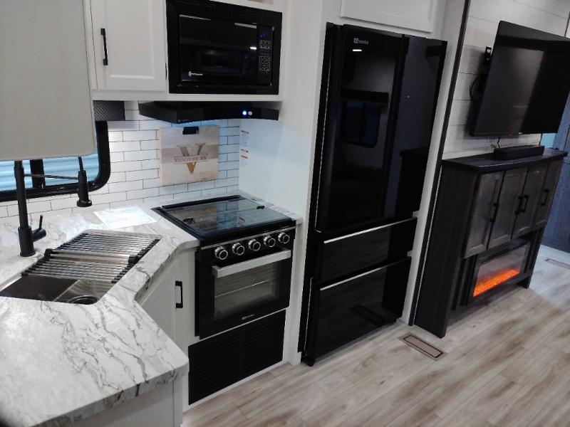 At the front of the fifth wheel, the main bedroom features a 60" x 80" Sleep Tight queen bed with a slide-out wardrobe and additional storage on each side, providing plenty of space for clothes and essentials. Down the hall, the full bathroom includes a 30" x 36" shower with a glass door, a porcelain foot-flush toilet, and a stainless-steel oval sink for a comfortable, home-like experience. The central living area offers theater seating across from a fireplace and 50" TV, plus a Sit n’ Slide table with reversible cushions for dining or games. The kitchen is equipped with a stainless-steel sink, three-burner range with glass cover, microwave, 21" oven with air fryer, and an 18-cu. ft. refrigerator. Near the entrance, a walk-in pantry with coat hooks adds versatility, while the rear bunkhouse provides extra-sleeping space with a 40" x 75" upper bunk and a 70" pull-out day bed perfect for hosting guests after a day of adventure.
