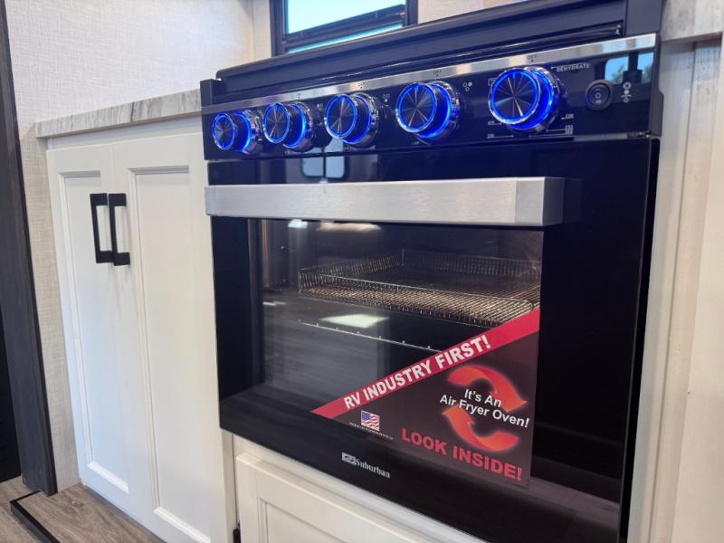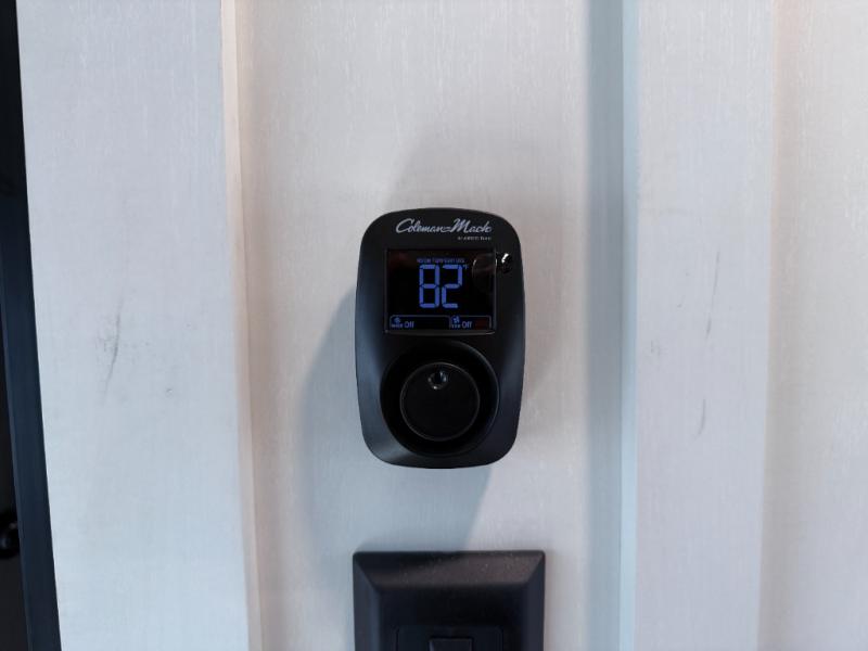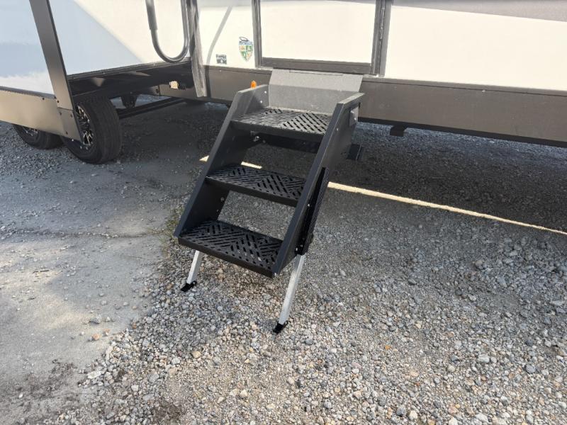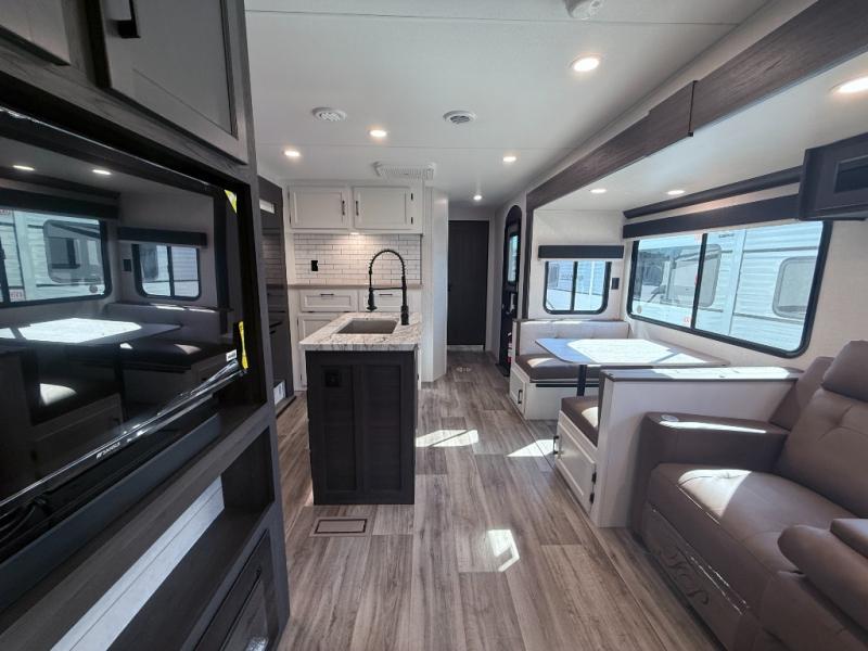 Stay protected rain or shine with the two 10' legless awnings with wind sensors on this travel trailer! Some other exterior features you will enjoy include a campfire café with a 40" TV to watch the big game while you grill steaks on the griddle, and the pass-through storage area with slam latch baggage doors will keep your gear in place. Inside, there is a rear private bunkhouse with a closet, a 32" x 70" flip-up bunk above a 70" sofa with a table, and a 28" x 70" bunk above a 40" x 70" bottom bunk. The living area has a sofa across from an entertainment center with a frameless fireplace and a 40" TV with a swing arm so others can watch it from the Sit N' Slide table. The dual entry bathroom has a 34" radius shower to freshen up in, and is easy to access, especially those staying in the front private bedroom!