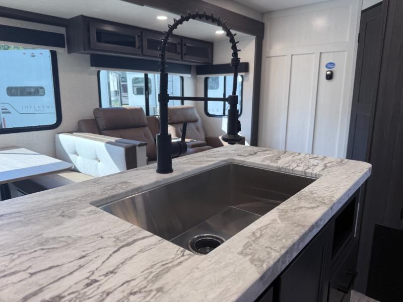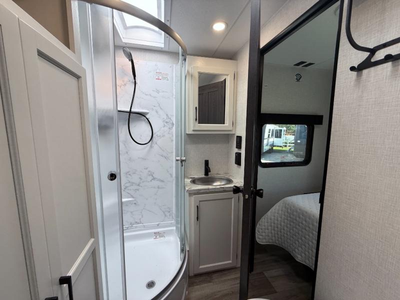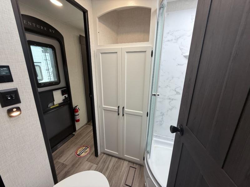 Every Venture RV SportTrek lightweight travel trailer is constructed to offer peace of mind and the comforts of home! Their purposeful residential kitchens are packed with handy features like a Furrion oven and three burner cooktop, a large stainless steel sink with a cover and dish drying rack, plus a 12V refrigerator. You will find plenty of storage throughout, including Safe-Tek hidden storage with a charging center and StorMore nightstands on either side of the bed behind the full-length closets. And the magnetic slam-latch baggage doors and spacious pass-through storage area will hold your outdoor gear in place. They even come with a hot and cold exterior shower and SporTrek's Weather Shield which includes a forced air heated and enclosed underbelly, high output A/C ducting, and more features that will let you extend your camping season. You will also love the new residential upgraded furniture, Serta memory foam mattress, barn style passage doors, and many more comforts!