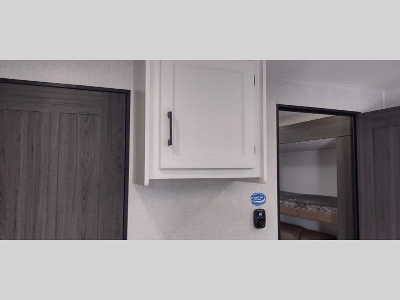 At the front of the trailer, parents will appreciate the private bedroom with a Sleep Tight queen bed, dual wardrobes, and direct access to the full bath featuring a roomy shower and modern fixtures.