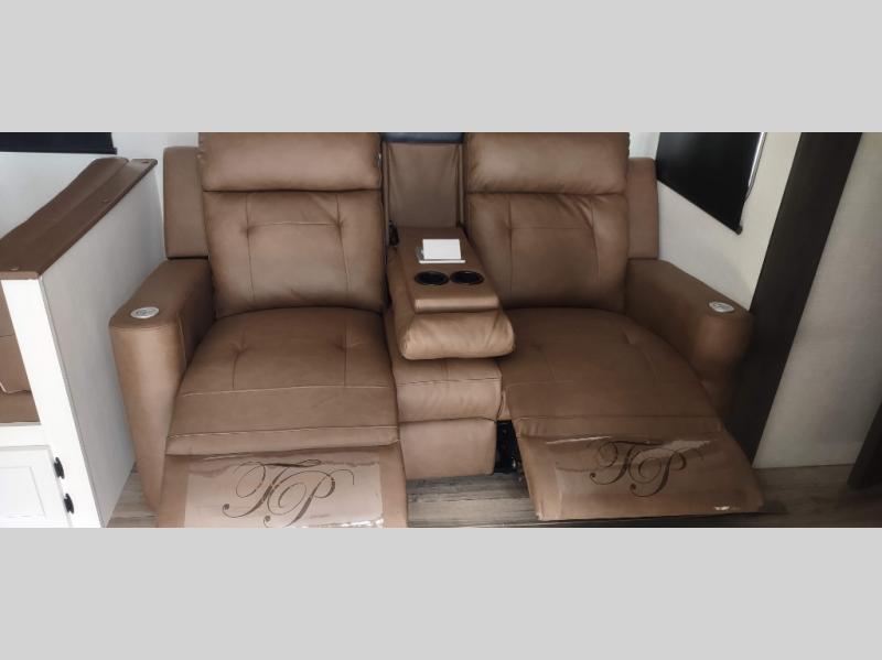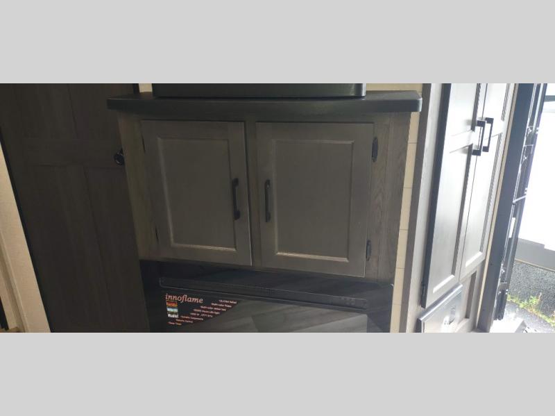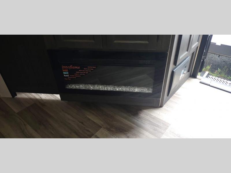 The living space features the 70" sofa (convertible for sleeping), a Sit N’ Slide table with flip-side reversible cushions, and an entertainment center with room for a large TV and fireplace. Whether it's movie night or game day, this trailer delivers comfort and good vibes.