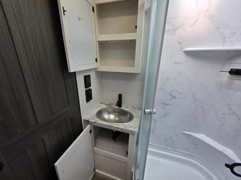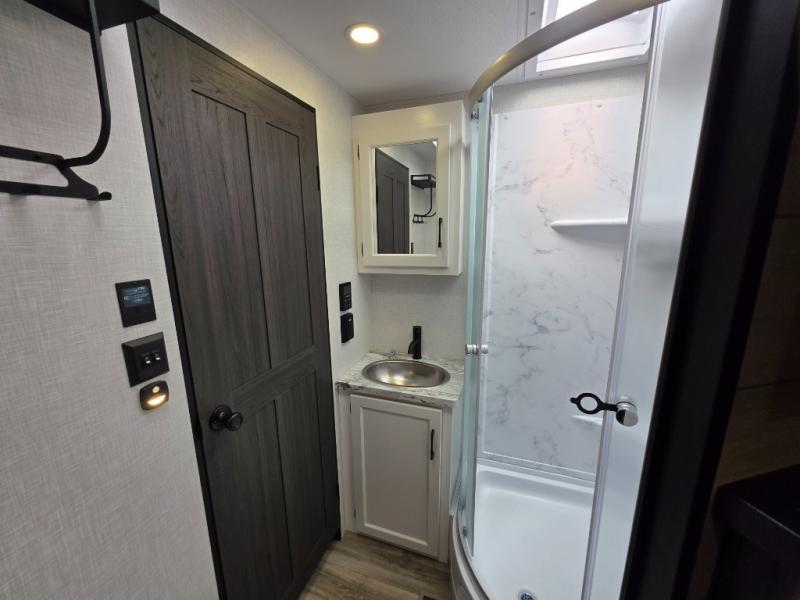 The full bathroom includes a 30" x 36" residential shower with curved glass doors and skylight, a mirrored medicine cabinet, vanity sink with storage, and foot-flush toilet. Its side-aisle design provides added privacy without disrupting the flow of the main living space.