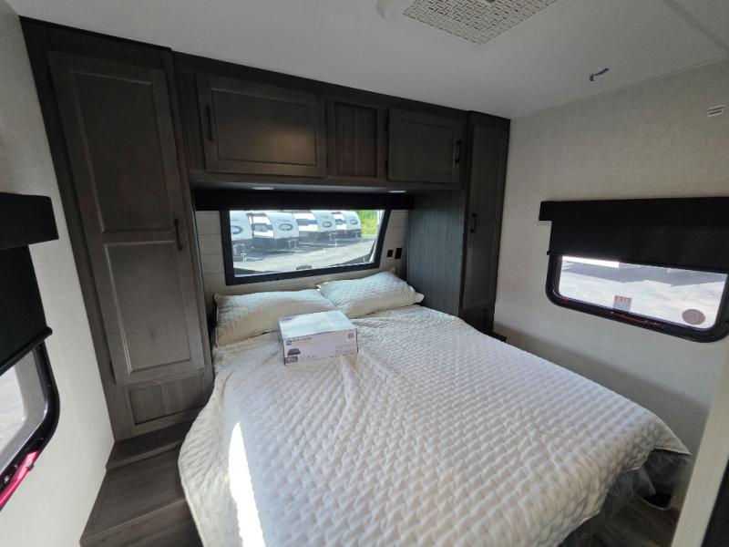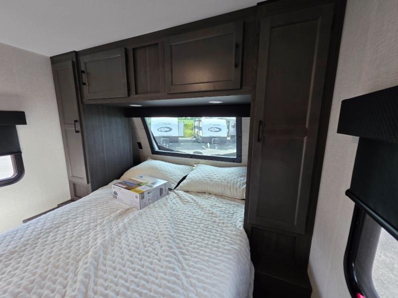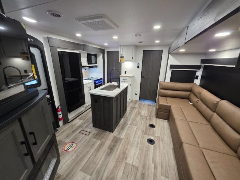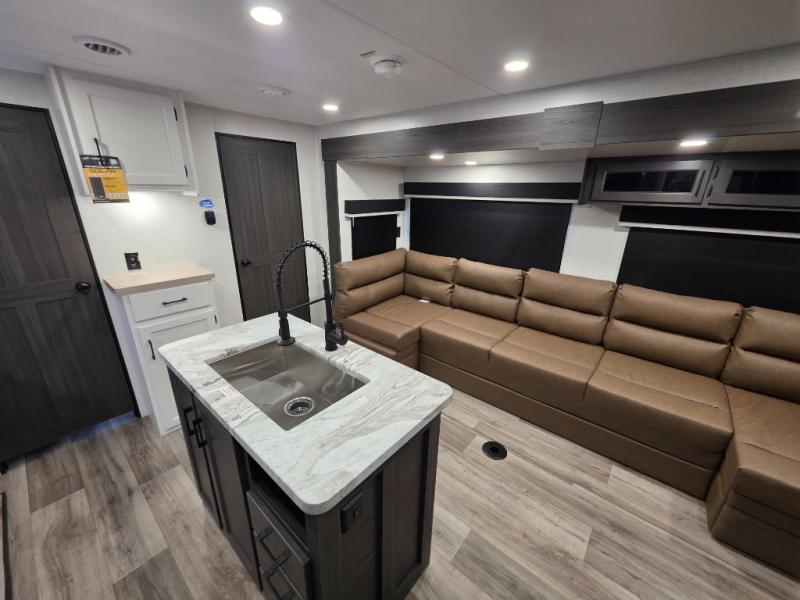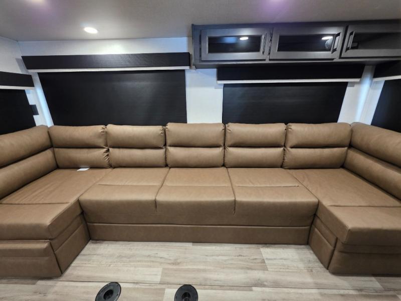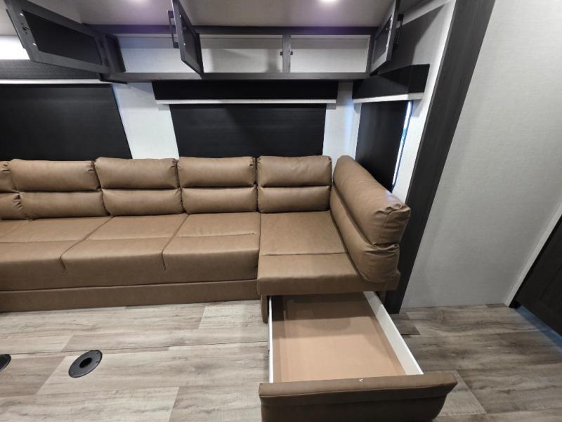 The heart of the RV is your open-concept living space with a 70" jackknife sofa, sit-n-slide table with benches, panoramic windows, and a cozy electric fireplace under the entertainment center. Whether it's a family movie night or a place to lounge on a rainy day, this space delivers ultimate comfort.
