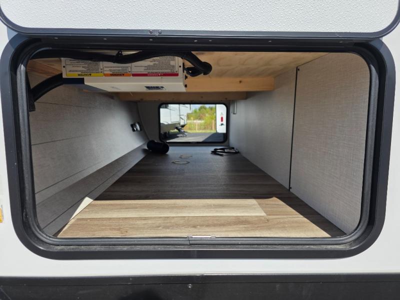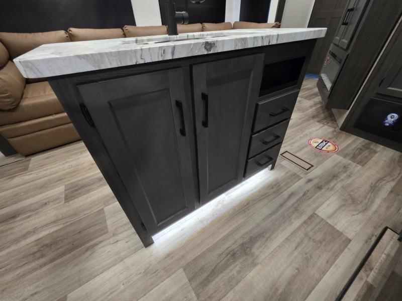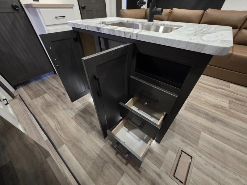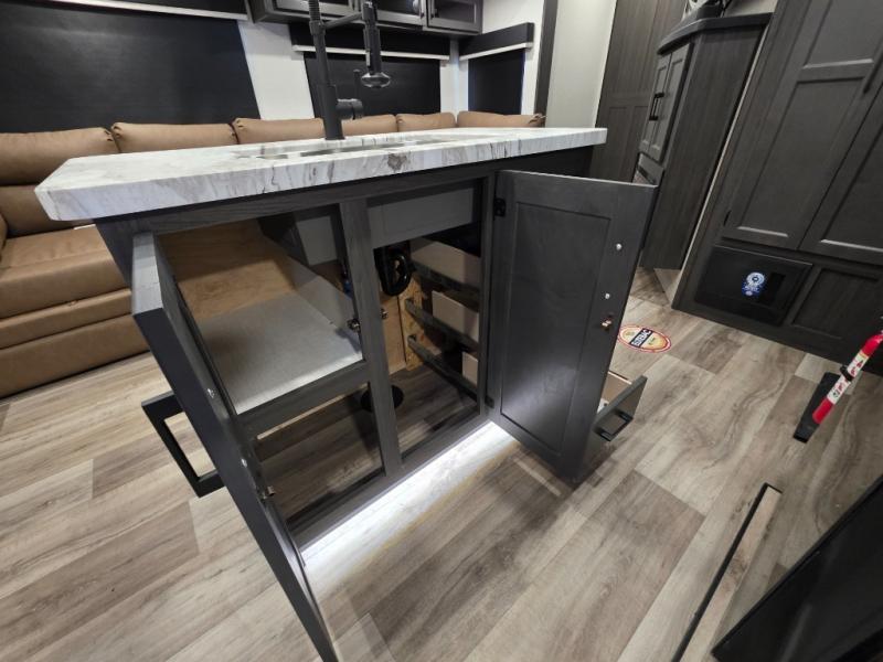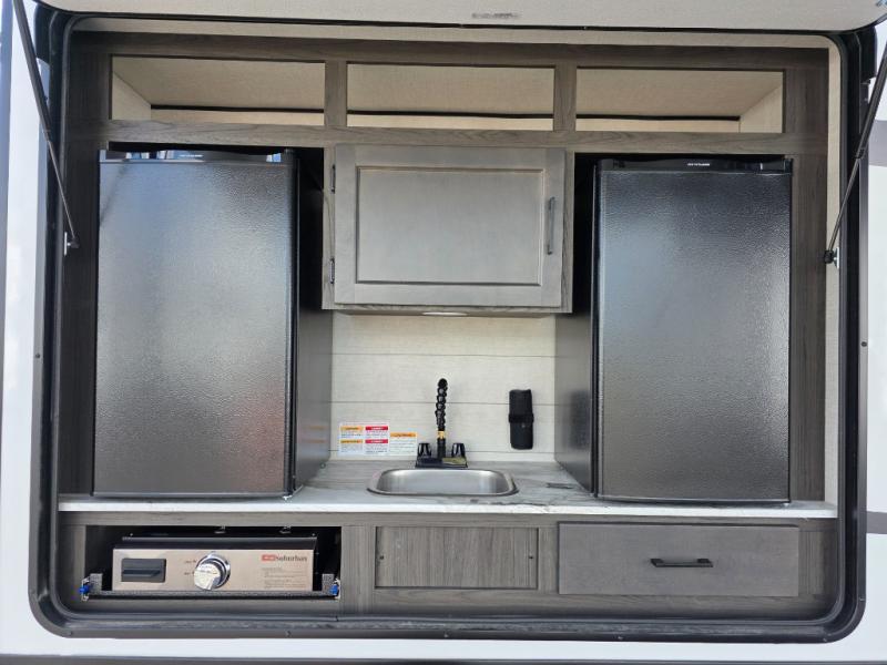 Extend your living space outdoors with the 20' power awning with LED lighting and the Campfire Café. This exterior kitchen includes a griddle, two refrigerators, and a pull-out sink—perfect for tailgating or cooking under the stars. The 2" accessory hitch and large pass-through storage mean you can bring all your gear.