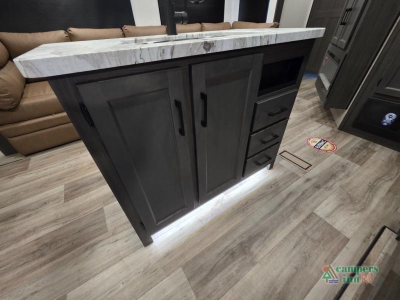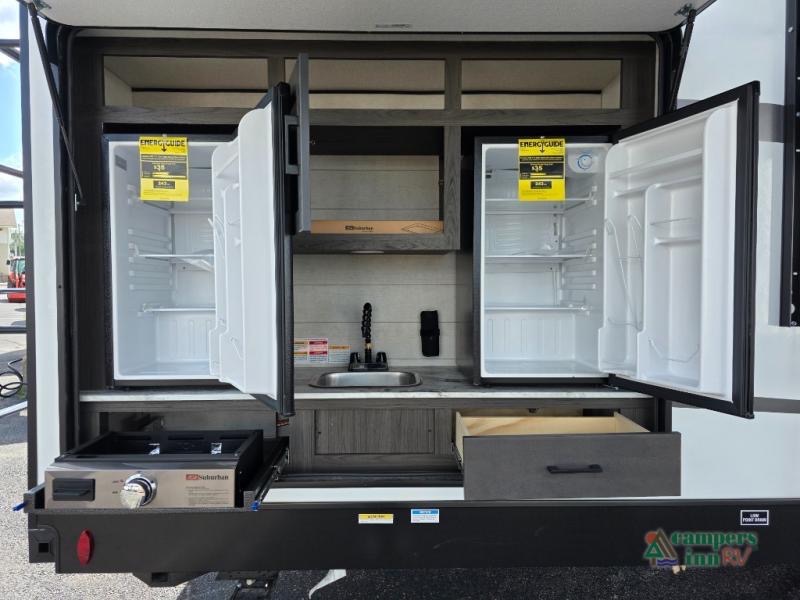 It's a clean decision with a bath and a half to take this travel trailer on your next camping trip! The rear private bunkhouse is decked out with a 28" x 70" bunk bed, a 32" x 70" top bunk, a 28" x 73" flip-up bunk above a 72" sofa with table, and a flip desk to do some school work. The half bathroom has an entry/exit door so you can get back to cooking at the outdoor campfire café which has two outdoor 3 cu. ft. refrigerators, a sink, griddle, and storage. Your clean up will be a breeze thanks to the kitchen island with a large sink and dish drying rack. If you need extra sleeping space then simply convert the 70" sofa at night. There is also a Sit N' Slide table with flipside reversible cushions. Those staying in the front private bedroom will enjoy a good night's rest on the Sleep Tight queen bed and have the convenience of accessing the dual entry bathroom!