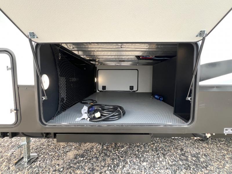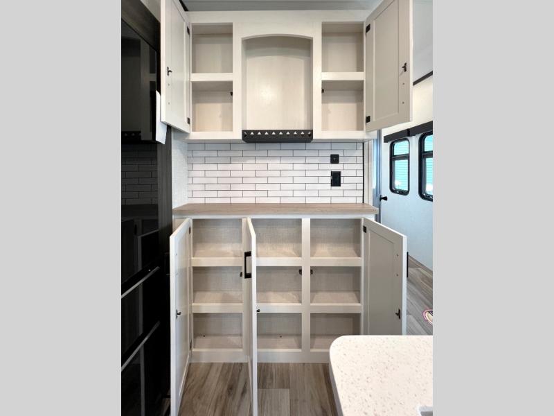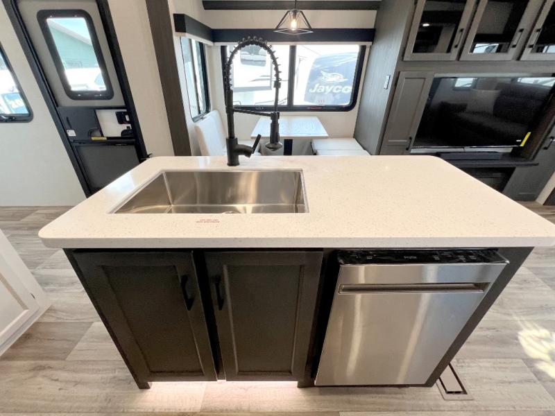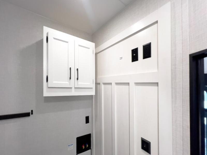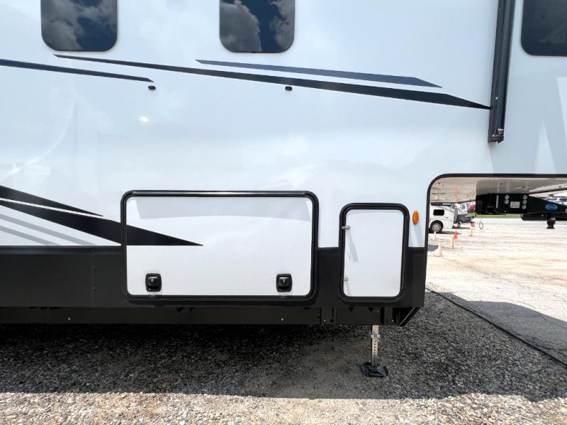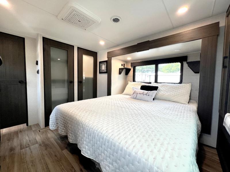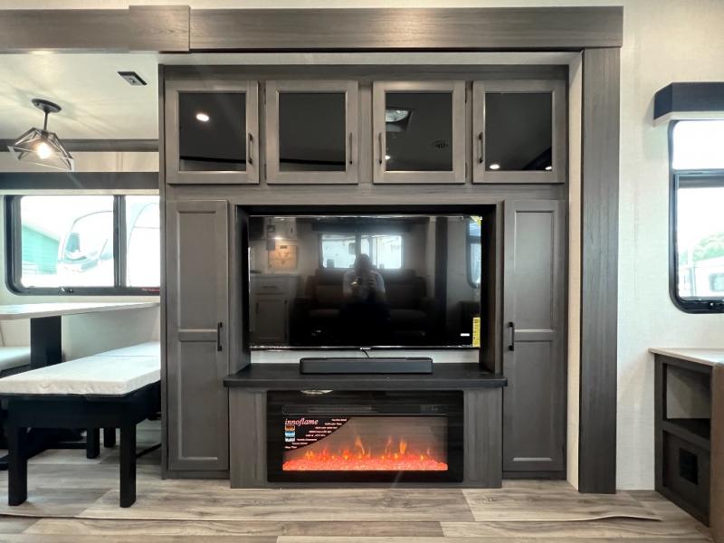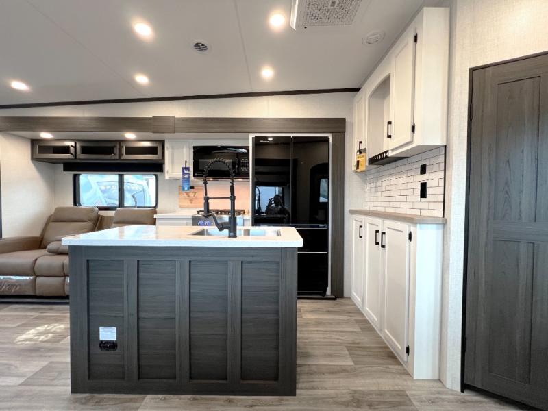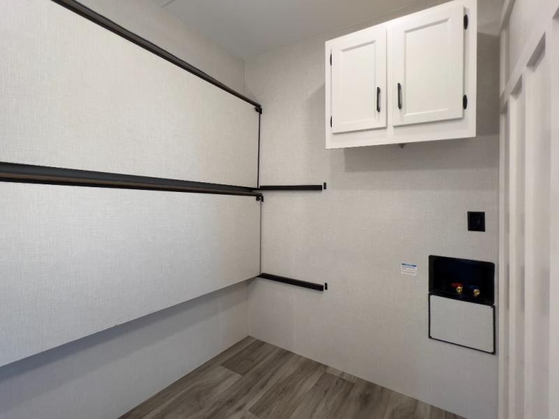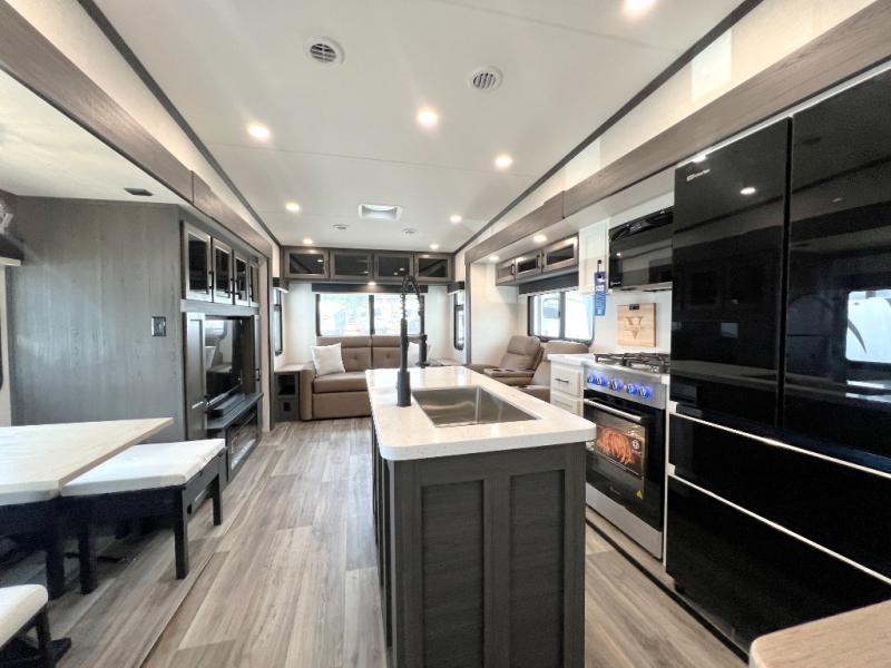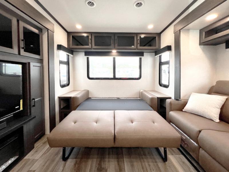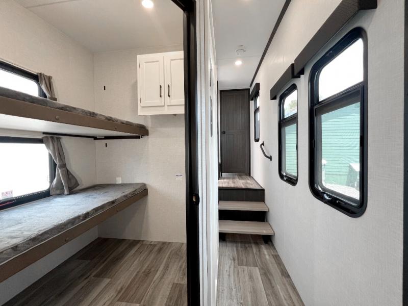 Luxury is found throughout this fifth wheel, so come take a look! The combined living area and kitchen is made spacious by the dual opposing slides, and your crew will enjoy relaxing on the theater seating, rear tri-fold sofa, plus the table with chairs. The chef of your group will love having extra counter space provided by the kitchen island, and the dishwasher is icing on top! Head to the middle bunkhouse which could also be used as an office or den, making it the perfect flex room. There is also washer and dryer prep here for the option to add these appliances. And you're sure to enjoy your own space in the front bedroom. Here, you'll find a front window seat with closets on either side, a dresser, and even more storage space!