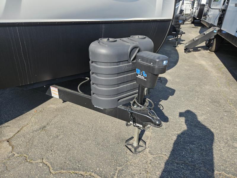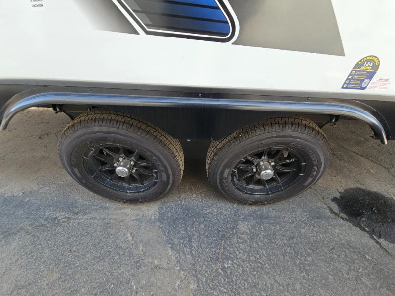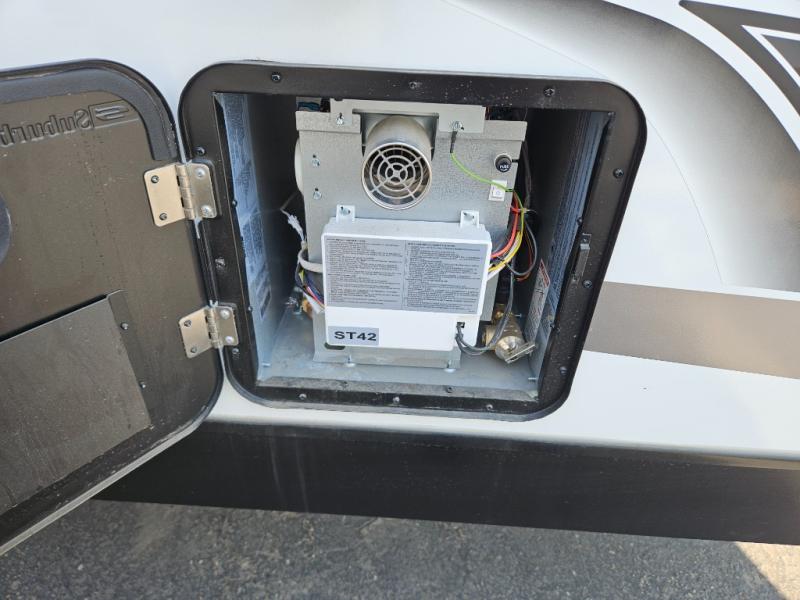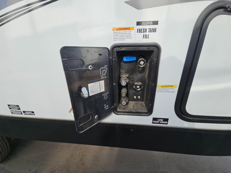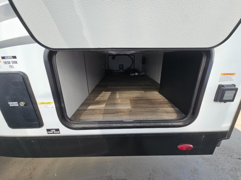 A front kitchen in this travel trailer provides more interior space! Once you have prepared your best meals with the Furrion oven and three burner cooktop, you can head to the Sit N' Slide table with flipside reversible cushions to dine. The 70" sofa also offers a comfortable place to take an afternoon nap or sit while enjoying the entertainment center with a frameless electric fireplace and 40" TV on a swing arm. A dual entry bathroom makes it easy for all to enter and has a 34" radius shower to freshen up in each morning. The rear private bedroom has a Sleep Tight queen bed for a good night's rest, wardrobes on either side of it, and an entrance into the bathroom too!