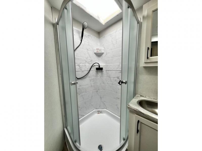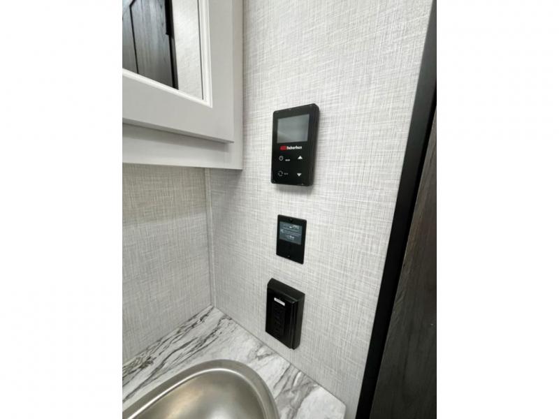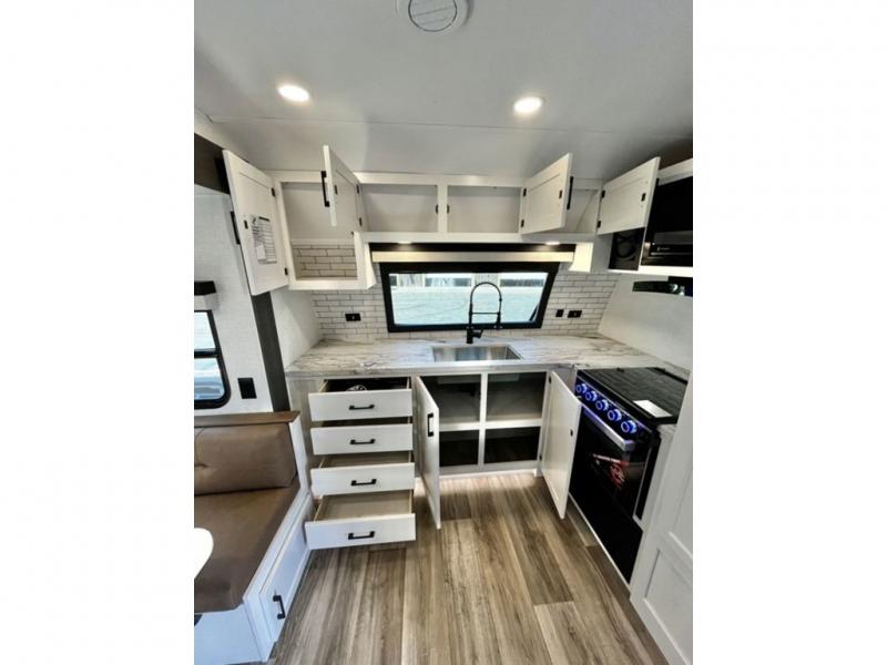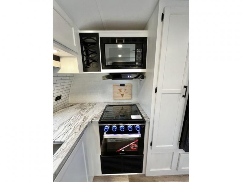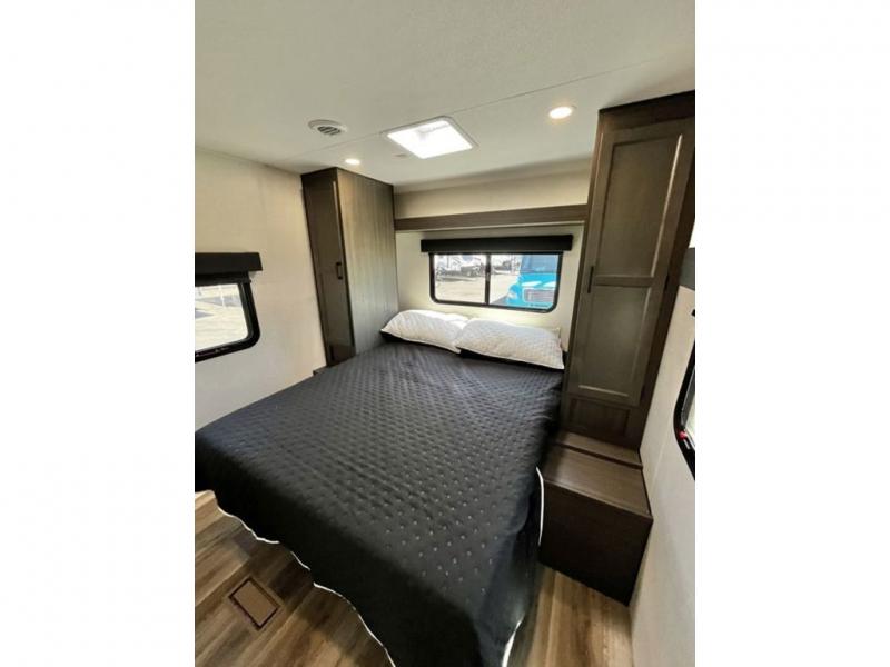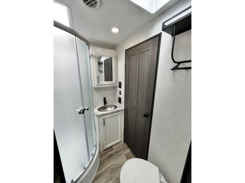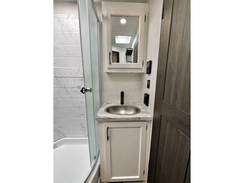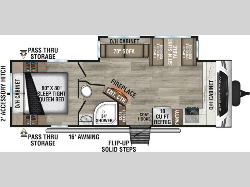 Every Venture RV SportTrek lightweight travel trailer is constructed to offer peace of mind and the comforts of home! Their purposeful residential kitchens are packed with handy features like a Furrion oven and three burner cooktop, a large stainless steel sink with a cover and dish drying rack, plus a 12V refrigerator. You will find plenty of storage throughout, including Safe-Tek hidden storage with a charging center and StorMore nightstands on either side of the bed behind the full-length closets. And the magnetic slam-latch baggage doors and spacious pass-through storage area will hold your outdoor gear in place. They even come with a hot and cold exterior shower and SporTrek's Weather Shield which includes a forced air heated and enclosed underbelly, radiant foil insulation wrapped tanks, and more features that will let you extend your camping season. You will also love the new residential upgraded furniture, Serta memory foam mattress, barn style passage doors, and many more comforts!