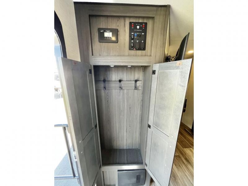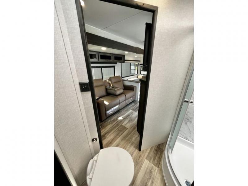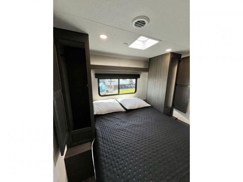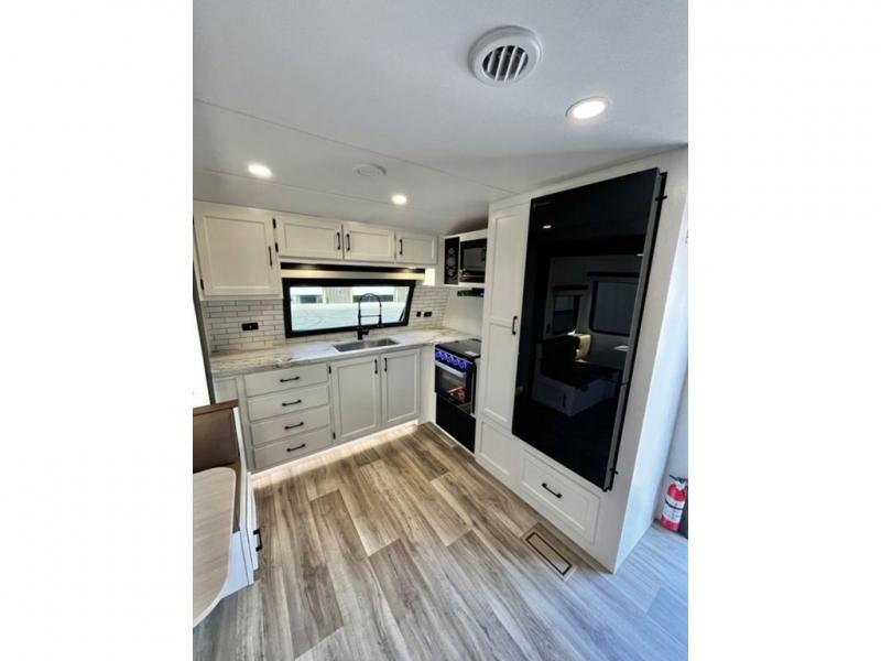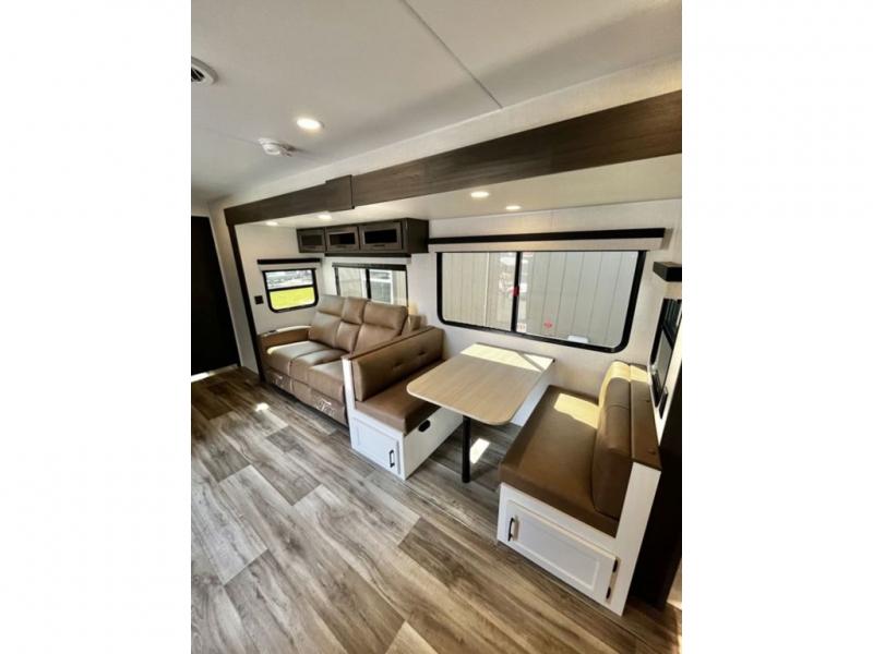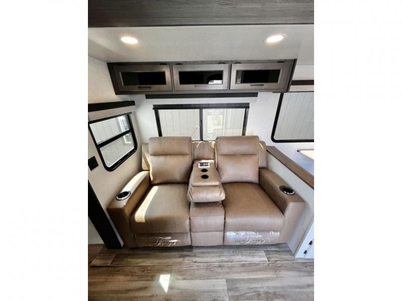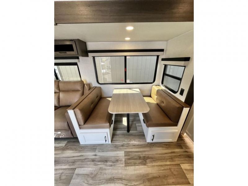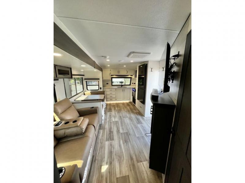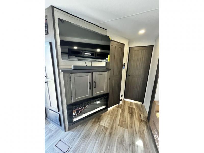A front kitchen in this travel trailer provides more interior space! Once you have prepared your best meals with the Furrion oven and three burner cooktop, you can head to the Sit N' Slide table with flipside reversible cushions to dine. The 70" sofa also offers a comfortable place to take an afternoon nap or sit while enjoying the entertainment center with a frameless electric fireplace and 40" TV on a swing arm. A dual entry bathroom makes it easy for all to enter and has a 34" radius shower to freshen up in each morning. The rear private bedroom has a Sleep Tight queen bed for a good night's rest, wardrobes on either side of it, and an entrance into the bathroom too!