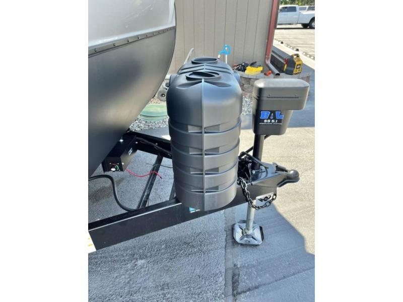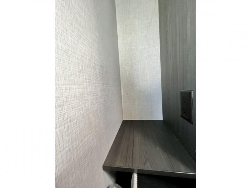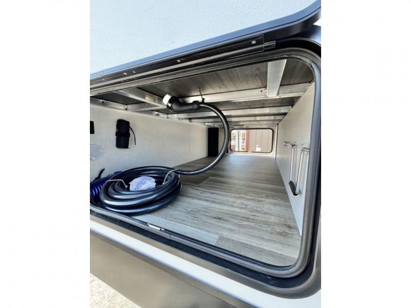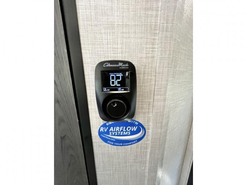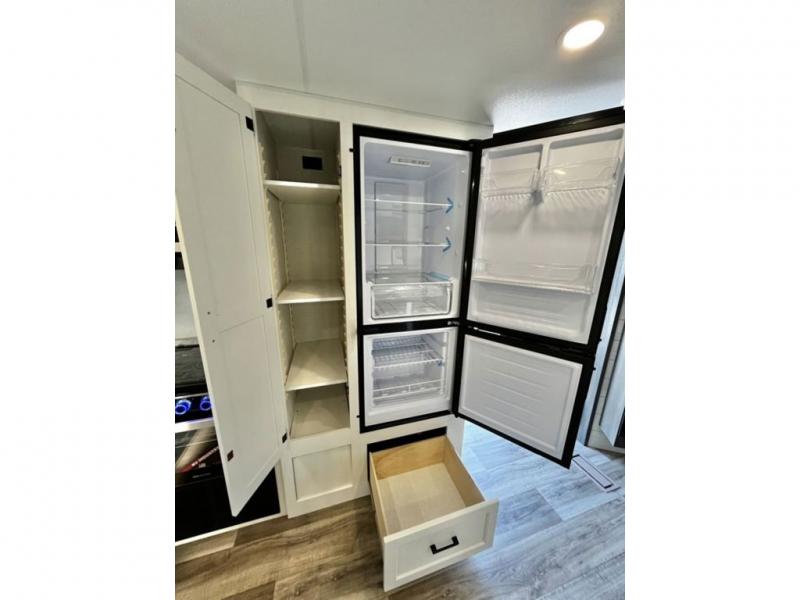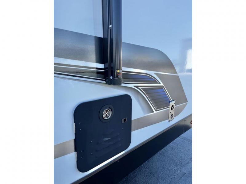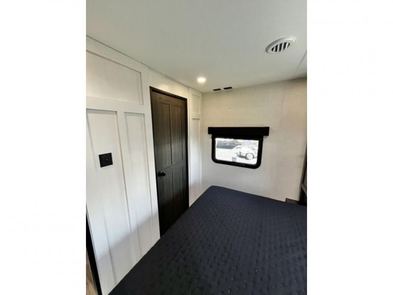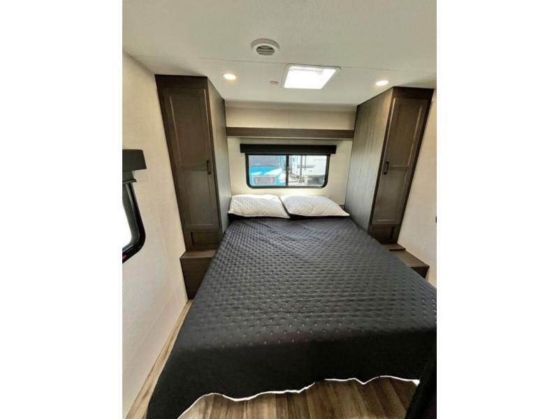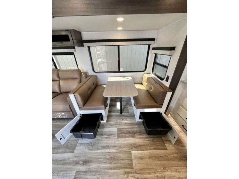 A front kitchen in this travel trailer provides more interior space! Once you have prepared your best meals with the Furrion oven and three burner cooktop, you can head to the Sit N' Slide table with flipside reversible cushions to dine. The 70" sofa also offers a comfortable place to take an afternoon nap or sit while enjoying the entertainment center with a frameless electric fireplace and 40" TV on a swing arm. A dual entry bathroom makes it easy for all to enter and has a 34" radius shower to freshen up in each morning. The rear private bedroom has a Sleep Tight queen bed for a good night's rest, wardrobes on either side of it, and an entrance into the bathroom too!