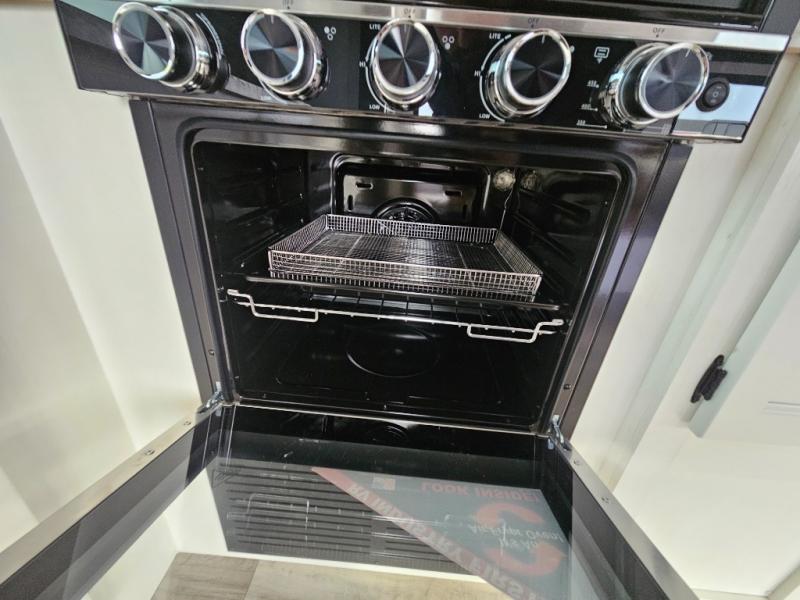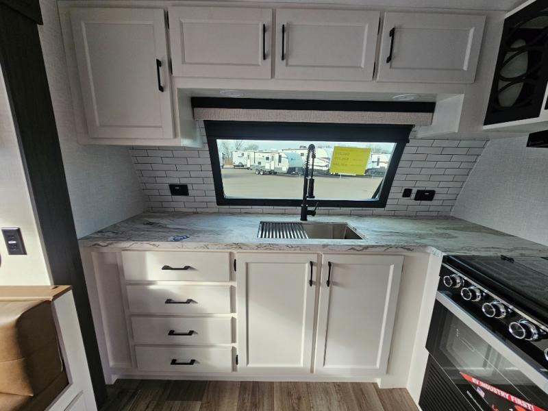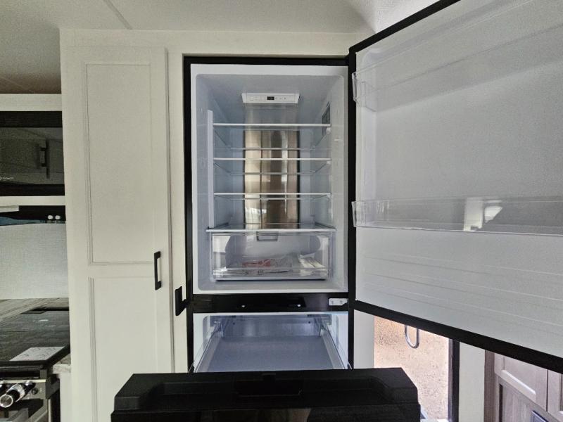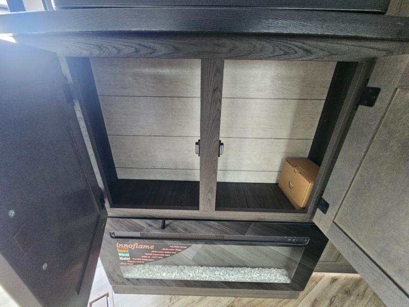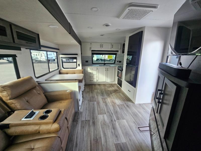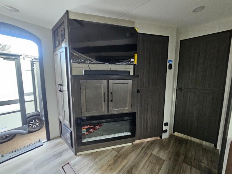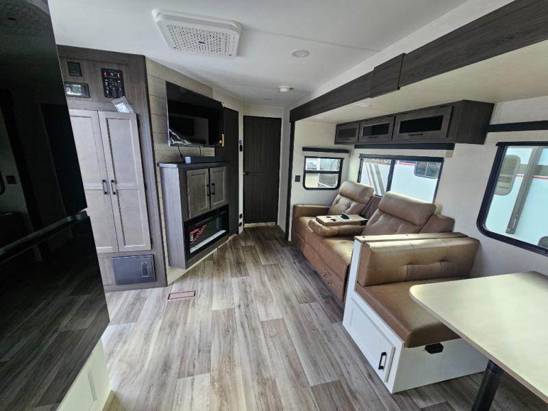 A front kitchen in this travel trailer provides more interior space! Once you have prepared your best meals with the Furrion oven and three burner cooktop, you can head to the Sit N' Slide table with flipside reversible cushions to dine. The 70" sofa also offers a comfortable place to take an afternoon nap or sit while enjoying the entertainment center with a frameless electric fireplace and 40" TV on a swing arm. A dual entry bathroom makes it easy for all to enter and has a 34" radius shower to freshen up in each morning. The rear private bedroom has a Sleep Tight queen bed for a good night's rest, wardrobes on either side of it, and an entrance into the bathroom too!