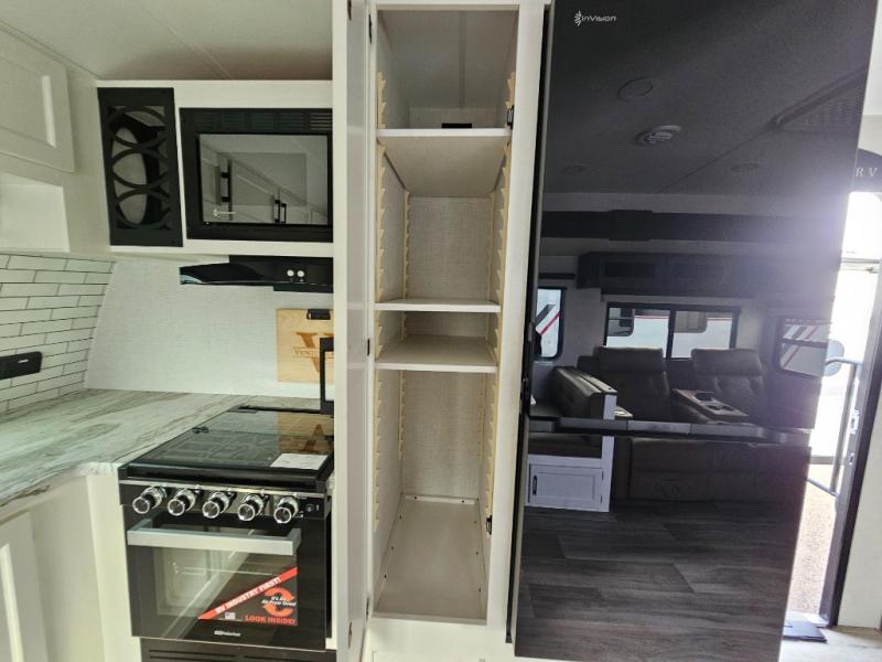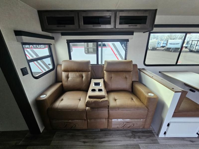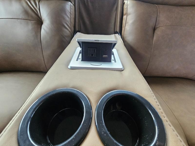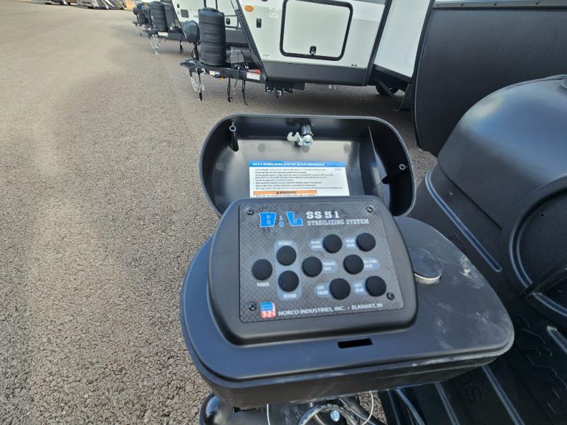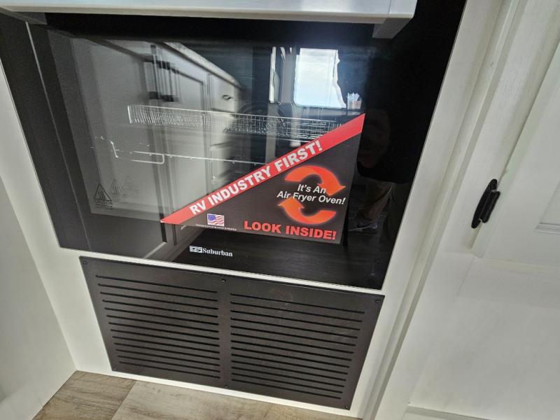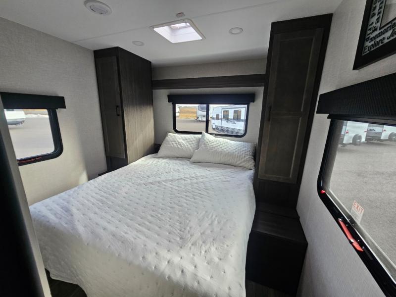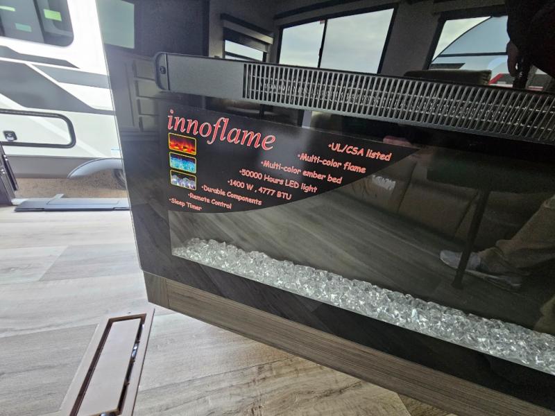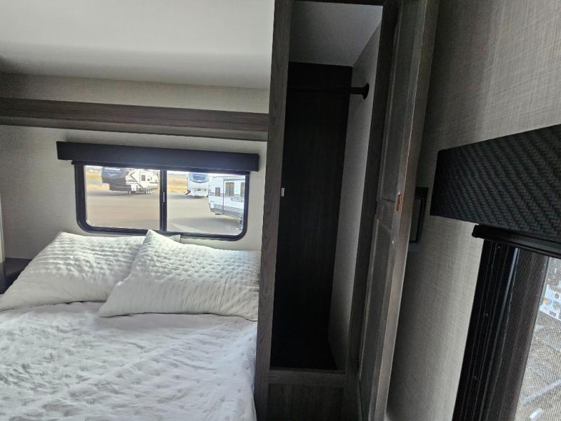 A front kitchen in this travel trailer provides more interior space! Once you have prepared your best meals with the Furrion oven and three burner cooktop, you can head to the Sit N' Slide table with flipside reversible cushions to dine. The 70" sofa also offers a comfortable place to take an afternoon nap or sit while enjoying the entertainment center with a frameless electric fireplace and 40" TV on a swing arm. A dual entry bathroom makes it easy for all to enter and has a 34" radius shower to freshen up in each morning. The rear private bedroom has a Sleep Tight queen bed for a good night's rest, wardrobes on either side of it, and an entrance into the bathroom too!