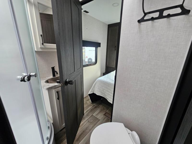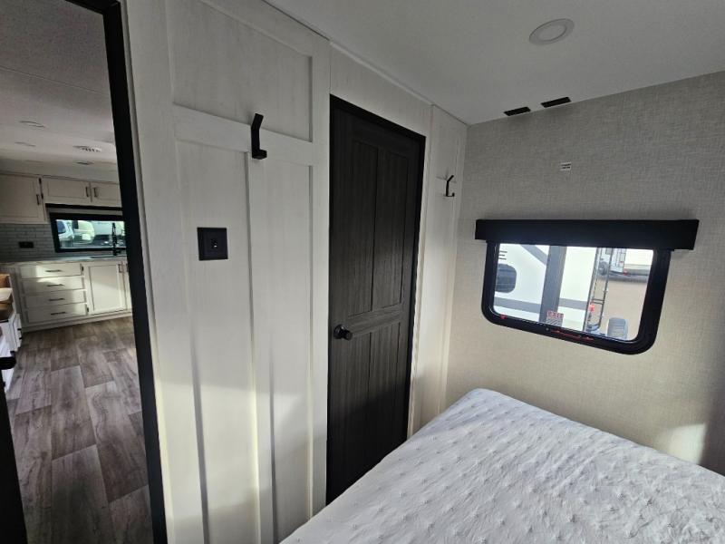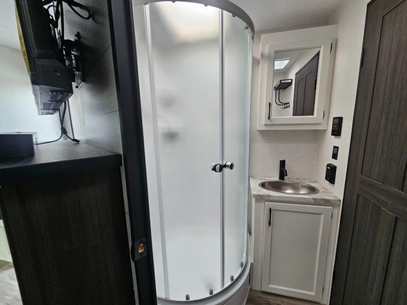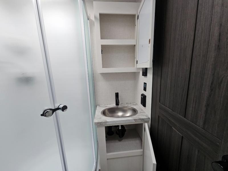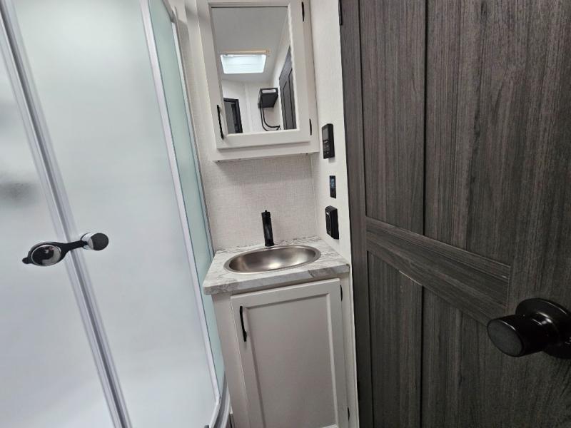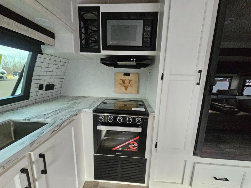 Every Venture RV SportTrek lightweight travel trailer is constructed to offer peace of mind and the comforts of home! Their purposeful residential kitchens are packed with handy features like a Furrion oven and three burner cooktop, a large stainless steel sink with a cover and dish drying rack, plus a 12V refrigerator. You will find plenty of storage throughout, including Safe-Tek hidden storage with a charging center and StorMore nightstands on either side of the bed behind the full-length closets. And the magnetic slam-latch baggage doors and spacious pass-through storage area will hold your outdoor gear in place. They even come with a hot and cold exterior shower and SporTrek's Weather Shield which includes a forced air heated and enclosed underbelly, radiant foil insulation wrapped tanks, and more features that will let you extend your camping season. You will also love the new residential upgraded furniture, Serta memory foam mattress, barn style passage doors, and many more comforts!