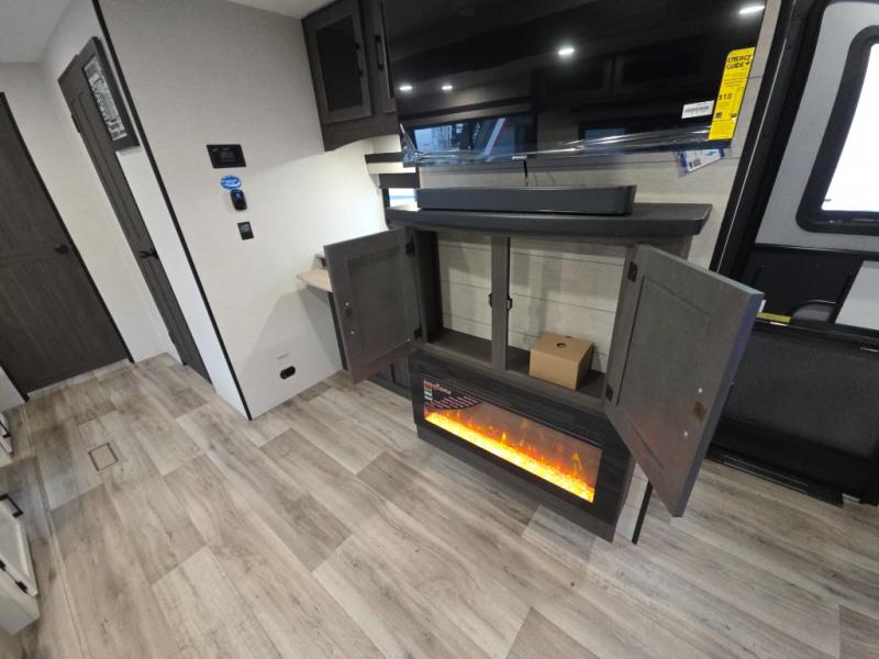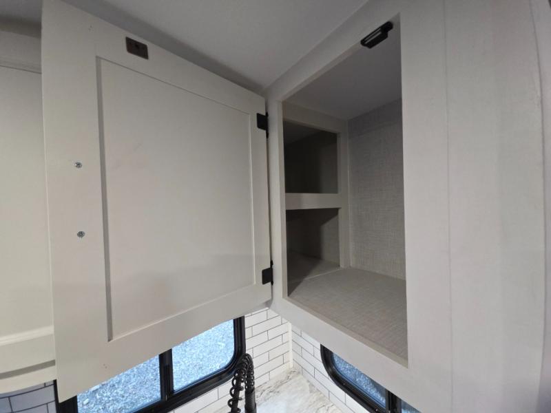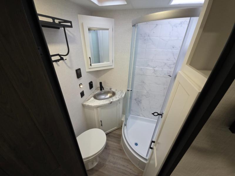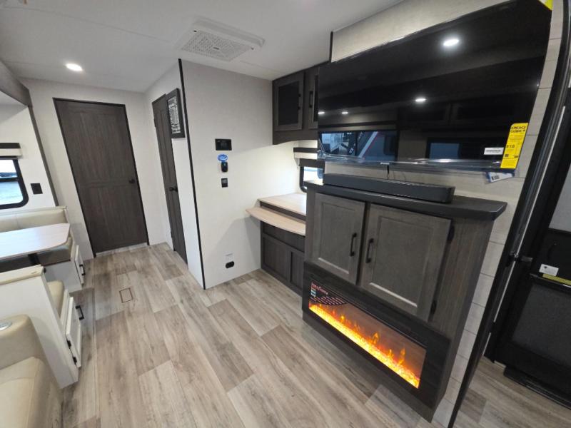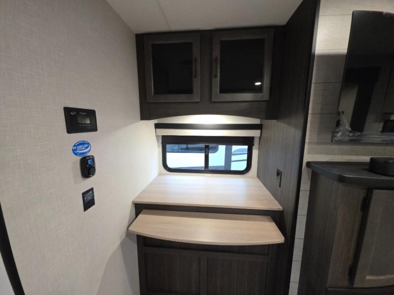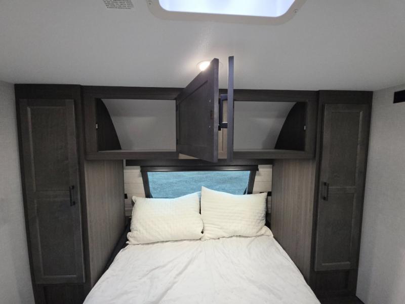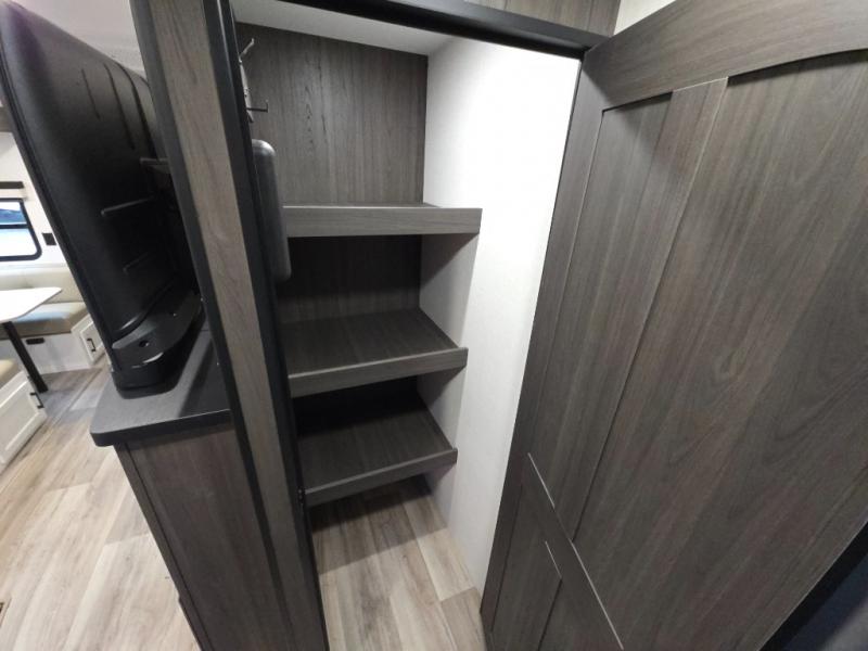 The chef will love the open rear kitchen area of this travel trailer! The 10 cu. ft. 12V refrigerator is big enough to hold your perishables and the flip countertop area is the perfect place for a coffee bar. You can even cook outside with the campfire café that has a refrigerator, a sink, and a griddle to grill some burgers while breathing in fresh air. Just be sure to grab your coat hanging on the coat hooks in the walk-in pantry before heading out the door. A 70" sofa and Sit N' Slide table adds more interior space, as well as comfortable places to eat, relax, and even sleep once converted. Everyone can freshen up in the full bathroom with the 34" radius shower and even have their towel close by thanks to the linen closet next to it!